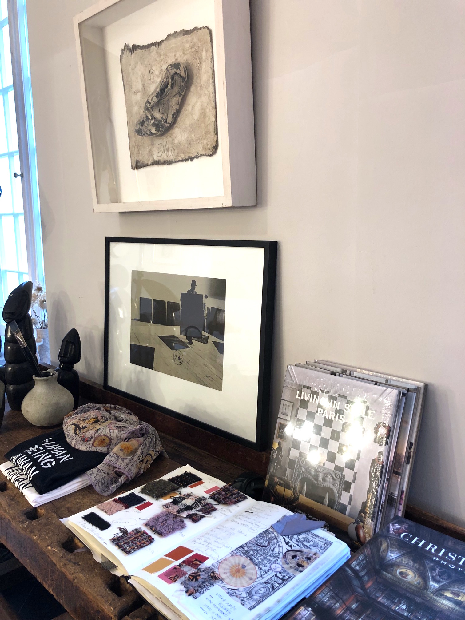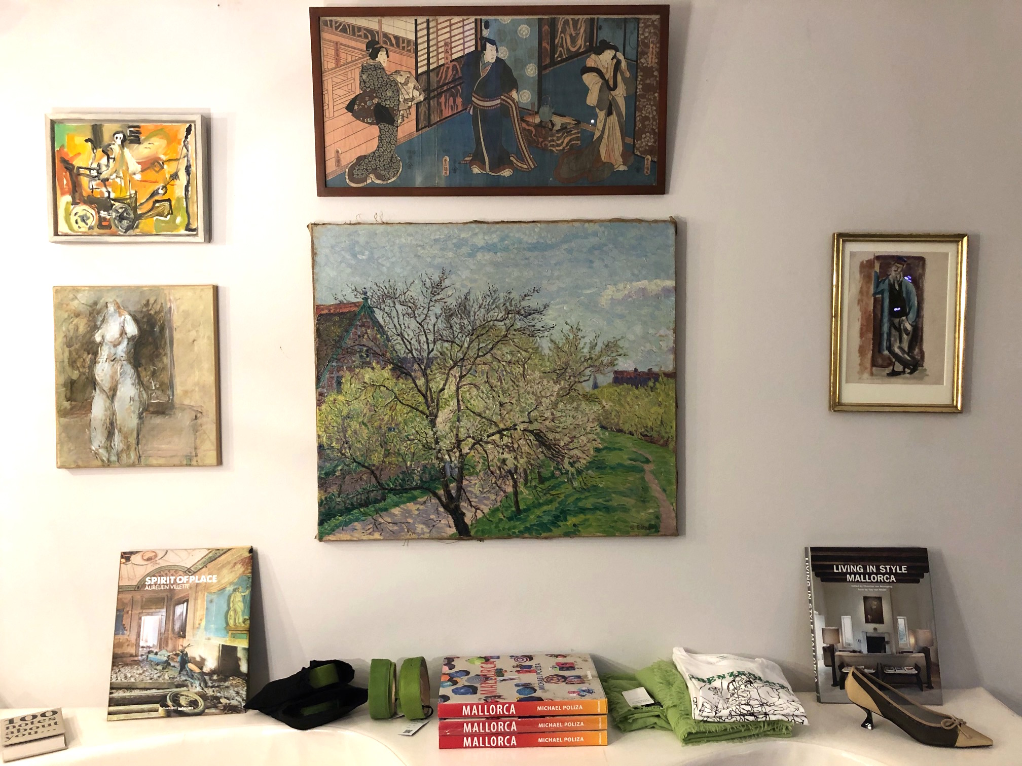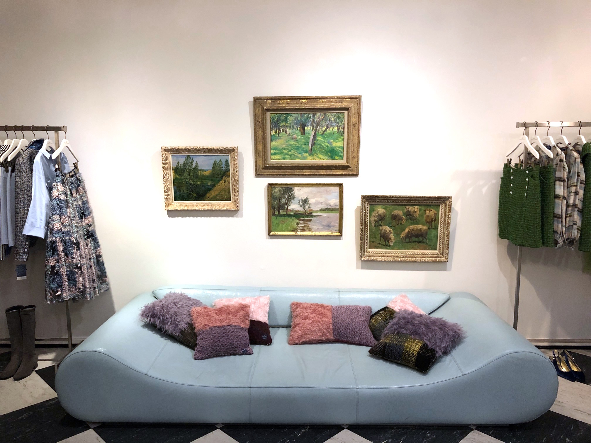 Die Zeit dazwischen bin ich allein mit meiner Menagerie aus Mode, Kunst und Interieur. Die Stunden sind innig reserviert für neue Dekorationen, neue Hängungen und Arrangements. Bilder wandern von einer Wand an die andere, bilden ungewohnte Dialoge: Die grünen Wiesen von Thomas Herbst (1848 – 1915) über dem wasserblauen Sofa von Fendi, das Aquarell von Wilhelm Grimm über der Kleiderstange mit Kopernikus Modellen, Joseph Beuys und Herbert Zwangs mit Shona Skulpturen aus Zimbabwe davor, dazwischen mein Skizzenbuch…