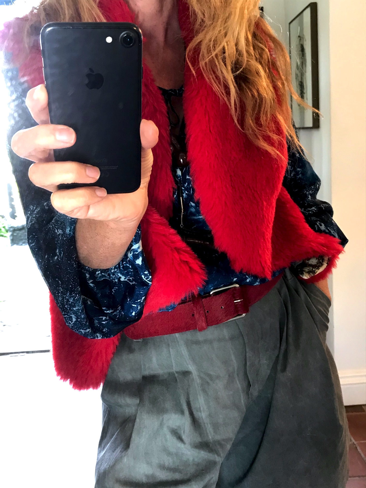 Abb. Kurze Hose grau (€ 398), Gürtel rot (€ 198), Waterscape Bluse (€ 398), Fellweste (Sonderpreis € 350).
