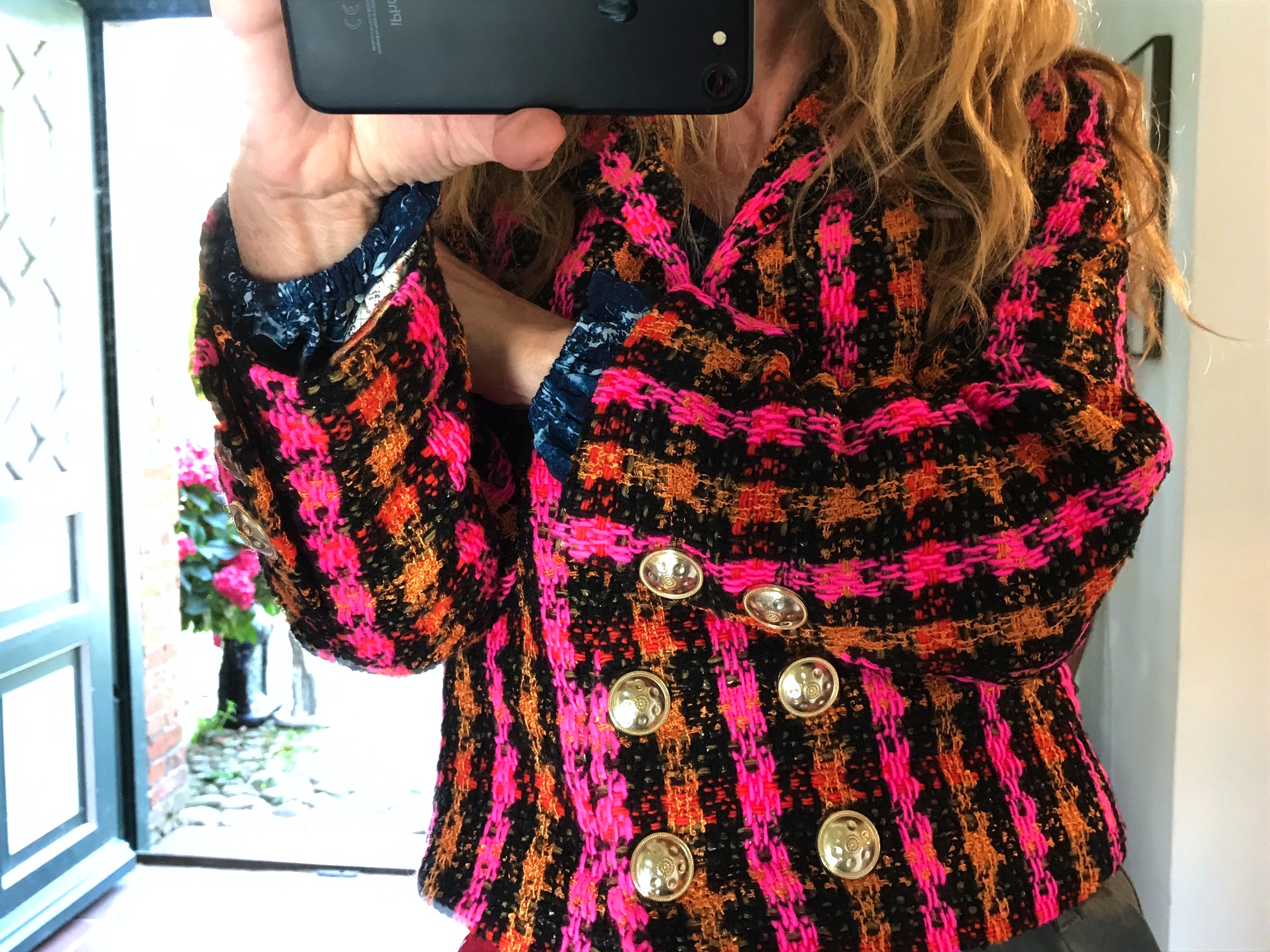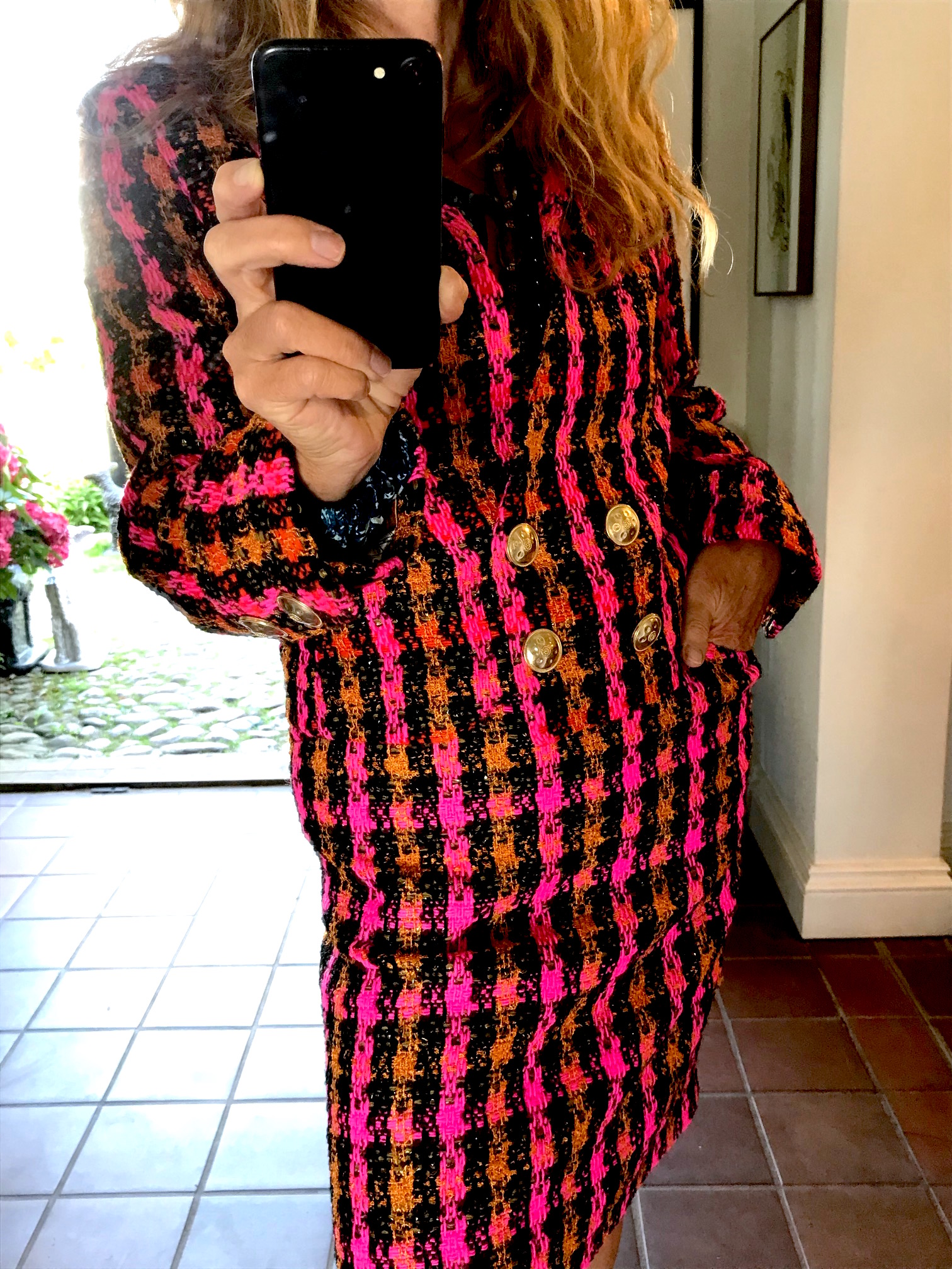 Abb: Doppelreiher Blazer Bouclé Pink, Futter Waterscape (€ 698)
