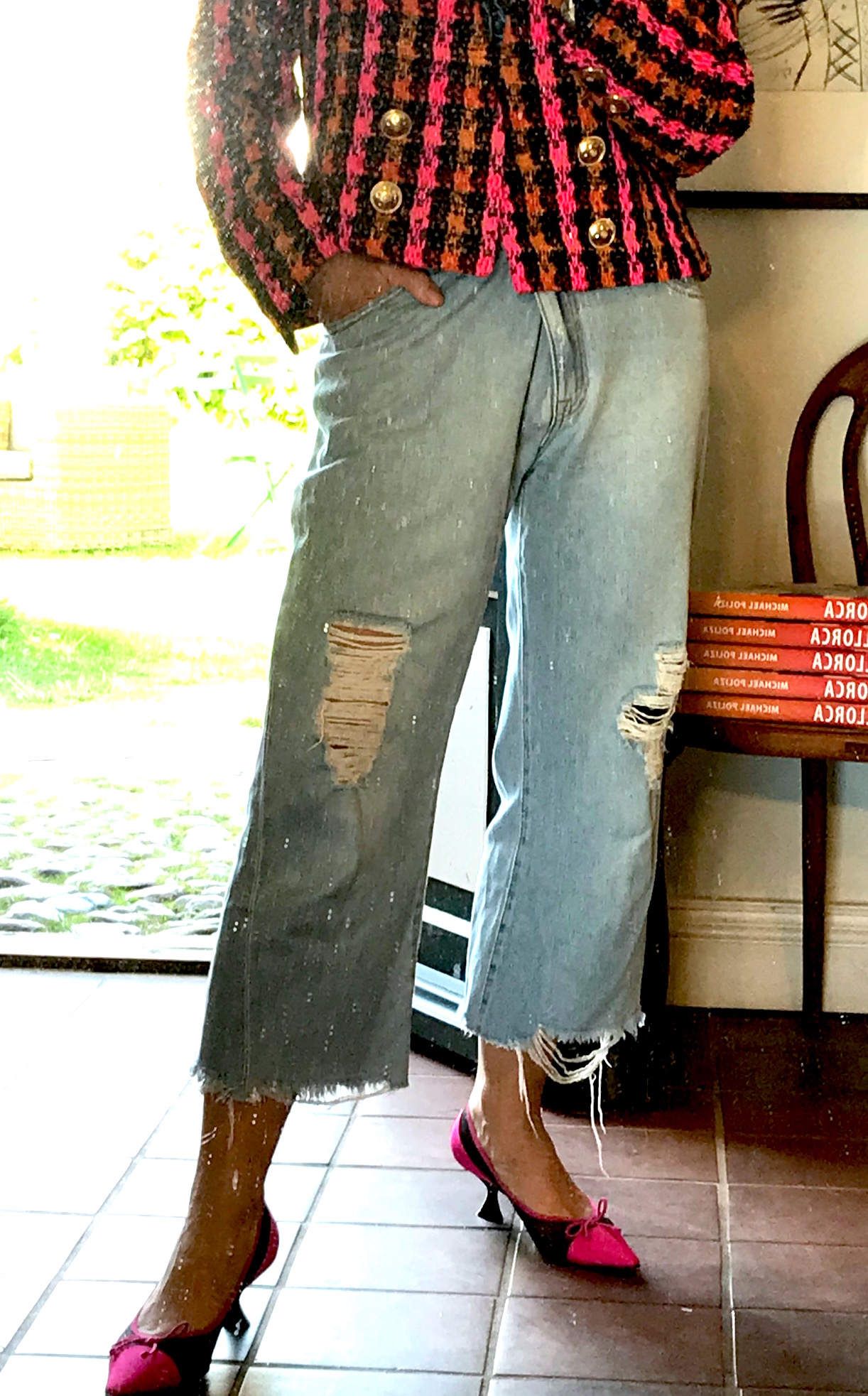 Und nun noch mal ganz anders, o.k., den pinken Doppelreiher mit einer Jeans. Das geht, klar. Sieht bestimmt gut aus, dafür muss ich nur kurz nach oben laufen.