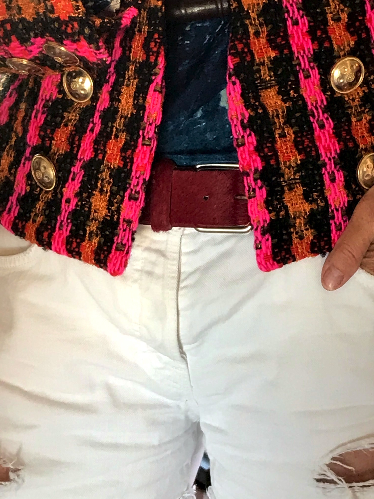 Oder soll ich mich noch mal umziehen, die Zeit ein wenig totschlagen mit einem Blazer, der heute früh aus dem Erzgebirge kam? Habe mir einen geschnappt in Größe S! Ich darf aber die Hose anbehalten? Ist zu umständlich, die auch noch zu wechseln.
