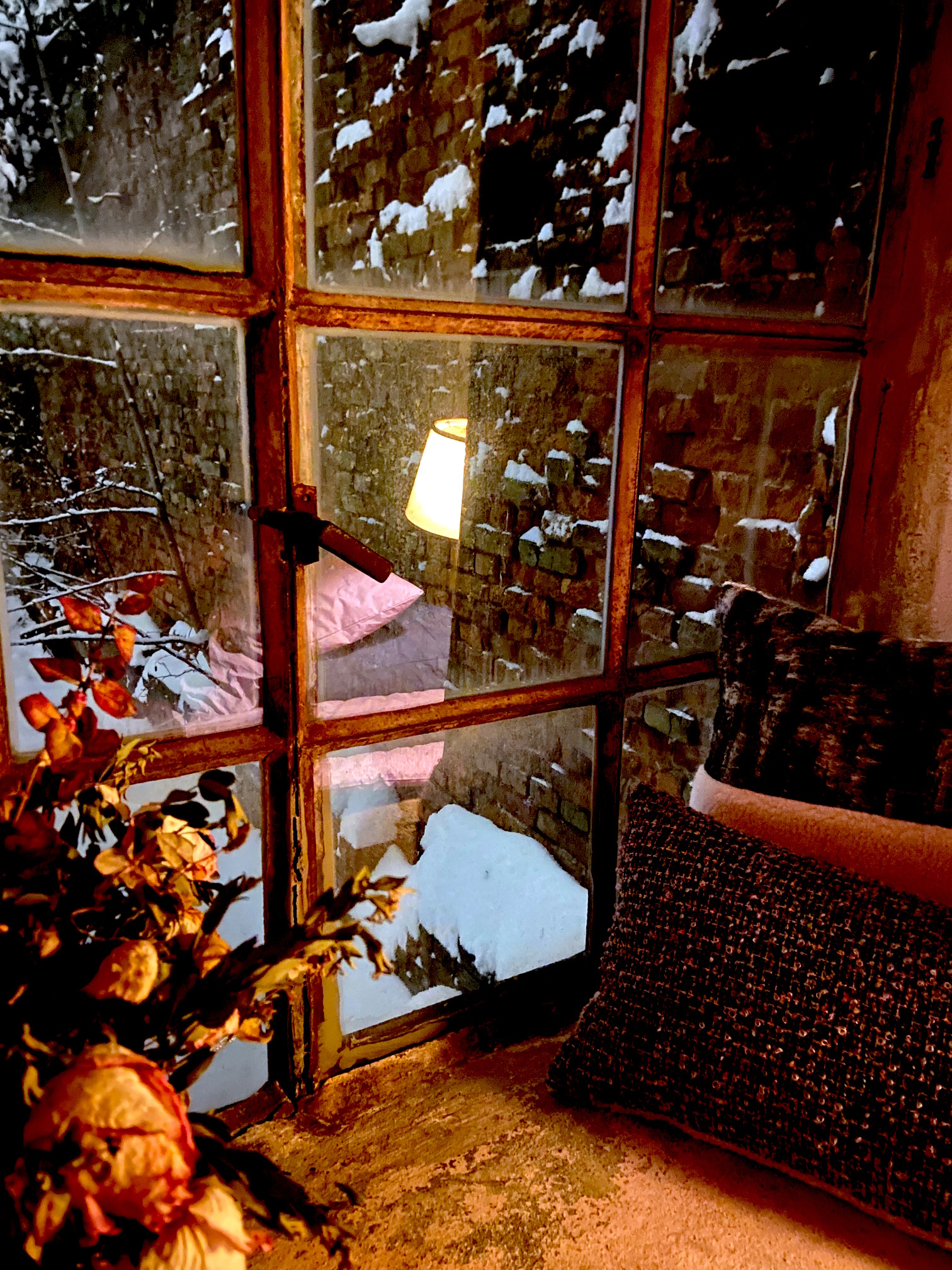 Der Tag war lang und vollgepackt mit kreativen Dingen, erst im Atelier und später in der Poolstrasse mit endlosen Gesprächen und Online Experimenten. Ich übe mich in der virtuellen Welt, doch daneben tastet mein Auge die außergewöhnliche Umgebung im Tempel von 1844 ab und saugt alles auf, was es an Farben und Formen um mich herum gibt. Es hat geschneit, es ist Nacht geworden.