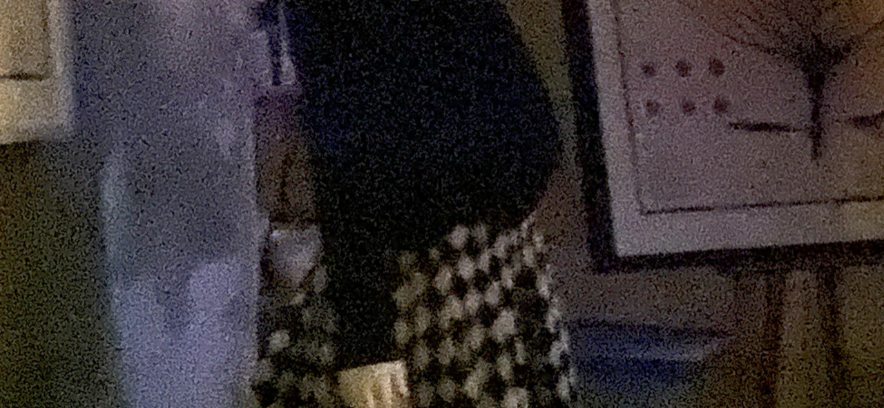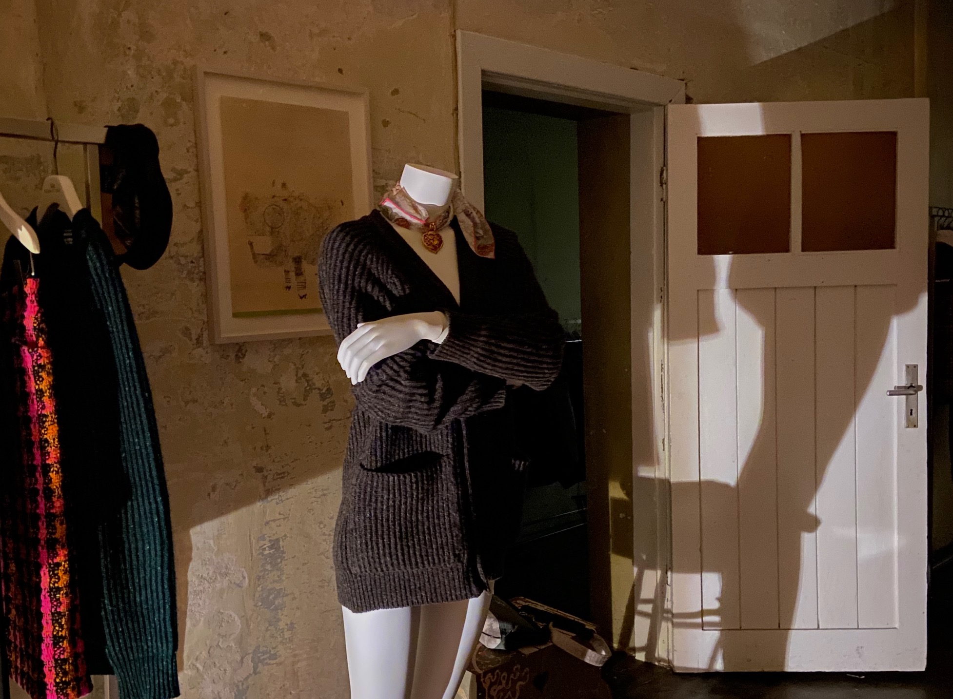Bin ich es dort im Schatten an der Tür oder ist es die Figurine mit der braunen Strickjacke hinter mir, dem kleinen gemalten Schränkchen davor, die Kleiderstange dahinter?