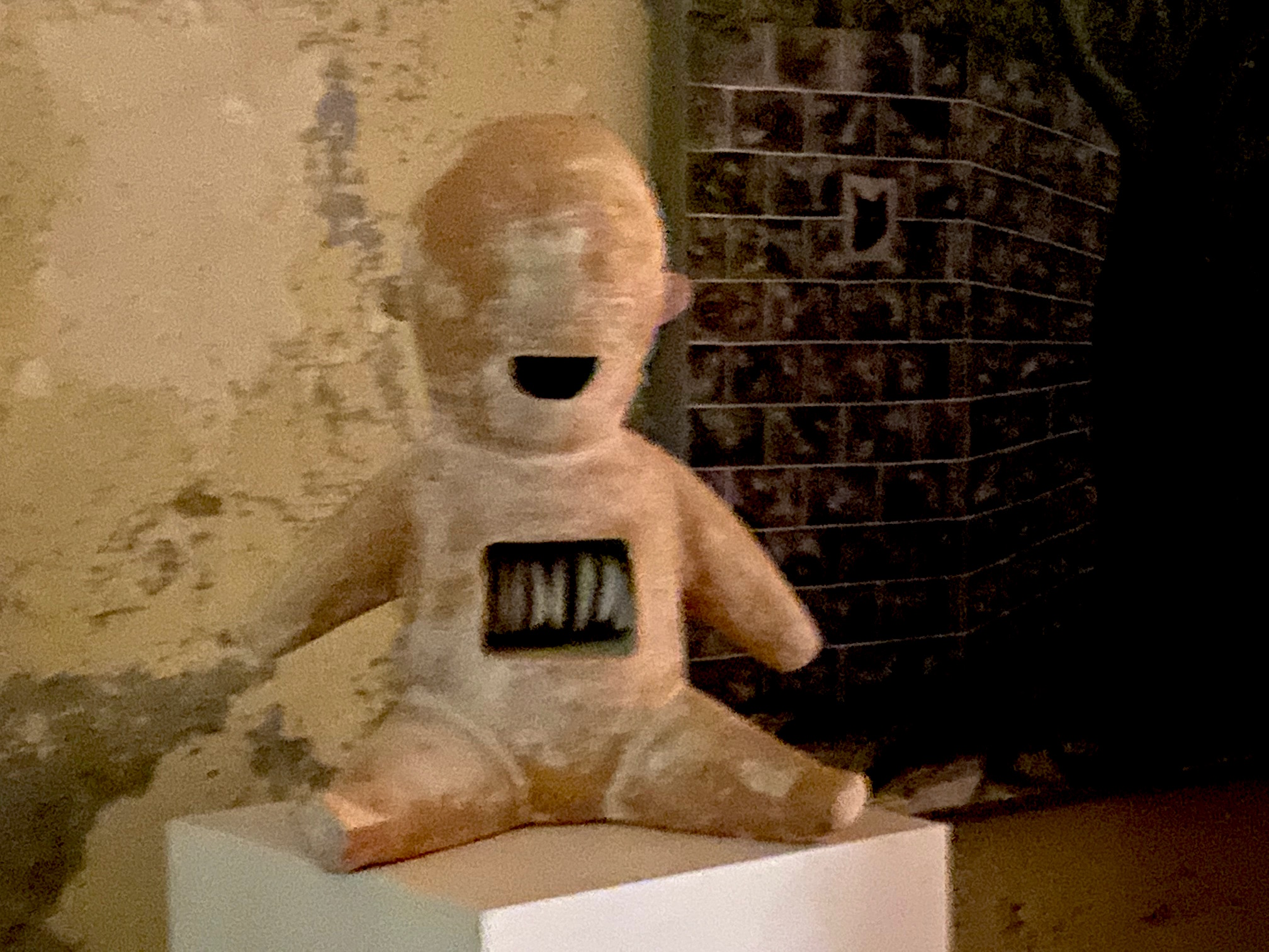 Manchmal verschwimmen die Konturen, bilden sich Unschärfen. Das Terrakotta “Baby” von Luca Lanzi, lacht es nun, brabbelt oder schreit? Oder ruft es gar zu mir herüber? Eine wunderschöne Arbeit des jungen Italieners, die noch auf einen Sammler oder eine Sammlerin wartet, dahinter das Gemälde von Helma mit dem Wolf.