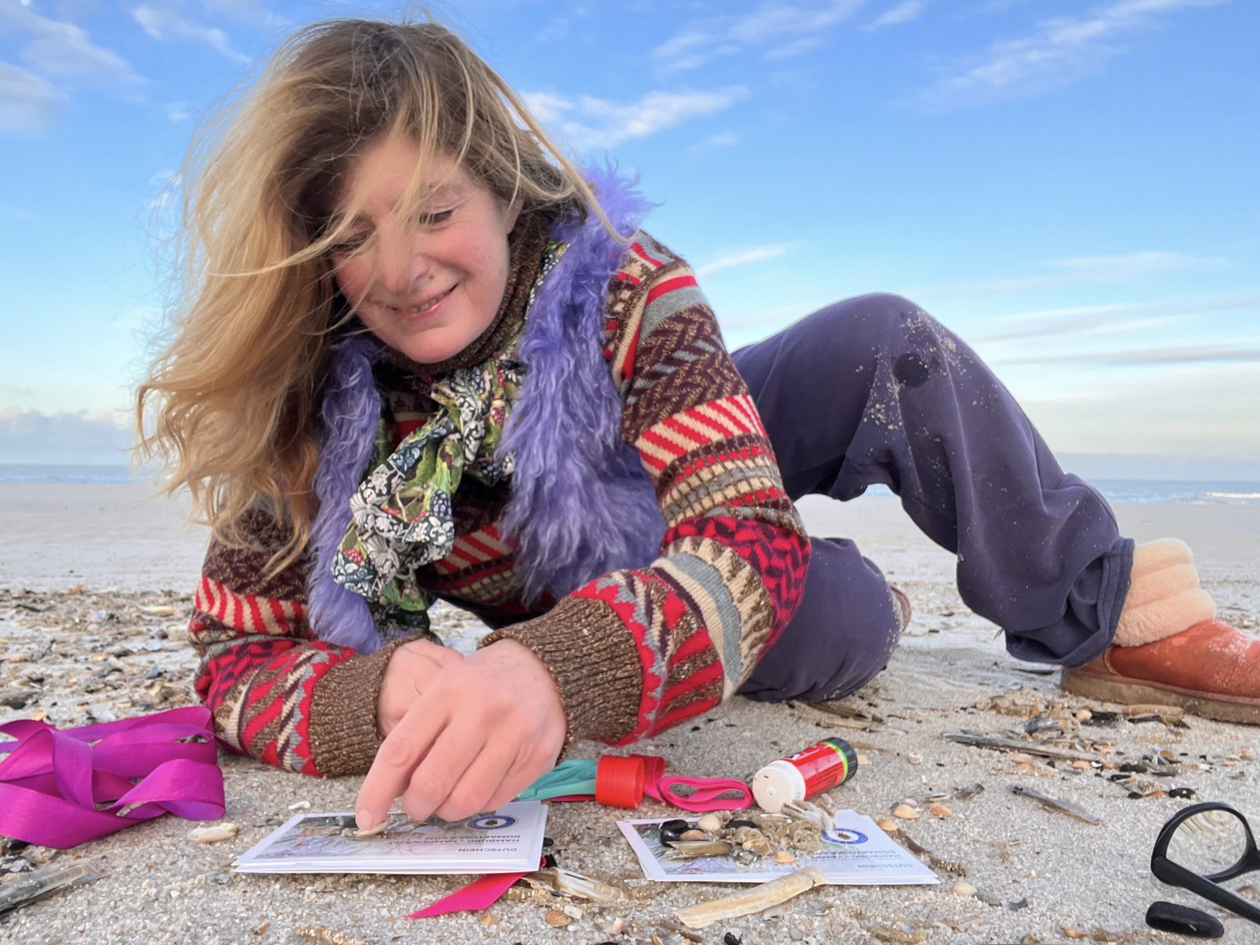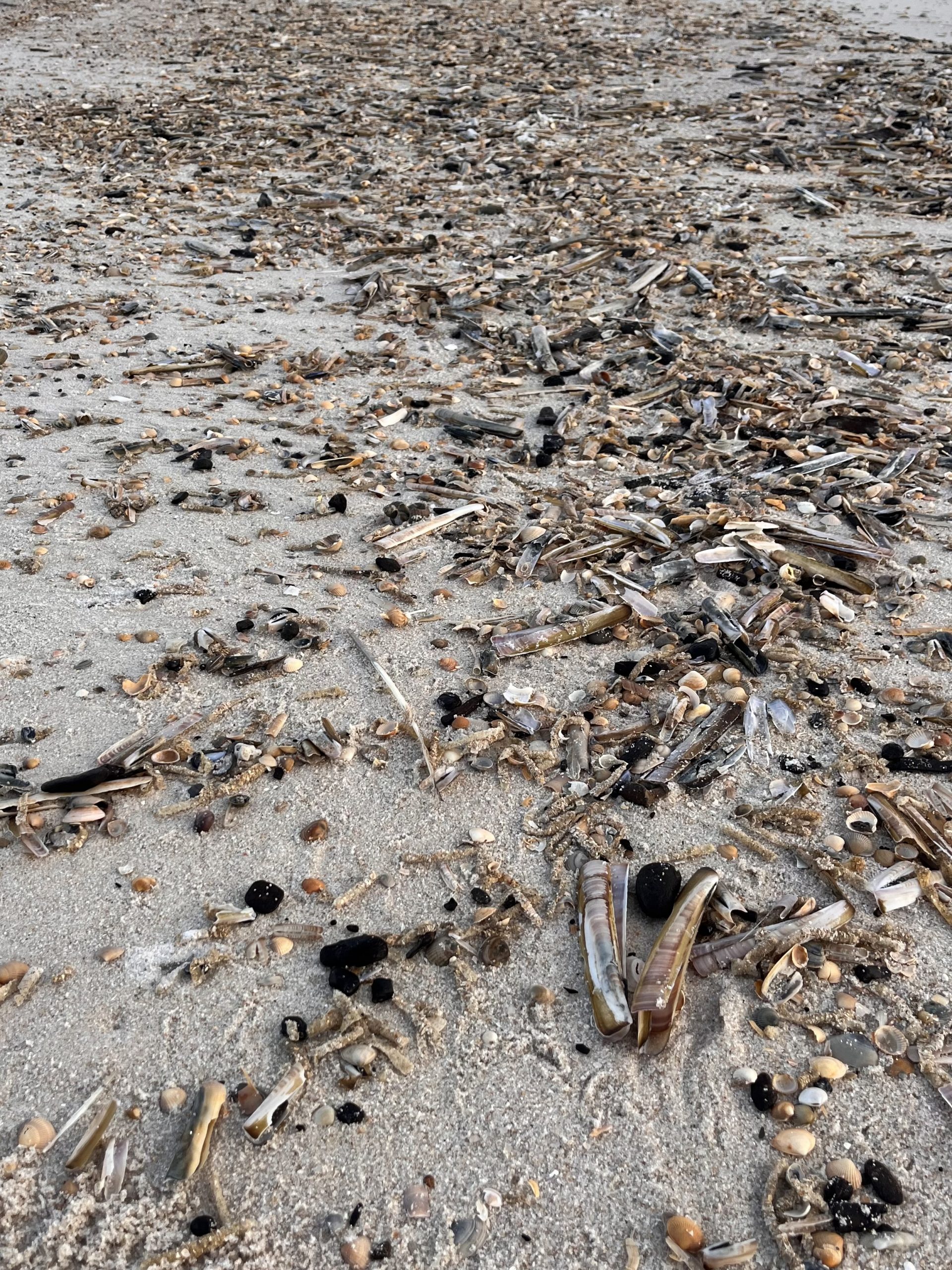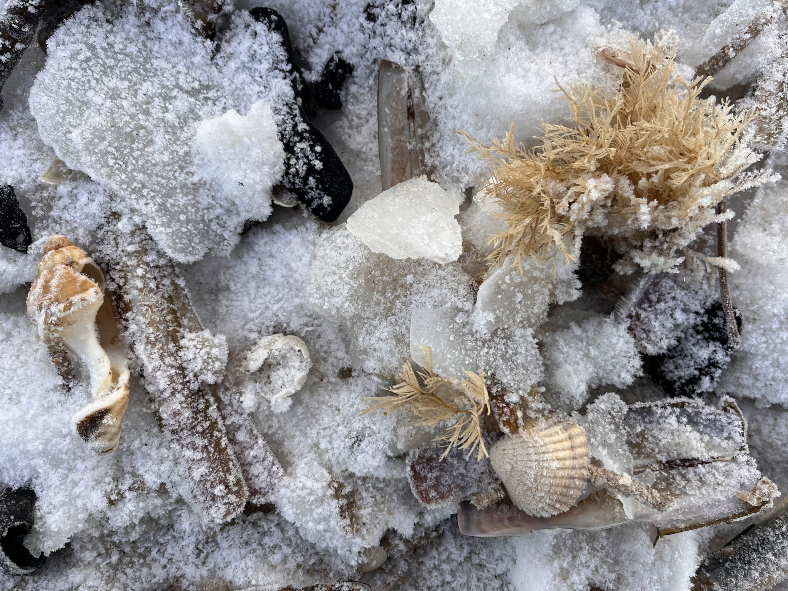 Die Hände habe ich vorher in den Manteltaschen aufgewärmt, so dass ich loslegen kann mit meinen Meeres-Kollagen, den kleinen Muscheln, den dünnen Strandhölzchen, die das Salzwasser schwarz gefärbt hat.