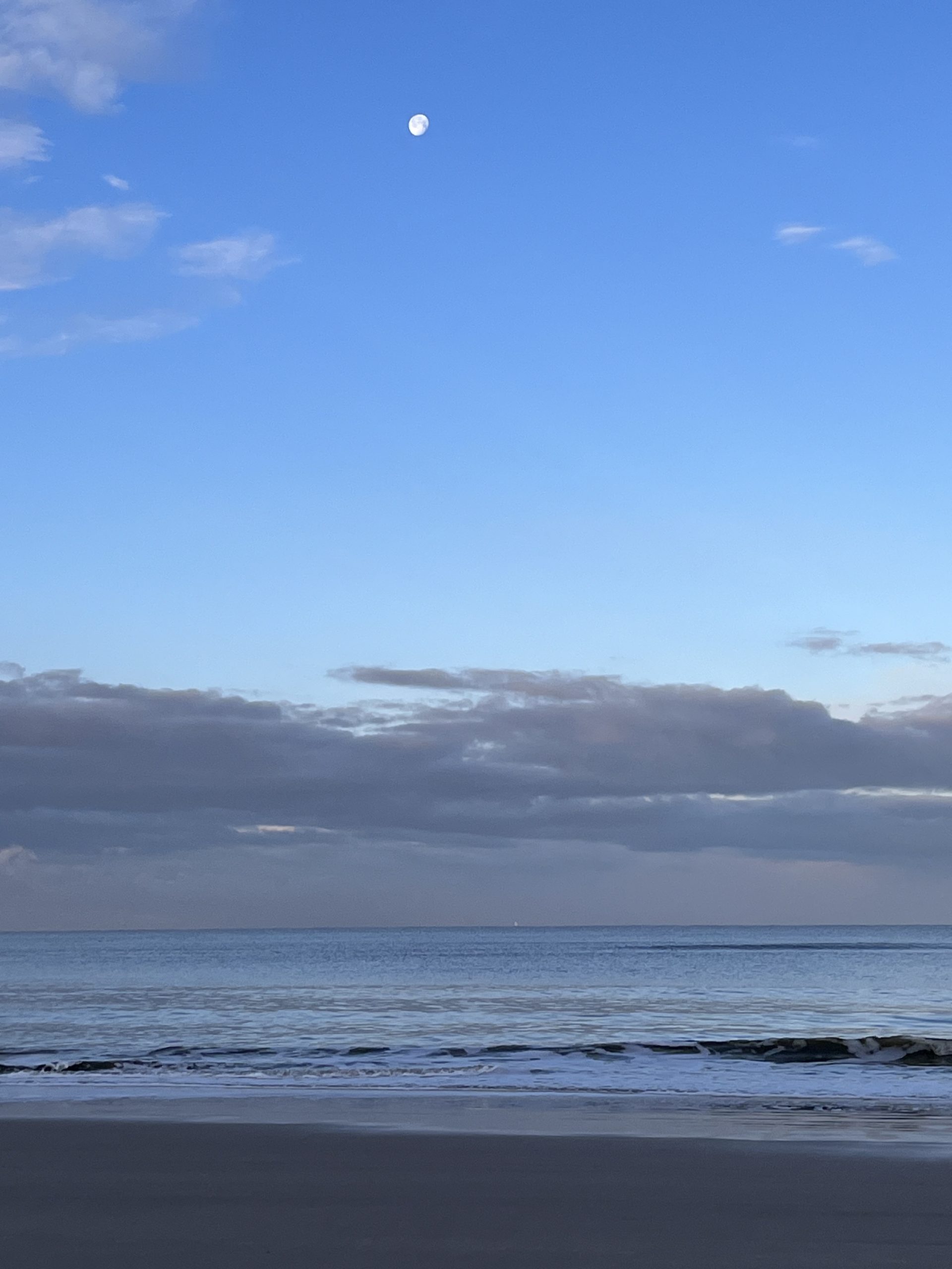 Wie jeden Morgen auf der Insel, führt mich der Weg an der Uwe Düne vorbei, den Steg entlang, die Treppen runter und zurück Richtung Sturmhaube unterhalb des Roten Kliffs. Über dem Horizont noch der Mond, im Rücken die Sonne, die kaum mehr über die Steilküste hinweglugt.