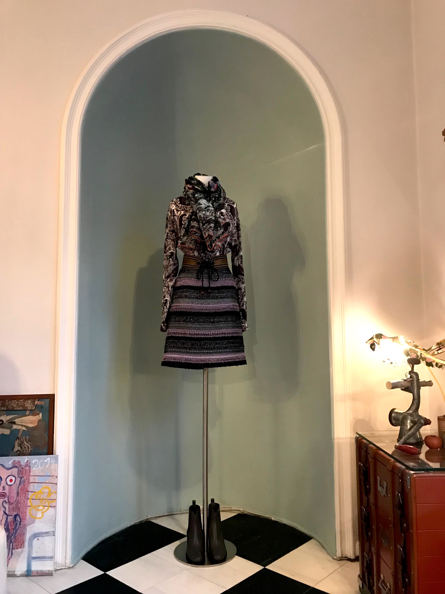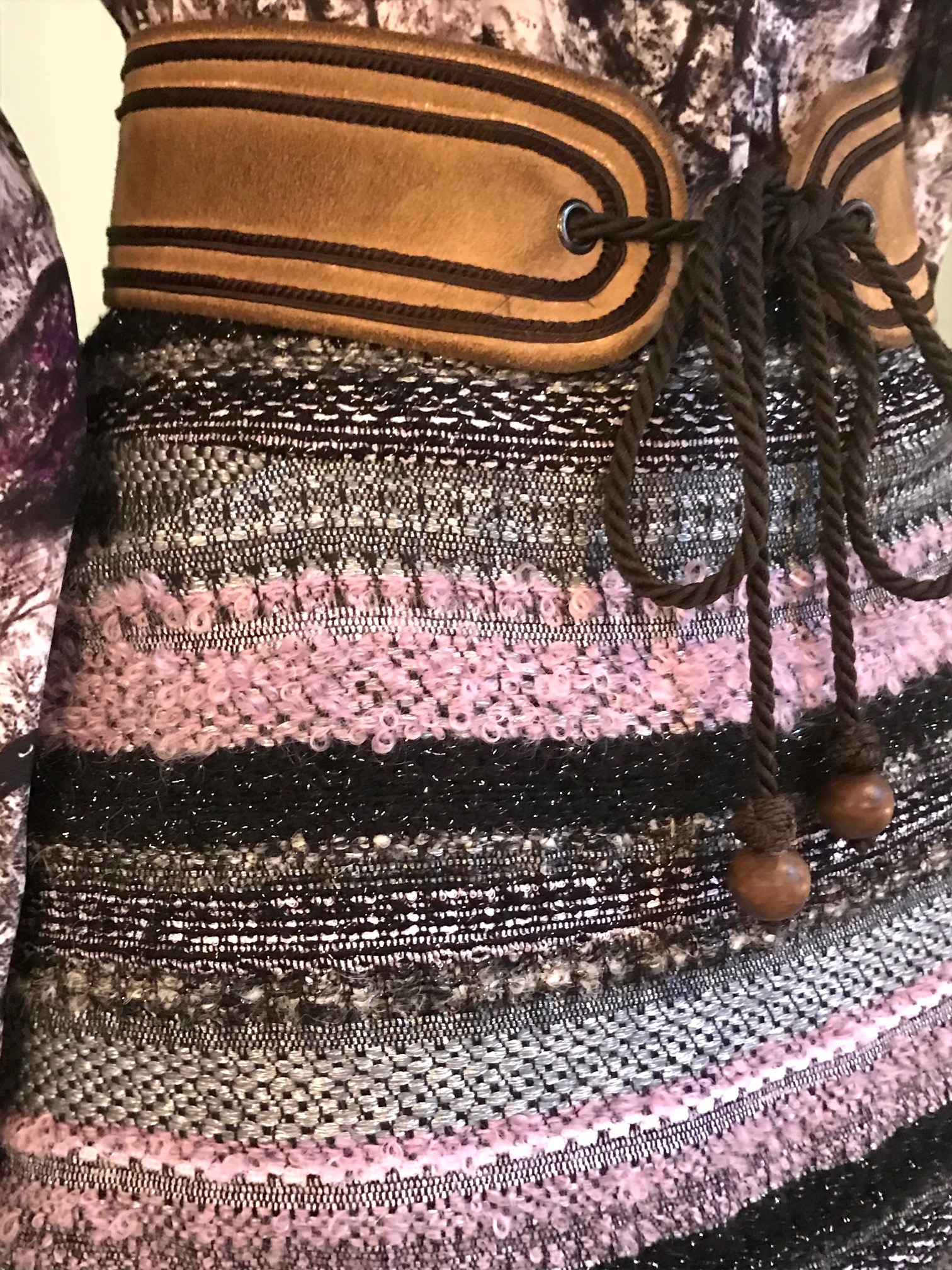 Der Streifen Bouclé Rock in silber-grau mit Flieder-rose ist ein perfektes Match zur Bluse Chagall/Jean de La Fontaine. Auf dem Mannequin kombiniert mit dem Birken-Seidenchiffon Tuch und den soeben eingetroffenen Stiefeletten von Taglia Scarpe in dunkel schlamm-grau.