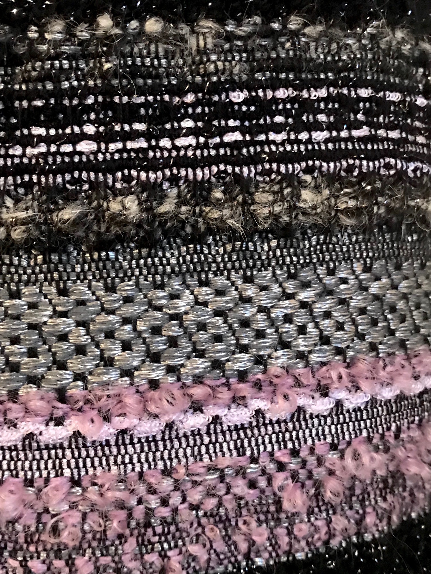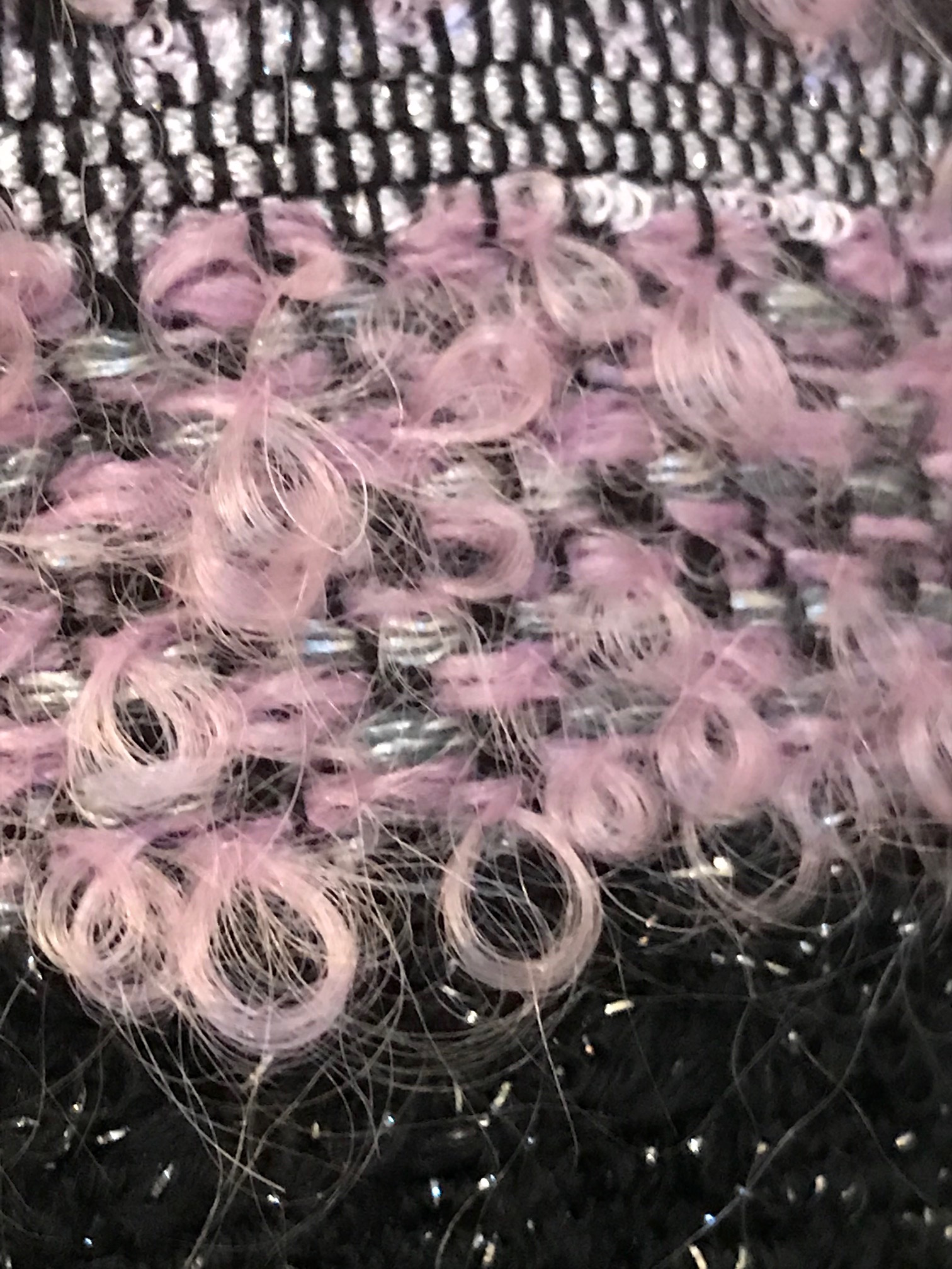 Was wäre Coco ohne den Bouclé, ein Material, das aus verschlungenen Fäden (frz.bouclé = Schleife, Schlinge, Locke) besteht und stilprägend wurde. Auch in diesem Fall ist es wieder moderne Technologie, die solche Effekte produziert, aber ohne das Fingerspitzengefühl von Stoffdesignerin Catherine und die Komposition aus Seide und Wolle, Silber, grau, schwarz und flieder würde der Stoff nicht diese Ausstrahlung besitzen.