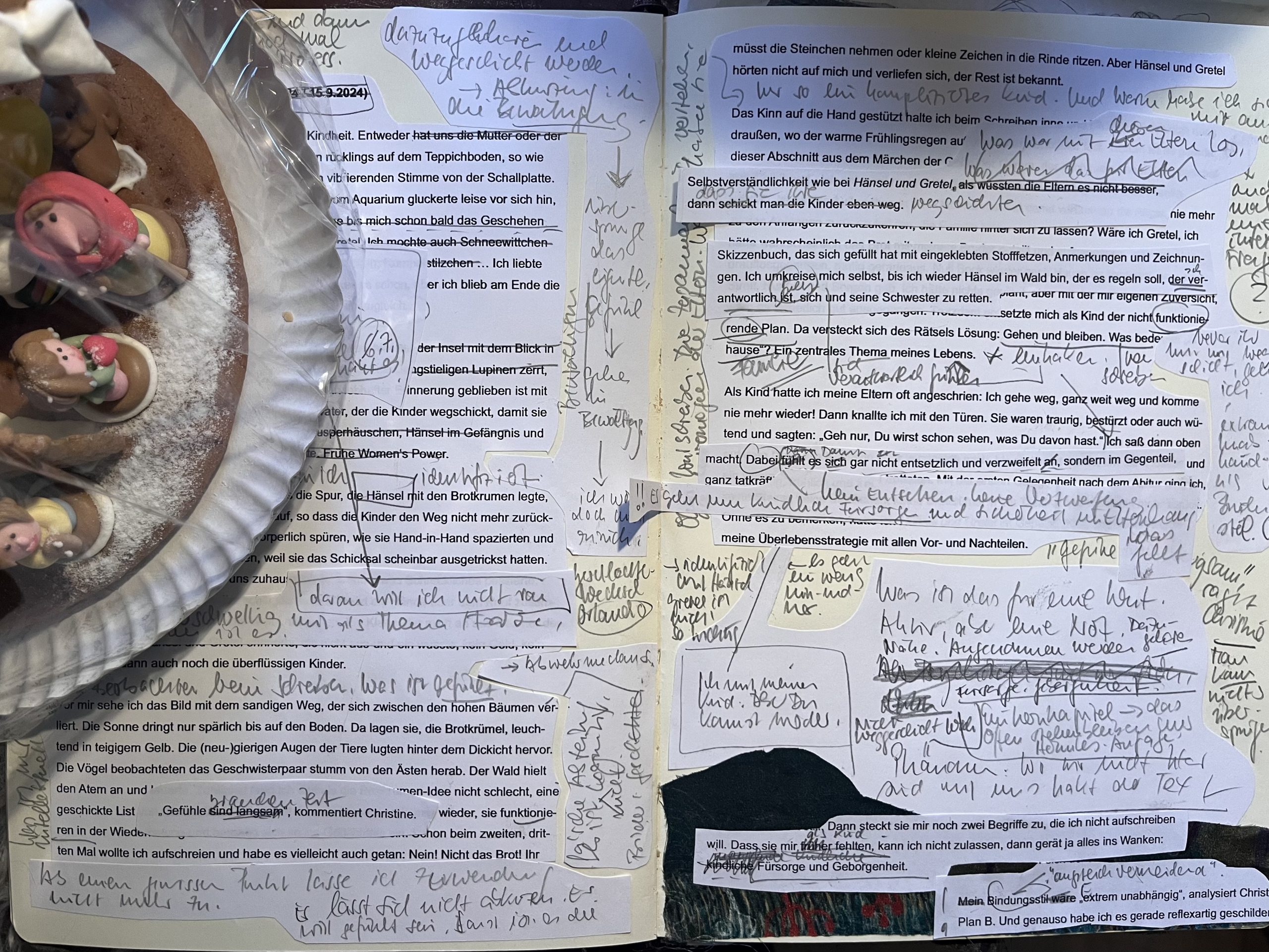 Ich setzte mich wieder hin, so wie ich heute am Schreibtisch sitze, zerschnitt die zahlreichen Varianten von Hänsel und Gretel, klebte sie wieder neu zusammen und kritzelte mit meinem Bleistift Stichworte dazwischen. Wohin will sie mich schicken? Geht die Reise der beiden Geschwister nicht hinaus in die Welt? Gretel schupst die alte Hexe in den Ofen, Hänsel wird befreit … sie kehren zurück zu dem Vater.