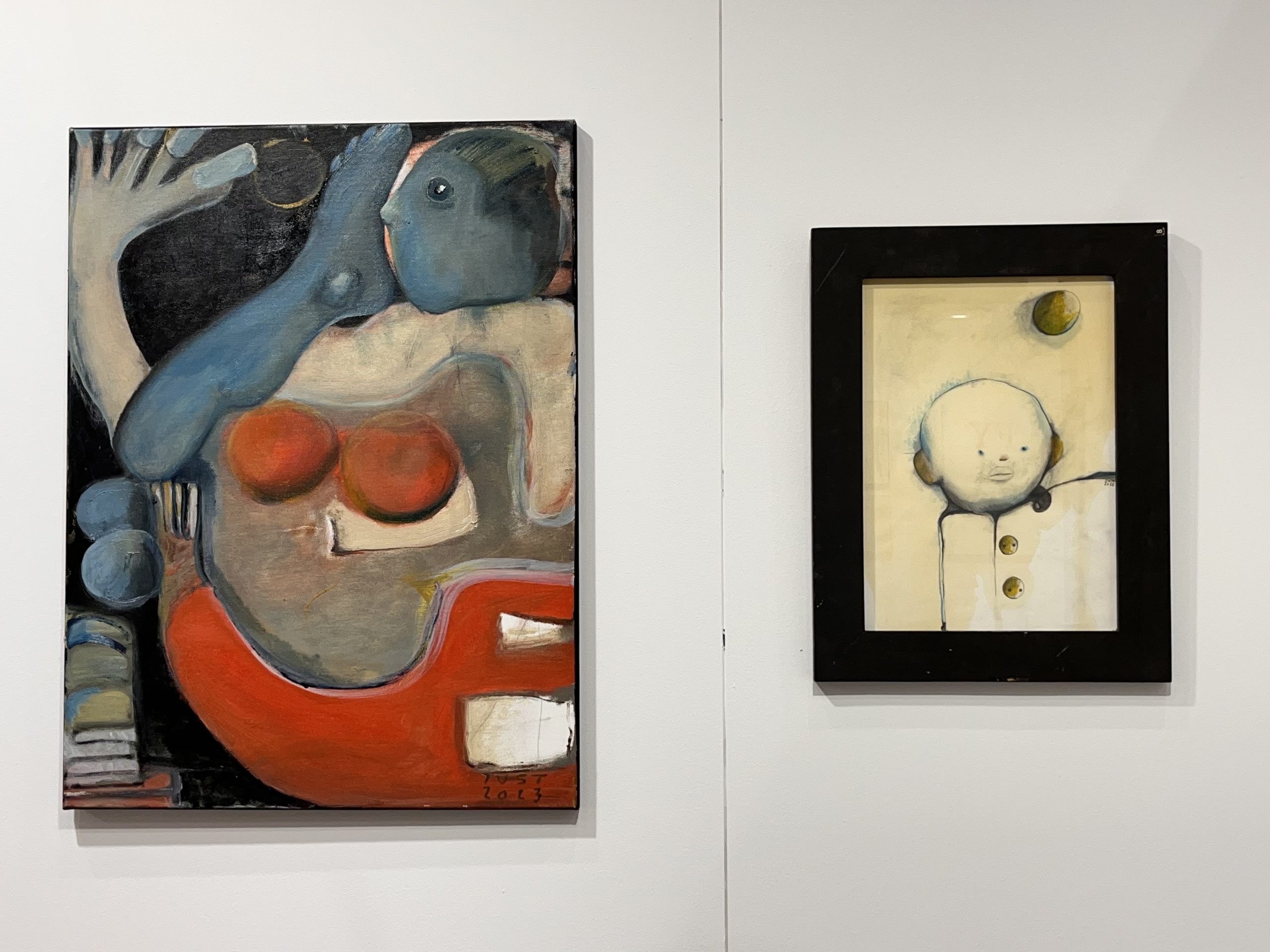 Gut sieht es bei uns aus, elegant und souverän gehängt mit der Hilfe von Olaf. Links der rumänische Künstler Andrei Pop, in der Mitte Alex Ewerth, die ihr Atelier neben meinem “Schlafzimmer” im Tempel hat, rechts davon der gebürtige Kölner Uli Bittmann und Friederike Just, über die ich schon mehrfach geschrieben habe. Die Künstler*innen sind bis auf Alex alle anwesend. Auch das ist etwas Besonderes auf der Messe und bei uns.