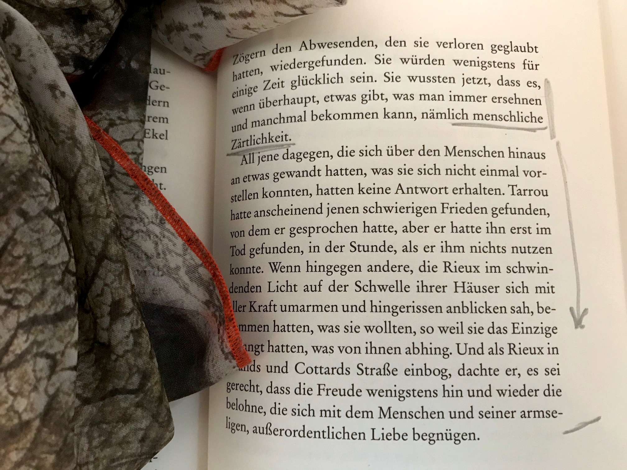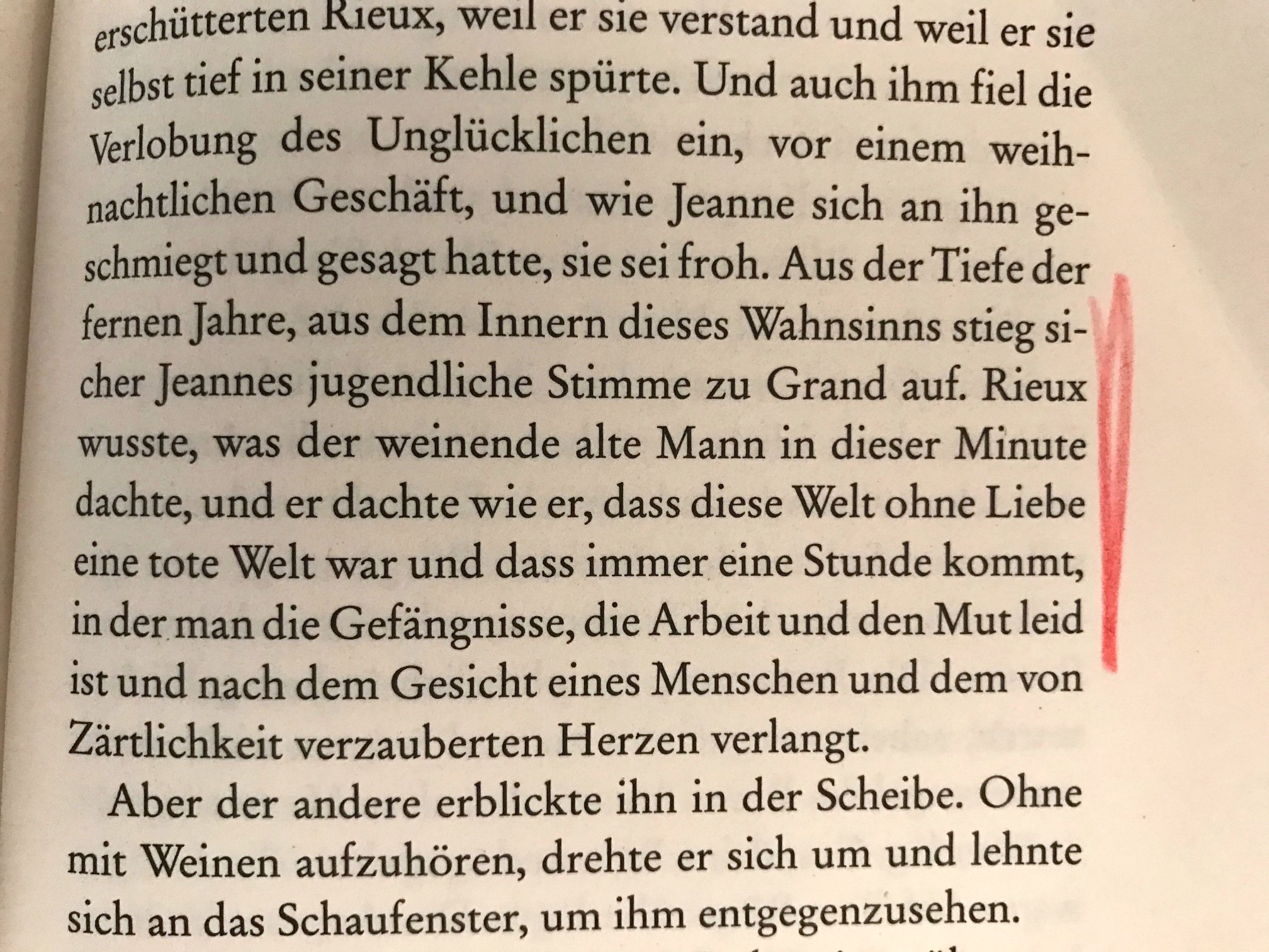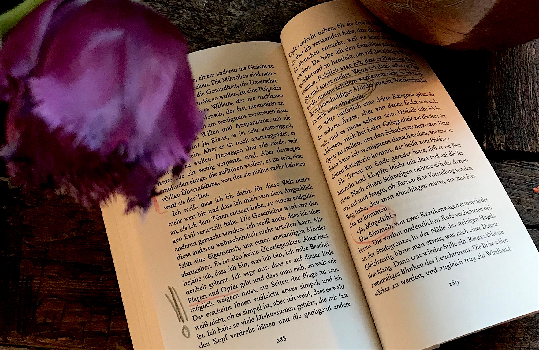 Vor einigen Wochen habe ich vollmündig angekündigt, dieses Buch vorzustellen: “Die Pest” von Albert Camus, 1947 erschienen, und seit einiger Zeit aus gegebenen Anlass ausverkauft. Ich habe es gelesen und wieder gelesen, immer mehr Sätze wurden rot markiert. Ich habe im Bett gelegen und es umschlungen und dabei geweint. Ich habe versucht, es zu verstehen in seiner tiefen Bedeutung, Absatz für Absatz. Jede einzelne Zeile trägt in sich so viel Wissen um diese Welt und unser Menschsein, dass man gezwungen ist, sehr langsam zu lesen, noch einmal ein paar Seiten zurück zu blättern, um den Sinn des Geschilderten wenigstens zu erspüren. Es ist ein großes Buch, eines der wichtigsten für mich. Und wenn ich mich jetzt vorsichtig nähere, dann hat es keineswegs den Anspruch, ihm gerecht zu werden.