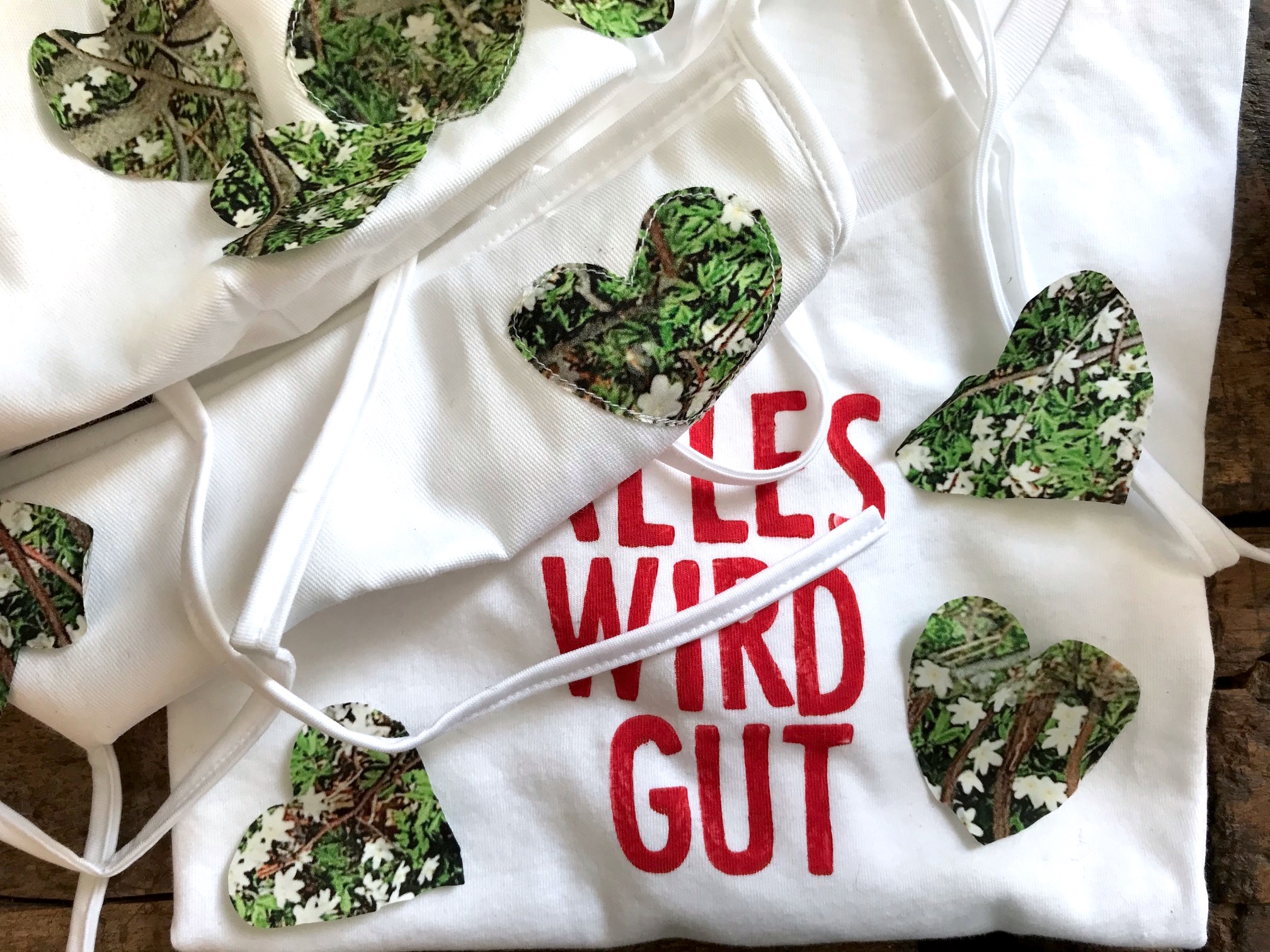 Wir haben das Shirt aus schöner Bioqualität, handbedruckt, gerade neu in Auftrag gegeben und dazu gibt es die Maske “Made in Erzgebirge” verziert von uns mit einem Waldblumen-Herz (zusammen €89 zzgl. Versand).