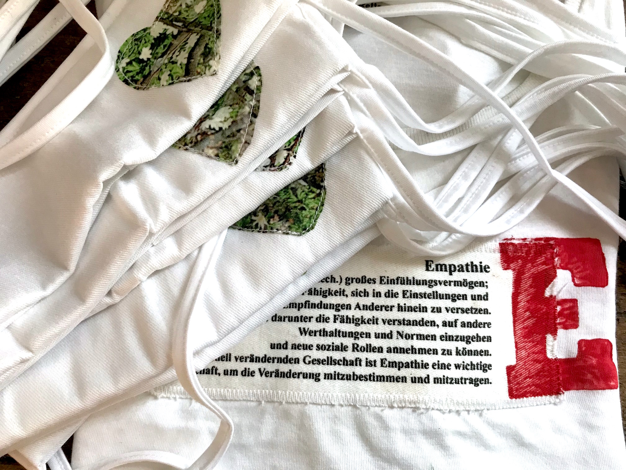 Aber (!) damit alles gut wird, brauchen wir noch etwas anders: Empathie. Das Shirt produzieren wir ebenfalls gerade nach, damit es rechtzeitig als Ostergeschenk verschickt werden kann. Fotografiert habe ich meines, schon ein wenig schmuddelig, weil ich es andauernd getragen habe. (Muss endlich die Waschmaschine im Keller suchen.) Auch hierzu gibt es die Maske “Made in Erzgebirge”. (Auf der Rückseite: die Definition von “Ignoranz”)