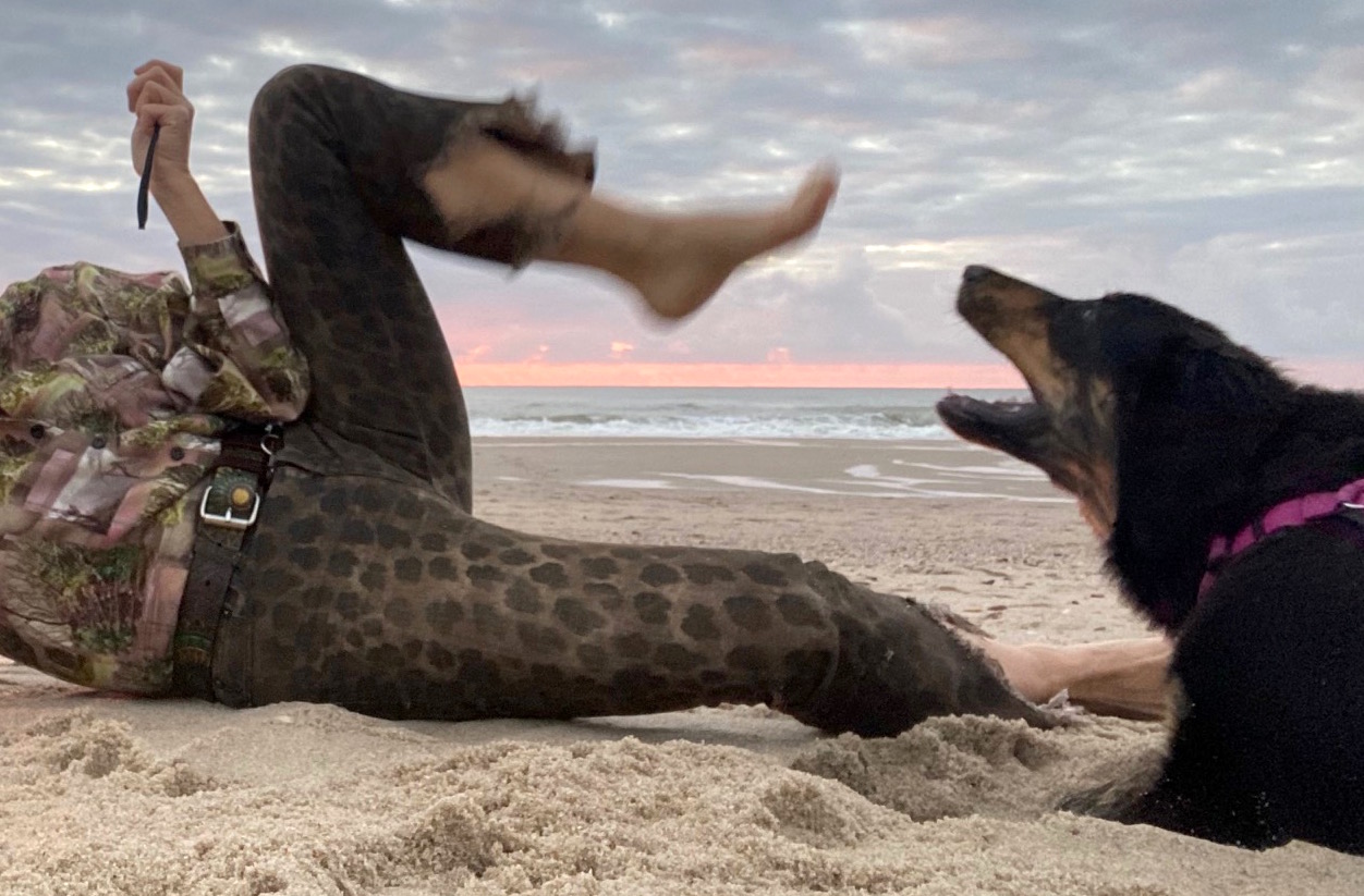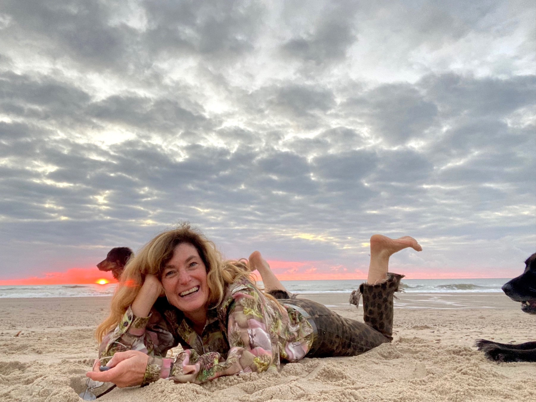 Kurz vor Ladenschluss der Anruf von der Freundin. Ein Satz, frech und erfrischend. Ich muss mich kaputtlachen, kann gar nicht aufhören. “Geh barfuss an den Strand!” Ihr Rat. Versprochen. Ich schnappe mir Mini-Stativ, Handy, die beiden Hunde. Umziehen? Nein, so viel Energie besitze ich nicht mehr. Die Bluse mit dem Ruwenzori Urwald muss auch am Meer funktionieren. Motto: Leopard sucht Fisch (oder so).