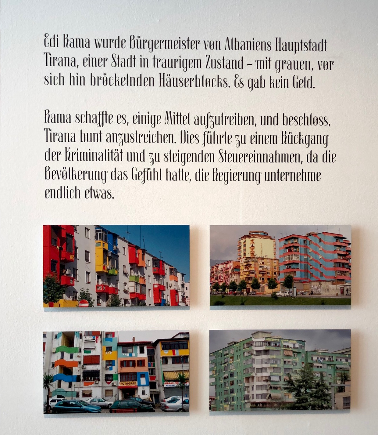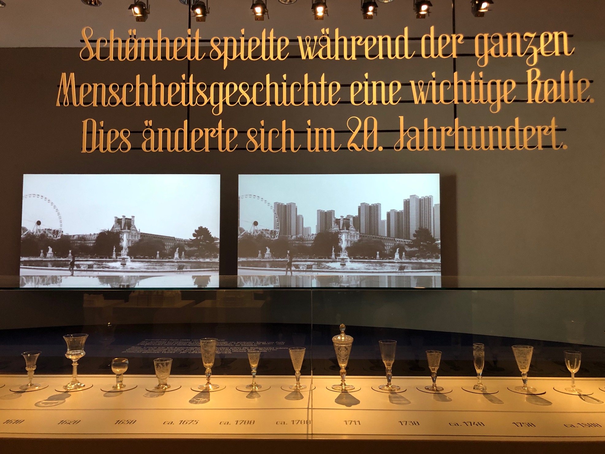 Ich wandere durch die Säle und vergesse doch wirklich kurzfristig die sonnige Main-Promenade draußen vor der Tür, schlängele mich durch einen Tunnel mit Bildern der Münchner U-Bahn und der Moskauer Metro, lese von dem fesselnden Projekt aus Tirana in Albanien und wundere mich über die Sammlung von symmetrisch geschlagenem Werkzeug aus der Steinzeit. Stimmt es, dass sich mit dem 20. Jahrhundert unser Begriff von “Schönheit” veränderte?