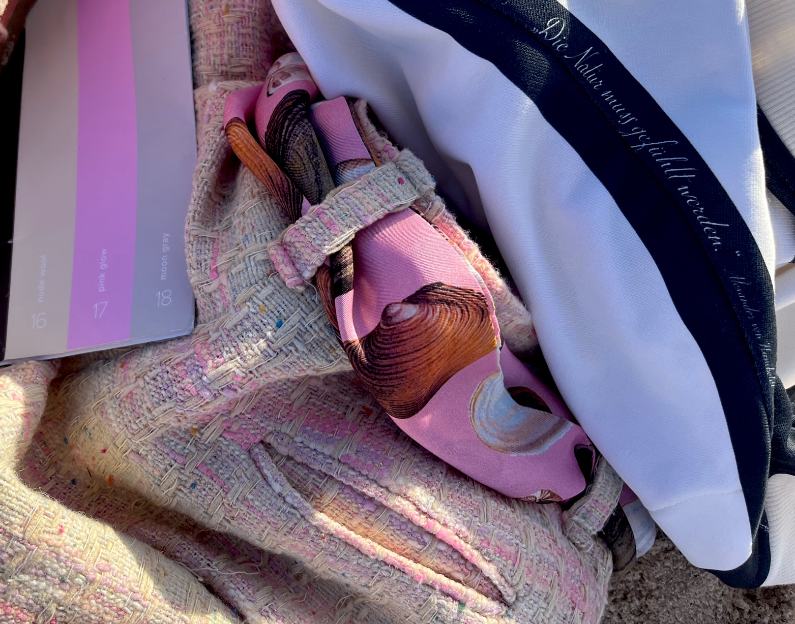Weiter geht’s mit nächsten Varianten von beige-pink. Die Hose bleibt, dazu gesellt sich das Muschel-Sweatshirt, das ab sofort bestellt werden kann und bei uns in keiner Auflage in den Geschäften hängt. Ich mag das Foto, es sieht wunderbar old-school aus.