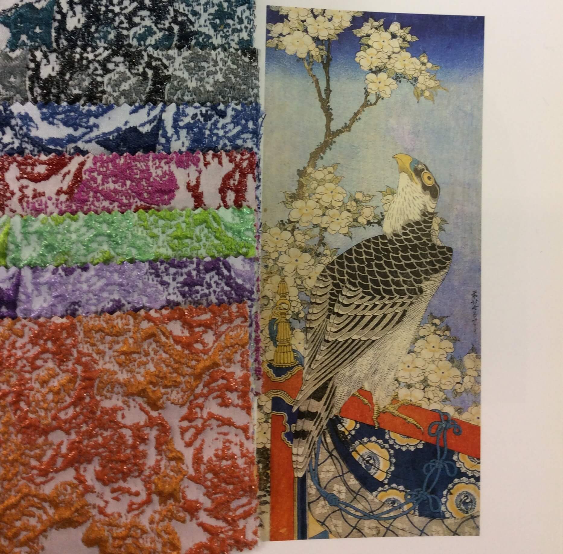 The new collection always starts with a research until the final theme is defined. For spring/summer 2016 it is “East meets West” with motifs and inspirations of the woodcuttings of Hiroshima and Hokusai the great Japanese artists of the 17th/18th century. “Ukiyo-e” is the name of these artworks and a world in a flow that allows the moment of live to focus on the beauty of the moon, of the snow and the colors of the leaves of a cherry tree. The actual Architectural Digest (Germany) presents an article about these artists. The new creative director of Gucci, Alessandro Michele speaks at the same time of his collection “recipe” about a little bit of Japan and a little bit of Hippie. – Are we trend?