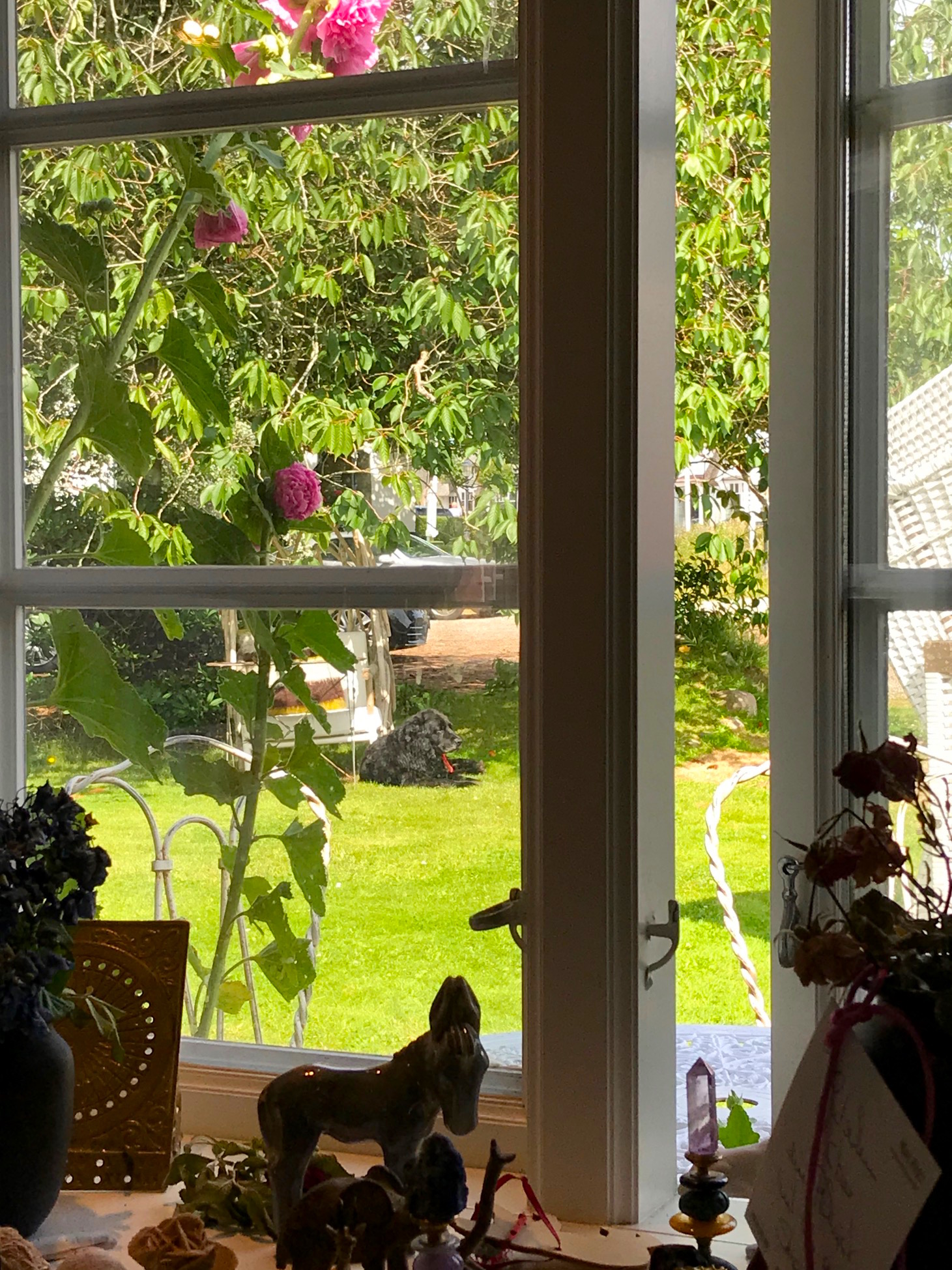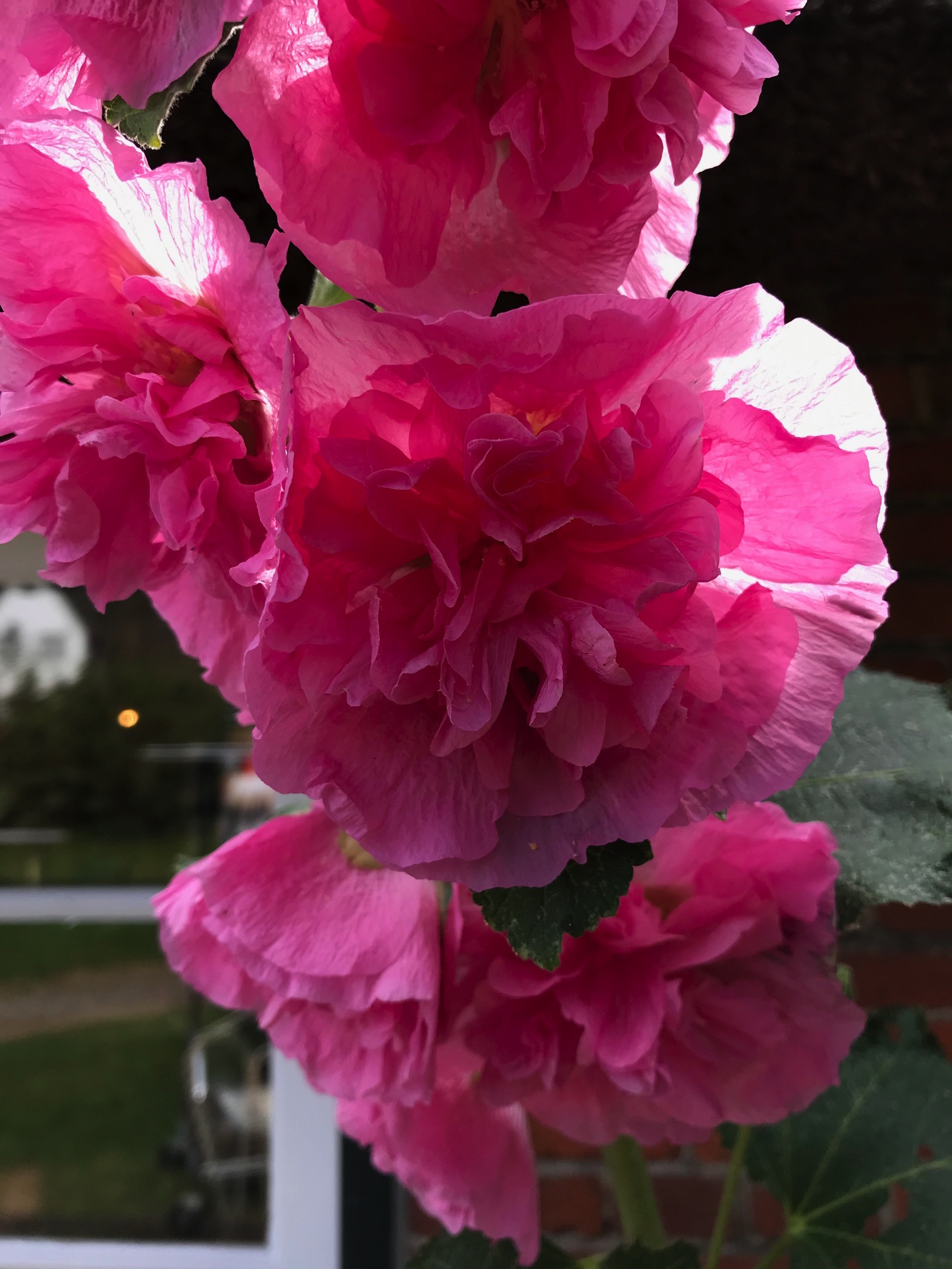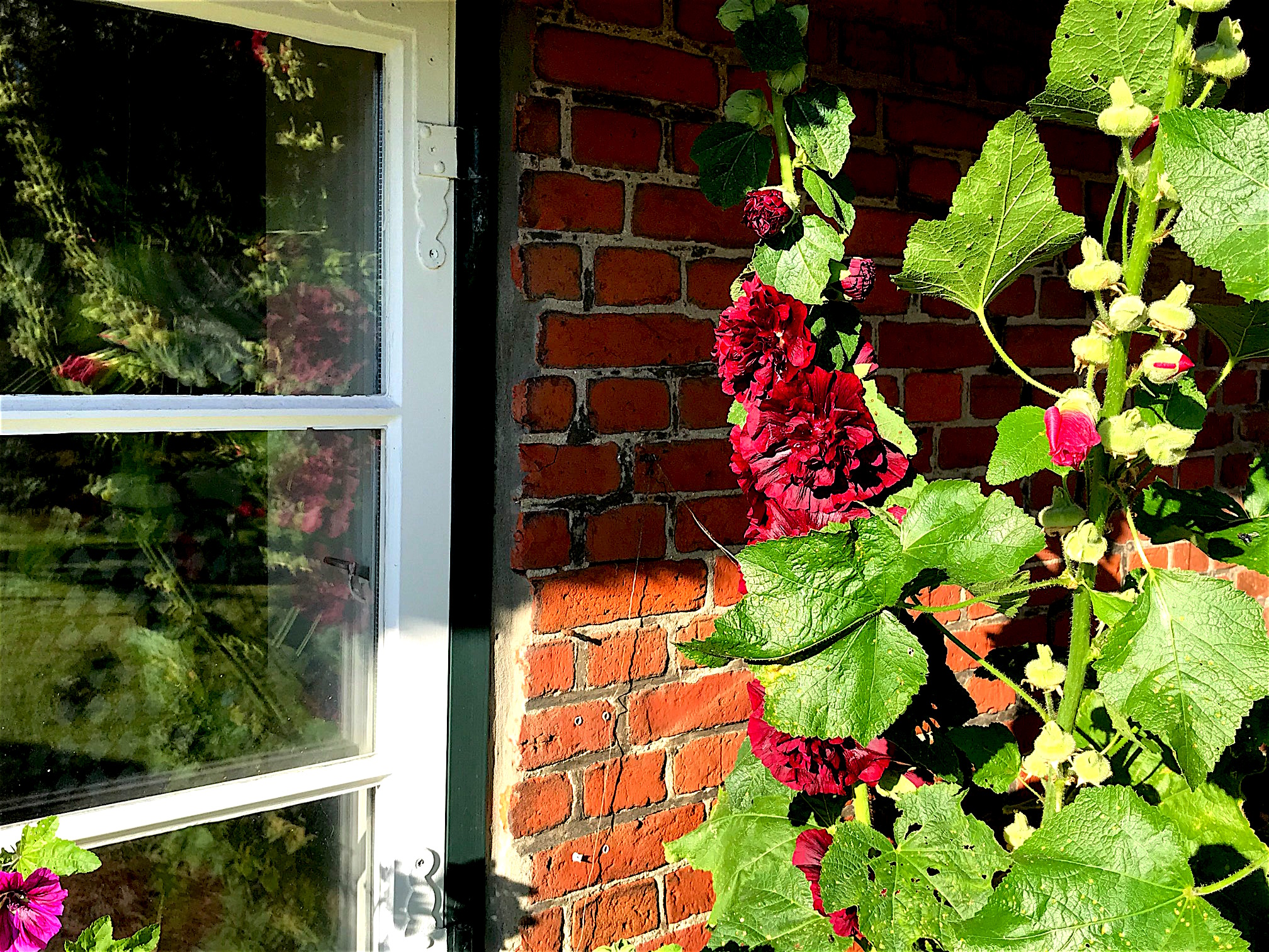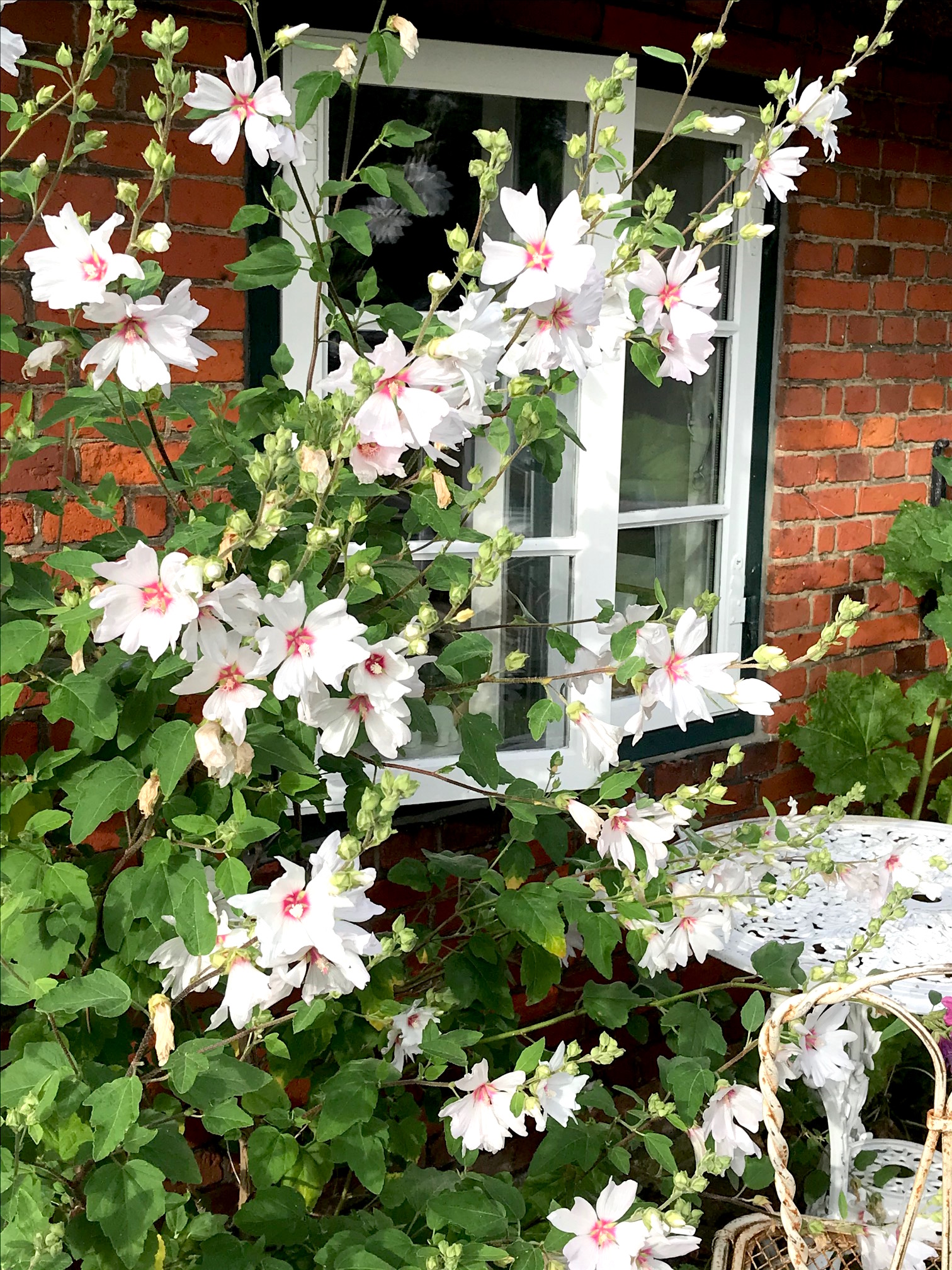 Die Pflanzenwesen haben einfach selbstständig übernommen, konzentrieren sich auf den Grafen und seinen grünen Daumen. Es wird begossen, beschnitten, befestigt und vor dem Rasenmäher gerettet. Es entsteht ein Garten, der in eine längst vergangene Zeit gehört, in der es keine modischen Überlegungen gab, ob blaue Hortensien zu rosa Stockrosen passen. Danke für die Fürsorge. Ich genieße still und innig als Augenmensch. Hinter dem Hibiskus befindet sich mein Schreibtisch, drinnen und draußen.
