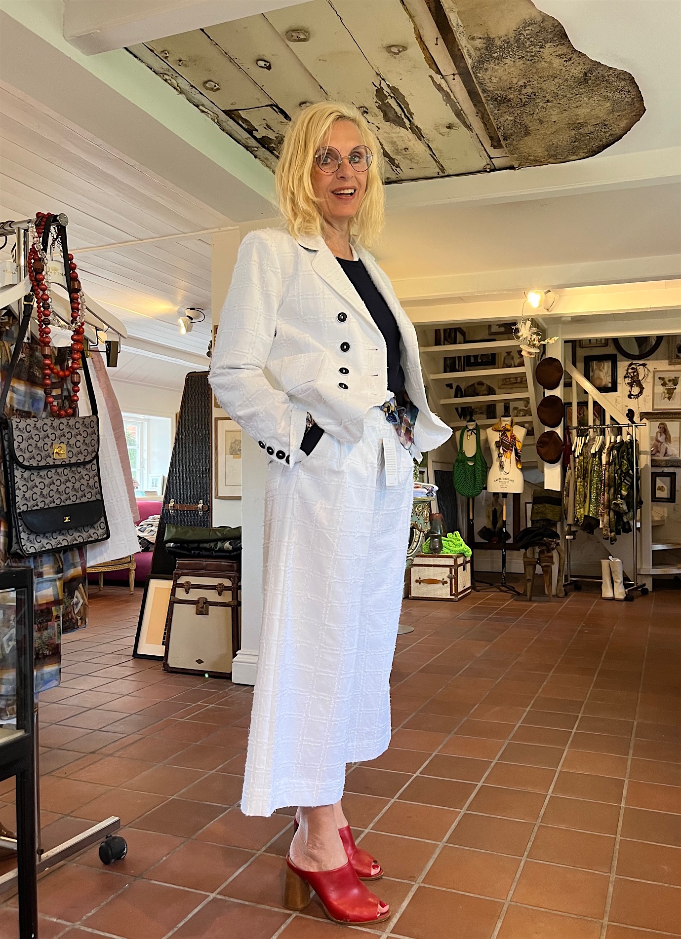 Natürlich kann ich auch lässig, ein wenig Jackie-O-Style mit der weißen Hose aus der aktuellen Kollektion, einem Seidentuch um die Hüfte, T-Shirt, navy Sweater und runde Sonnenbrille.