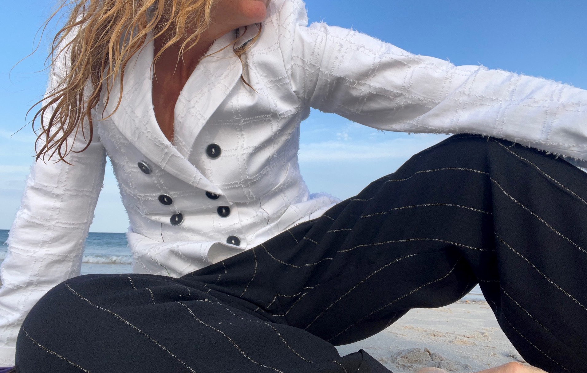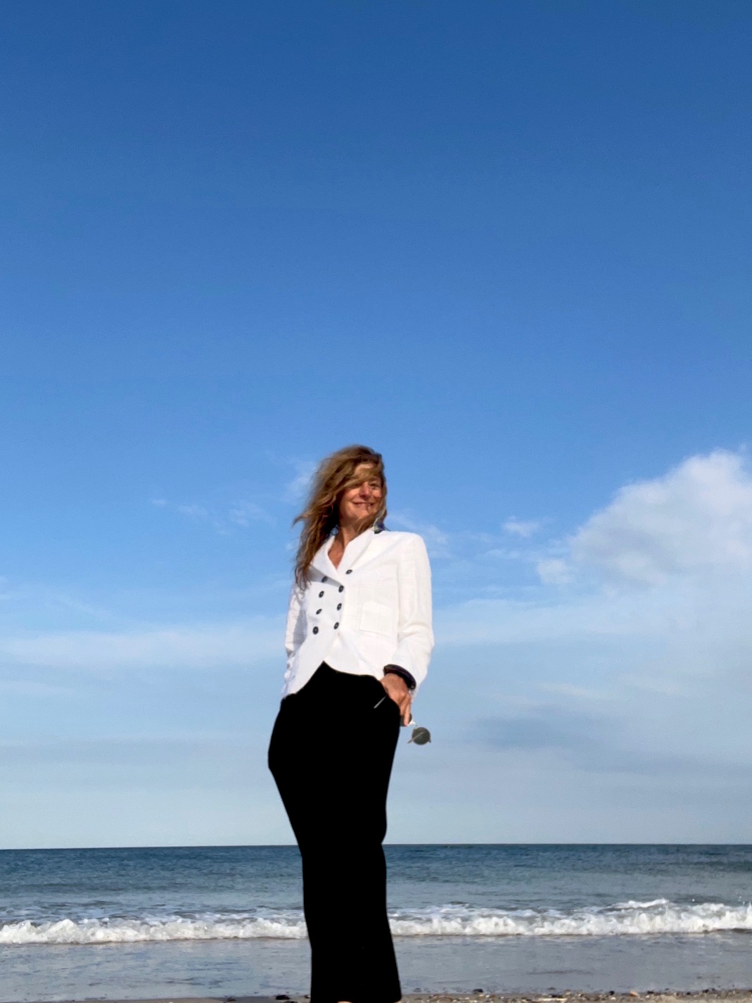 Der Dress-Code ist sportlich-schick. Ich empfehle mich als Beraterin und übe selbst schon mal mit Blau-weiß. Die Celine Hose passt noch, sie wäre ideal, dazu der weiße Doppelreiher Blazer, eigentlich ein Must für maritime Sehnsuchtsmenschen.