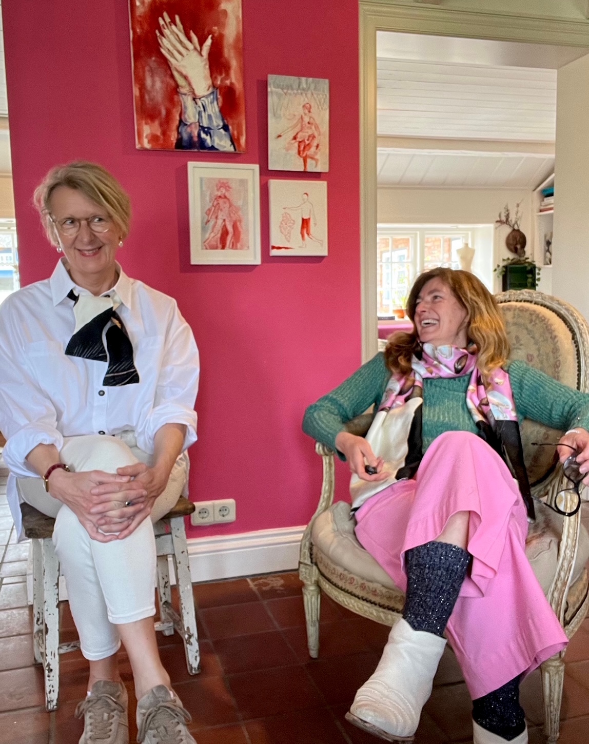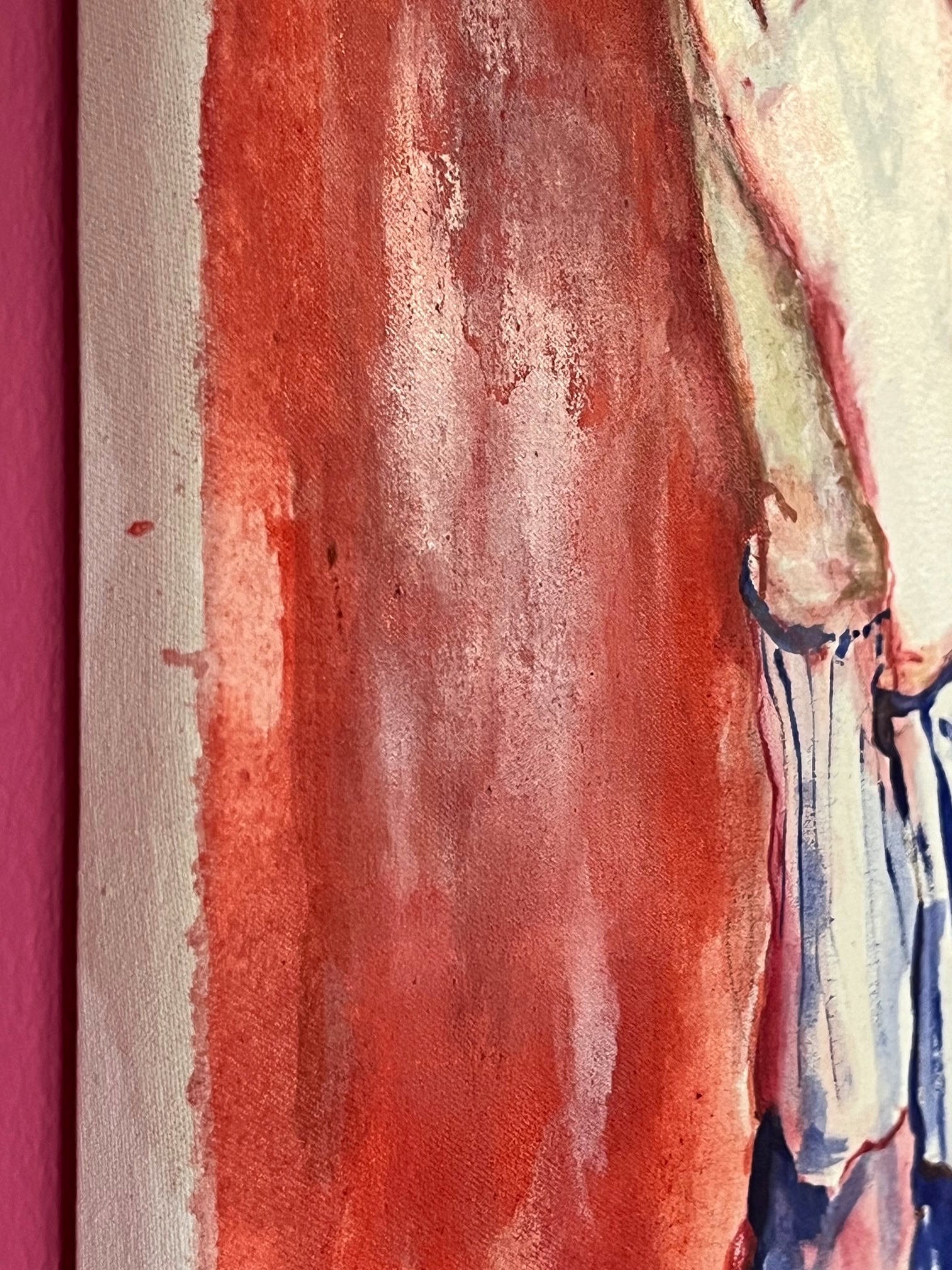 Dort sind es gefurchte Männerhände, die eines Apostels, leicht übereinandergelegt wie in dem Bild von Claudia Rößger. Dürers Kupferstich hing in jeder deutschen (Nazi) Stube. Das Werk wurde oft frömmelnd verklärt, gehört zu den Inkunabel der Kunstgeschichte. Schon wird unser Gemälde an der pinken Wind vielschichtig, greift in die Vergangenheit, kreist um Gender-Fragen, thematisiert das Weibliche.