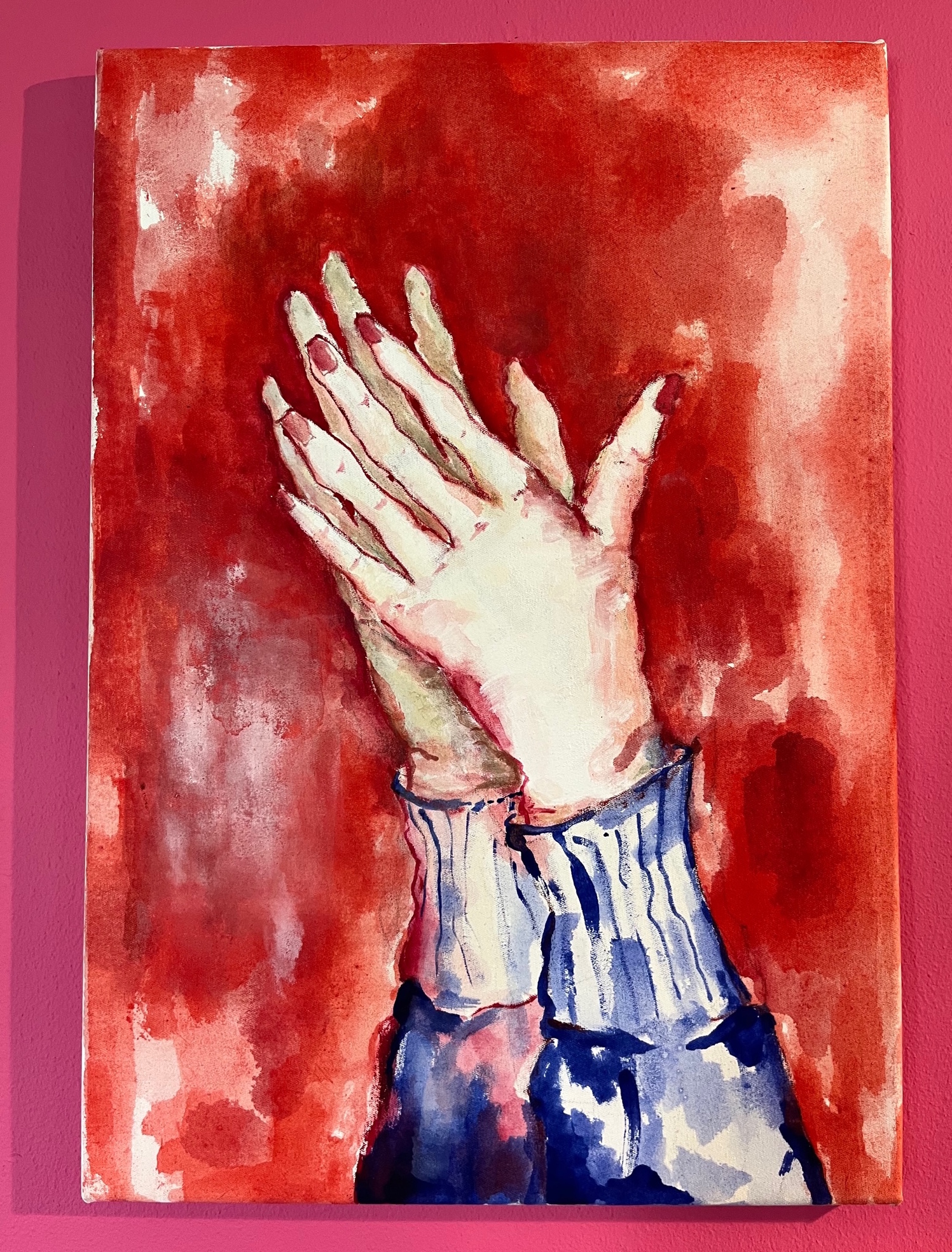 Zwei Hände legen sich übereinander, ohne deckungsgleich zu sein. Sie scheinen sogar unterschiedlich groß. Von der einen sehen wir die Außenseite, von der anderen die Innenseite. Nagellack ist auf den Fingernägeln, dass man von einer weiblicher Hand ausgehen kann. Der eine Daumen ist abgespreizt. Die Arme stecken in einem blauen Gewand, das sich zum Handgelenk verengt. Der Hintergrund ist rot, wässrig und fleckenhaft aufgetragen. Dazwischen weiße Übermalung sowie unbedeckte Leinwand. Hell und Dunkel deuten einen Lichteinfall an.