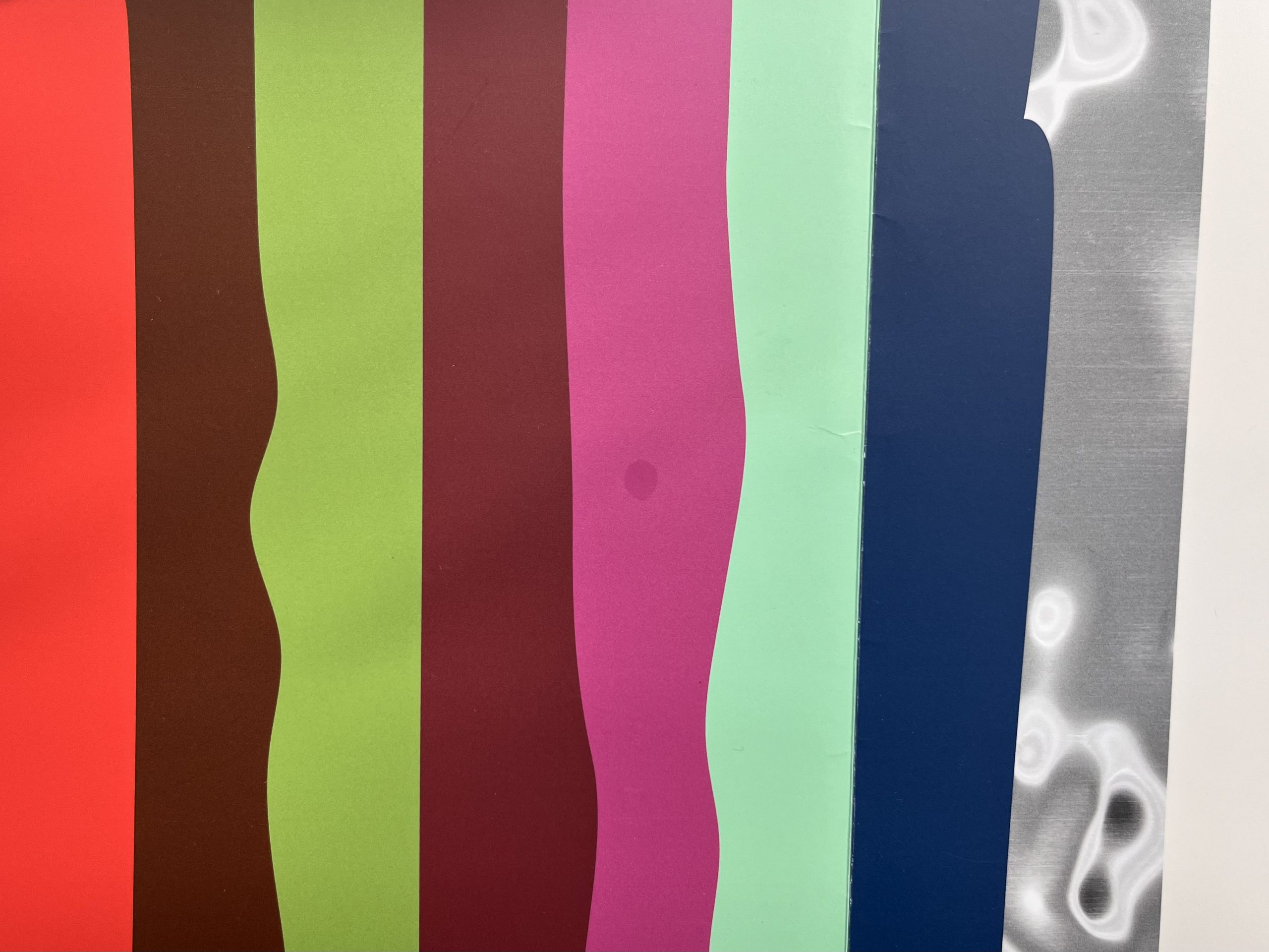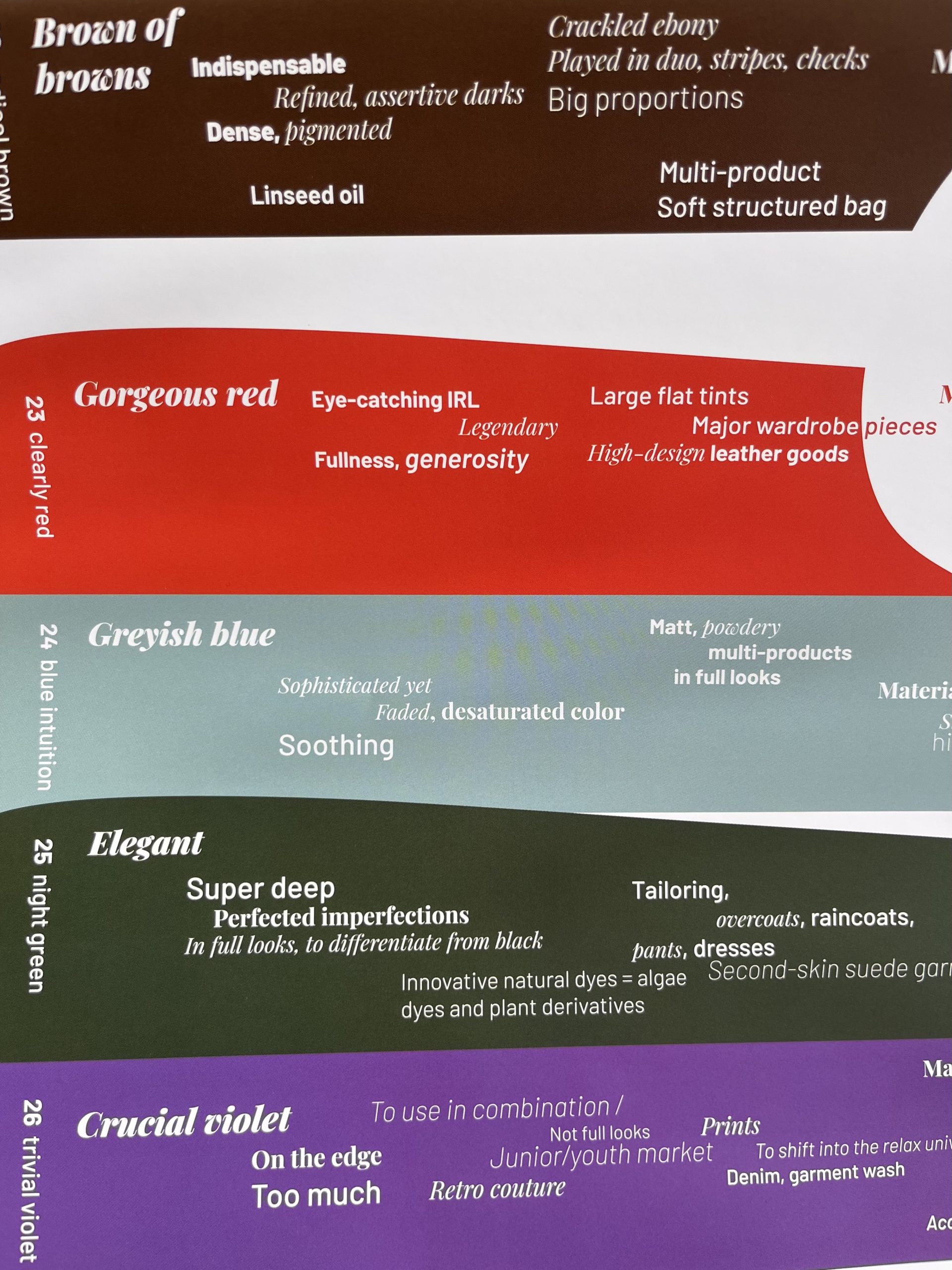 Was wir sehen, ist nicht das Testbild des Fernsehers, wenn das Programm in der Nacht zu Ende ist. Ich glaube, so etwas gibt es längst nicht mehr. Es wird geguckt oder gestreamt, rund um die Uhr im somnambulen Sog der parallelen Welten. Stattdessen hat der Titel etwas mit Mode zu tun und gleichzeitig um sehr viel mehr, denn es handelt sich bei dem Foto um einen Ausschnitt aus den Herbst-Winter 2023/24 Trendfarben: Comforting Grey, Dripping Wax, Green Clay, Mélasse, Fermented Mastic oder Craft&Art. Ich hatte schon über die Disruptive Darks geschrieben. Nun der Blick auf das Ganze.
