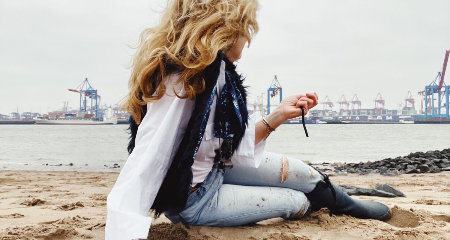 Stellen wir uns vor, der Sand unter mir ist warm, weich und viel heller, als dieser hier, beinahe weiß ist er, und seine Körner rieseln mir durch die Finger. Stellen wir uns weiter vor, hinter mir fließt nicht die schlamm-braune Elbe, sondern das türkisene Wasser einer Südsee-Lagune. Die Krähne, Container und Schiffe radieren wir auch …