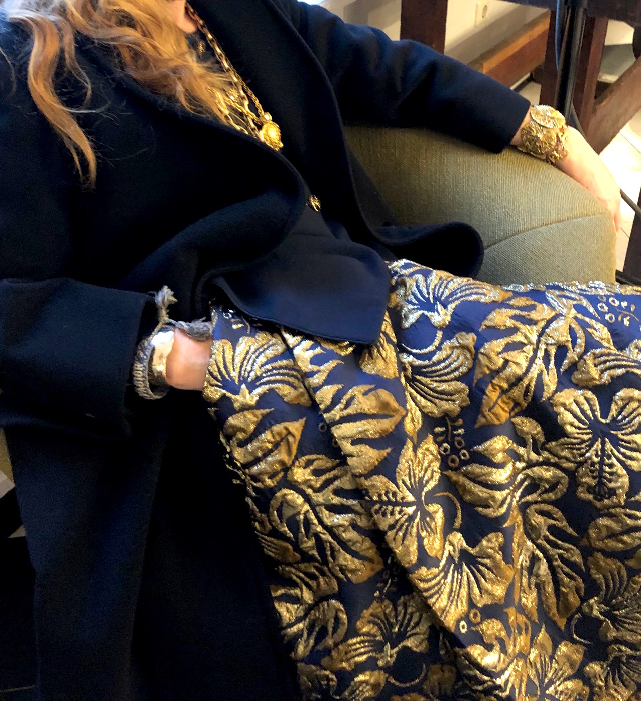 Das Prada Kleid aus Gold-blauem Brokat wird es, ebenfalls ein Secondhand Schnäppchen von den Freundinnen aus der ABC-Strasse. Dazu die Asien Jacke von Yves Saint Laurent, den an mir typischen Schmuck, die kleine Kitab aus Äthiopien und an die Füßen die Slingbacks von Taglia Scarpe. Ich fühle mich perfekt und ernte das vorgezogene Kompliment der “Chinese New Year Queen”.