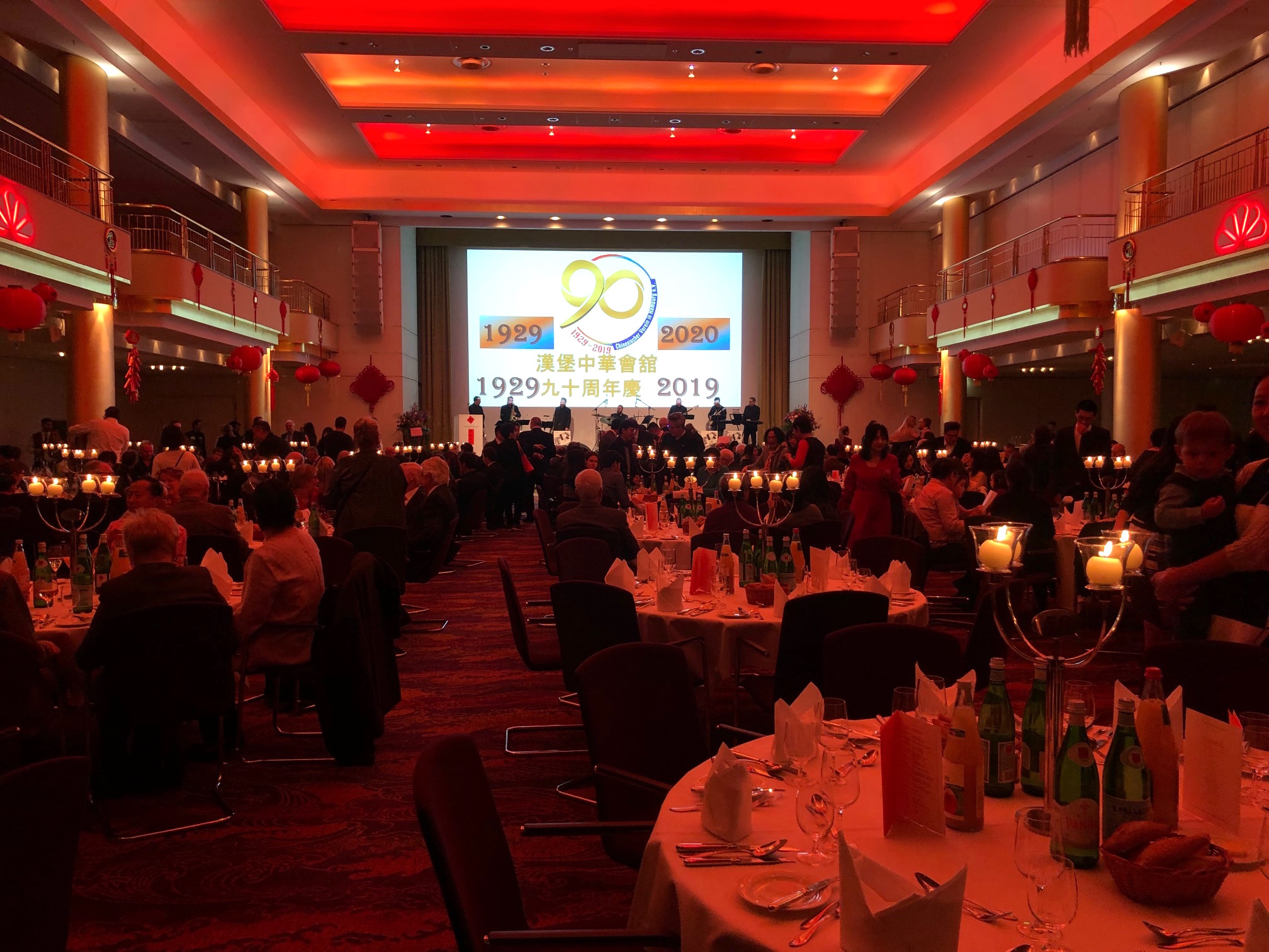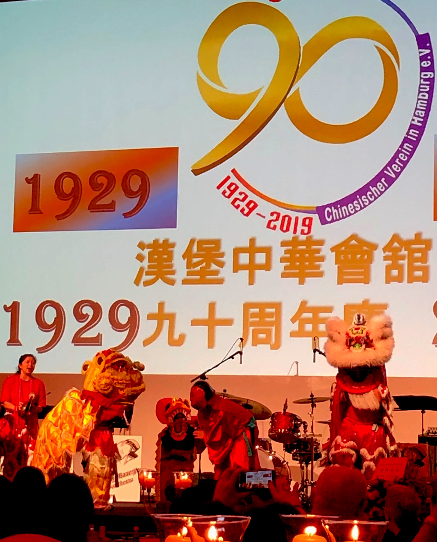 Wir sind angekommen: Ein großer Saal, chinesischen Dekorationen, ein Tanz der Löwen, amerikanische und chinesische Musik. Links und rechts illustre Tischnachbarn.