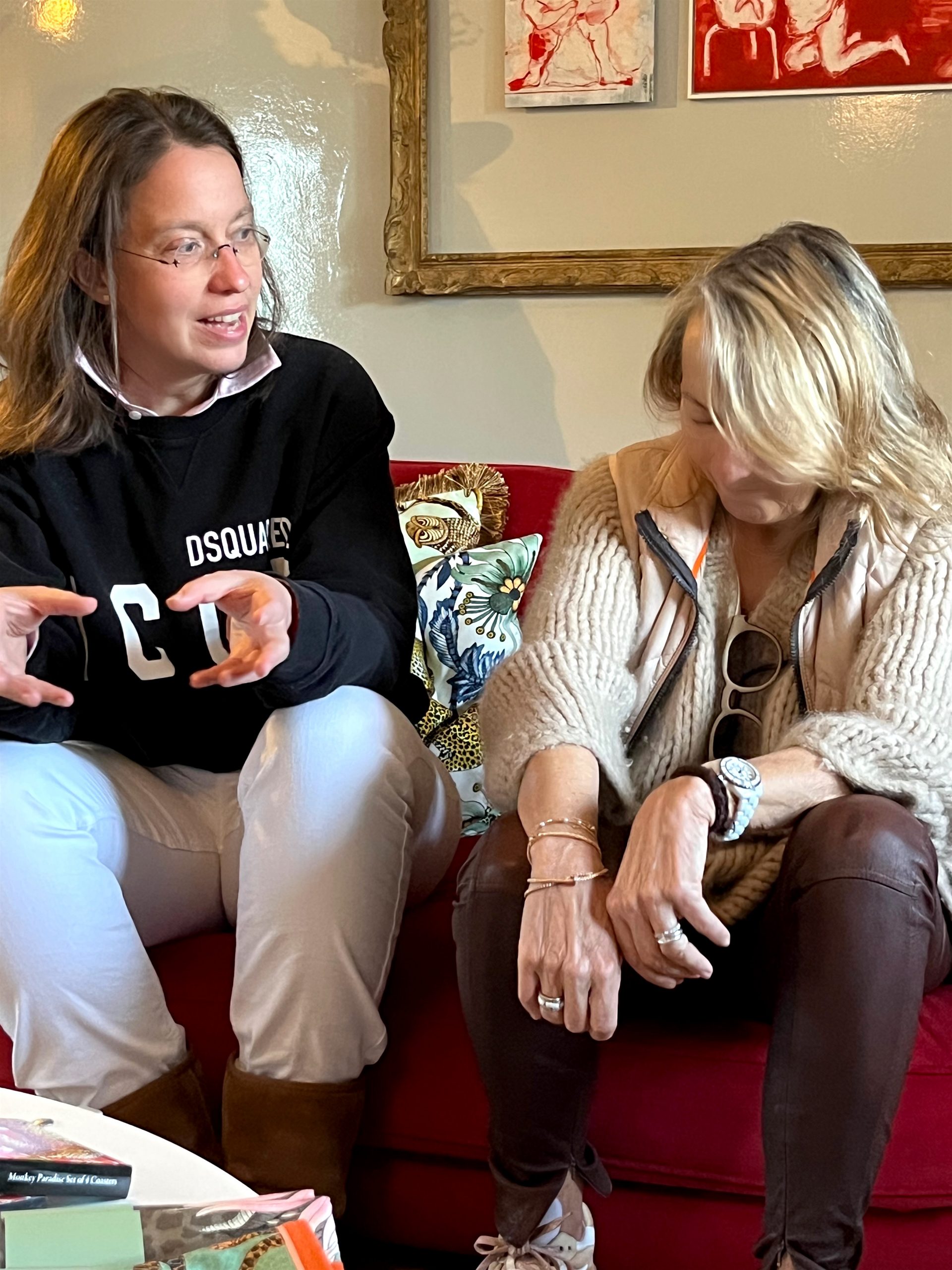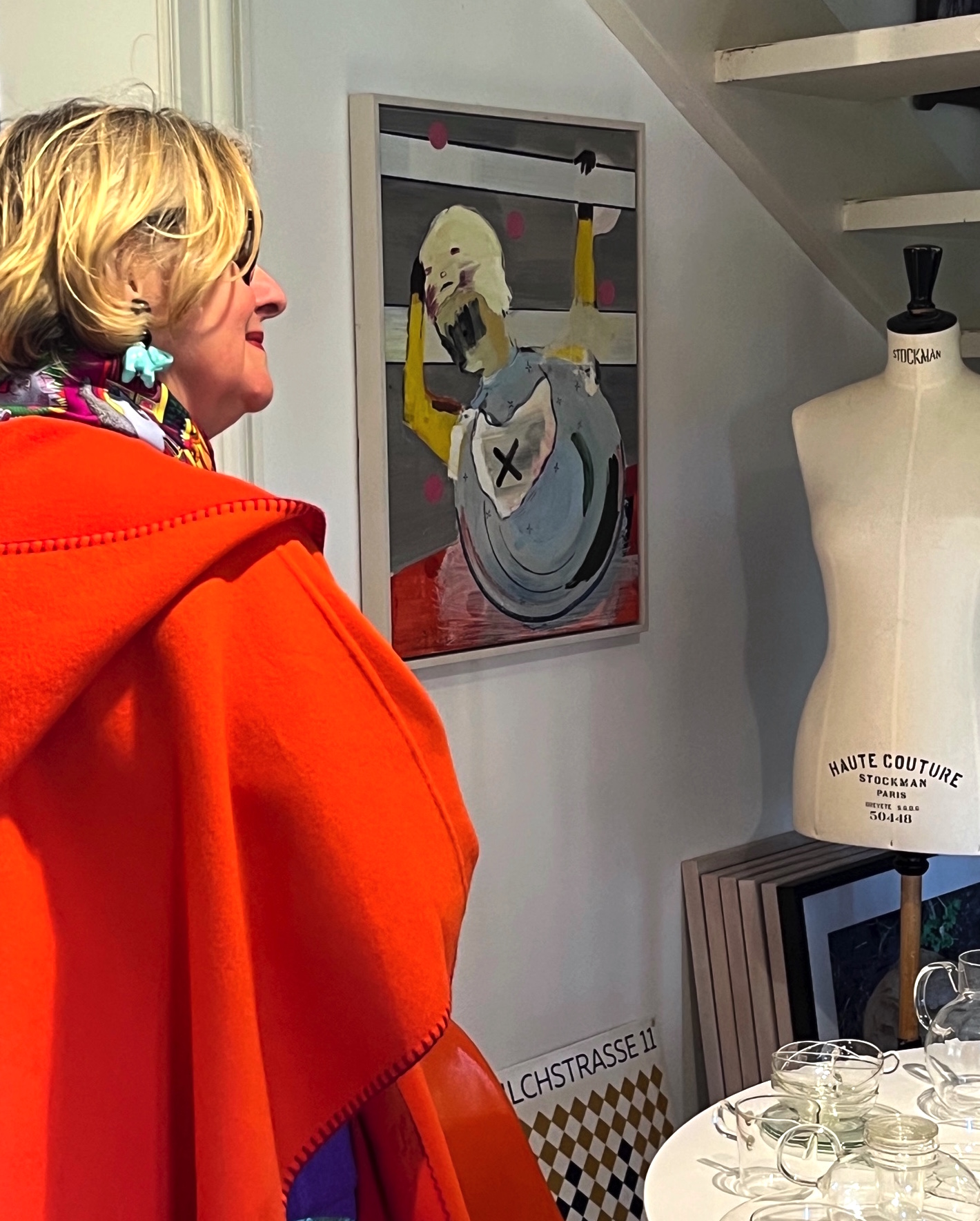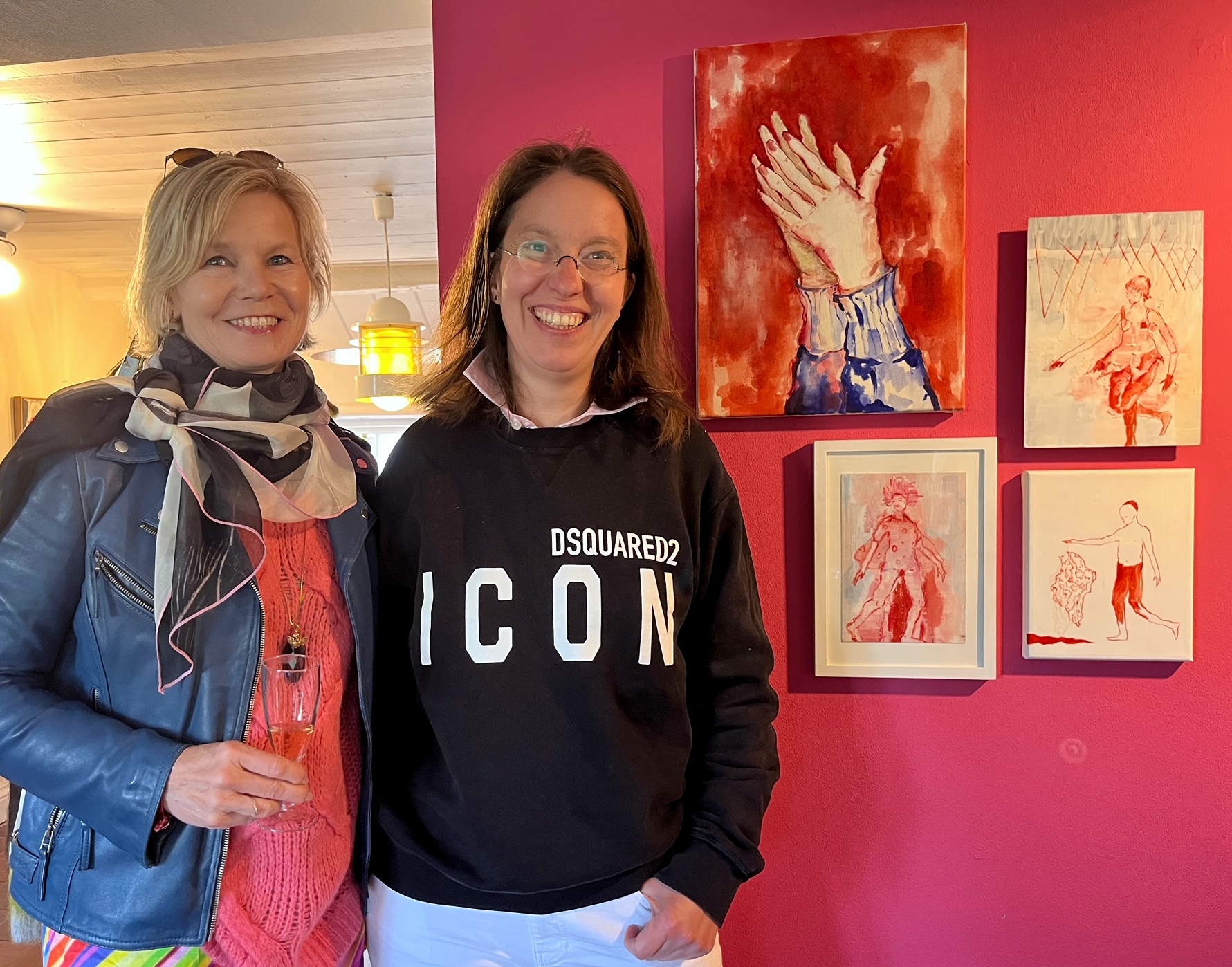 Am Ende kommt noch Madame La Petite vorbei, gerade eingeflogen aus Genf vom Treffen der World Health Assembly mit 194 Mitgliedsstaaten. Gemeinsam sitzen die beiden auf dem roten Sofa, dahinter “Hartmut im Salz”, 2018 (€ 1.200) und “Ruhen”, 2020 (€ 1.500).