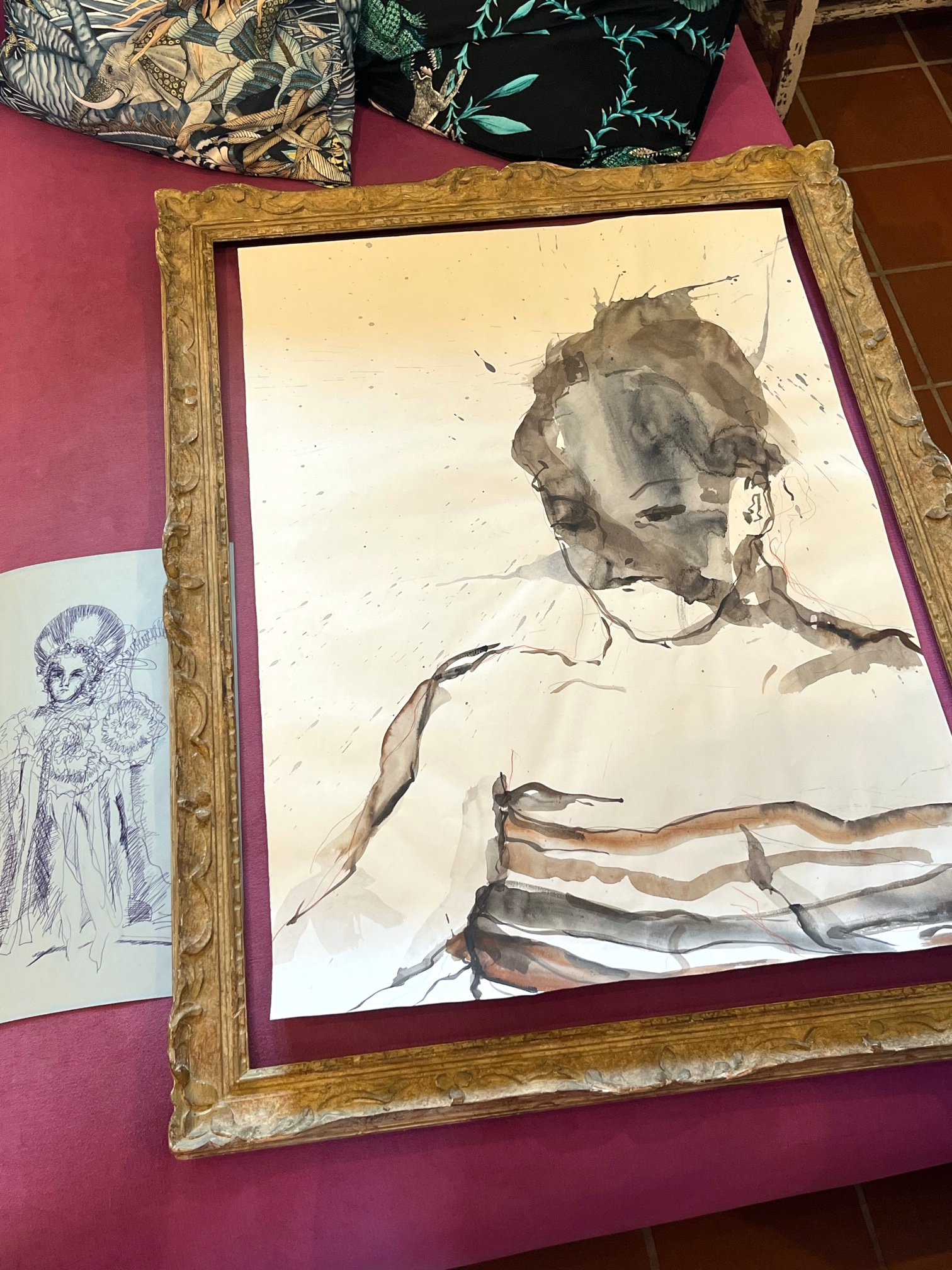 Auf der pinkfarbenen Ottomane von Paola Lenti liegen ausgebreitet ein paar Zeichnungen, die sie mitgebracht hat. Spontan lege ich einen alten Rahmen darüber, zu viert stehen wir darum, und das Porträt einer Frau beginnt zu erzählen. Leicht ist der Tuschestrich, huscht über die Fläche und taucht ein in das unbekannte Innere.