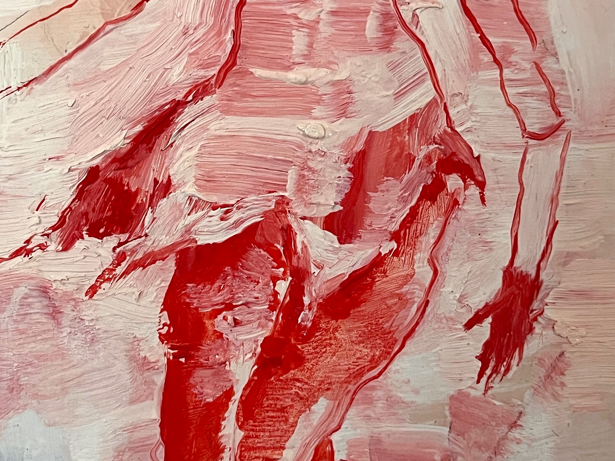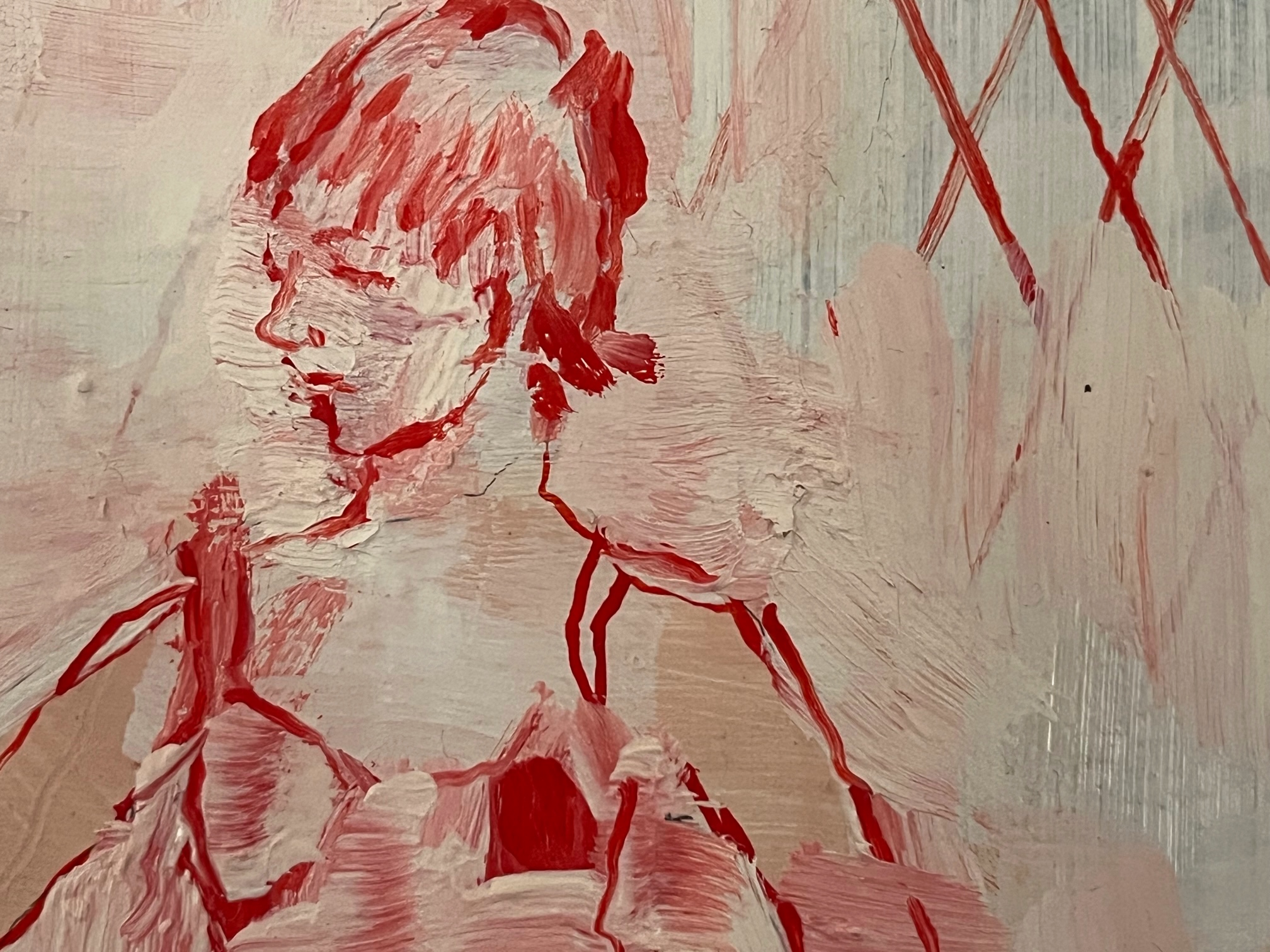 Die ständigen Übermalungen, die eine Dynamik herstellen, Bewegung und Raum schaffen, wo sonst der reale Raum eleminiert wurde, die Farben sich reduzieren auf rot und weiß. Fehler werden nicht kaschiert, sondern addieren sich zu einer suchenden Komplexität.