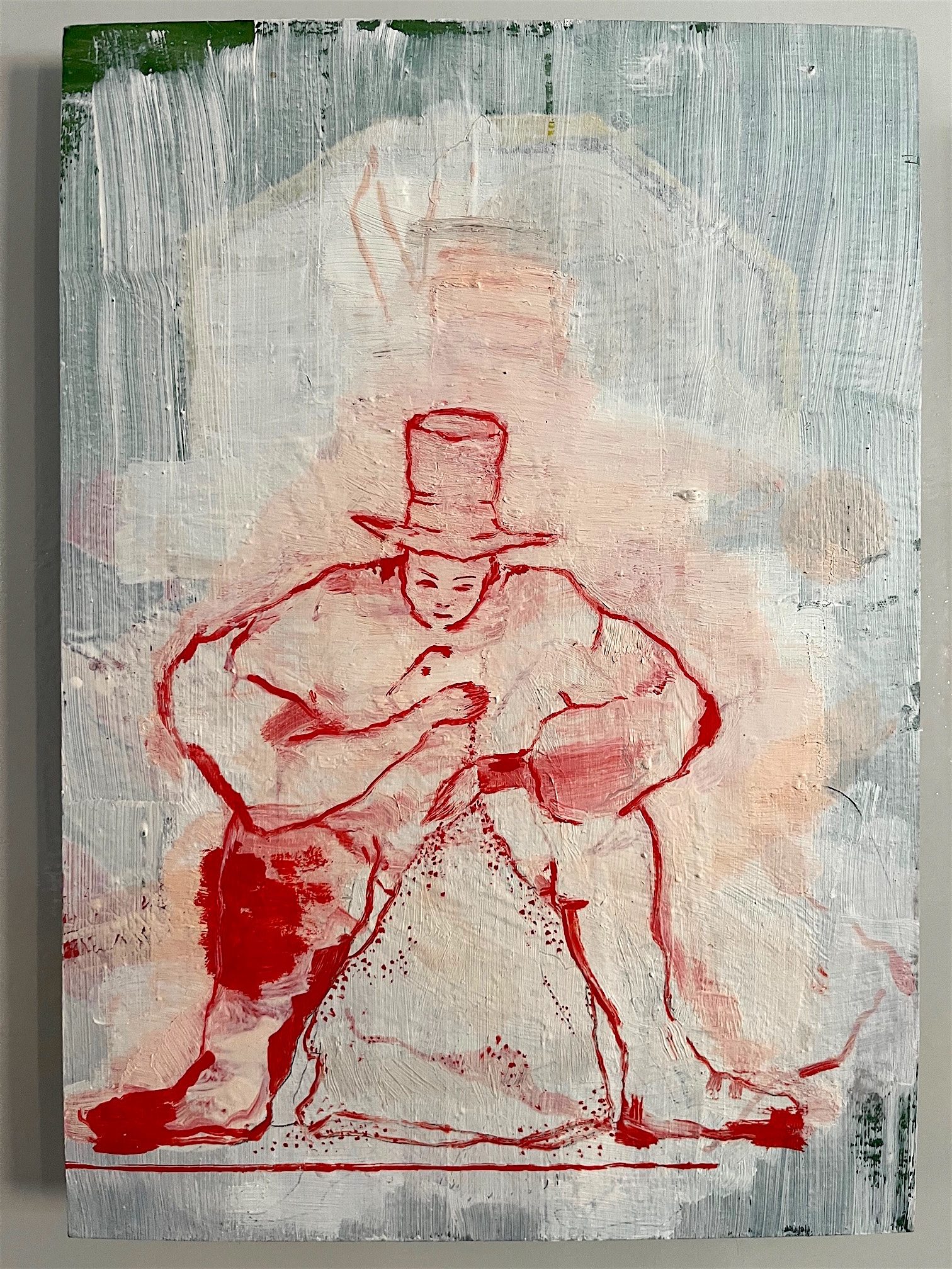 Ein Foto vor der Wand, “ihrer” Wand, in der sich die vier Bilder “beheimatet” haben: “Bravo Ladies”, “Blütenkelch”, “Pinkeln” und “Salzzauber”, allesamt von 2020, der Coronazeit, die für sie ein anstrengender Rückzug bedeutete, eine vielfache Inanspruchnahme zu Hause. Es sind Arbeiten von ganz besonderer Intensität entstanden.