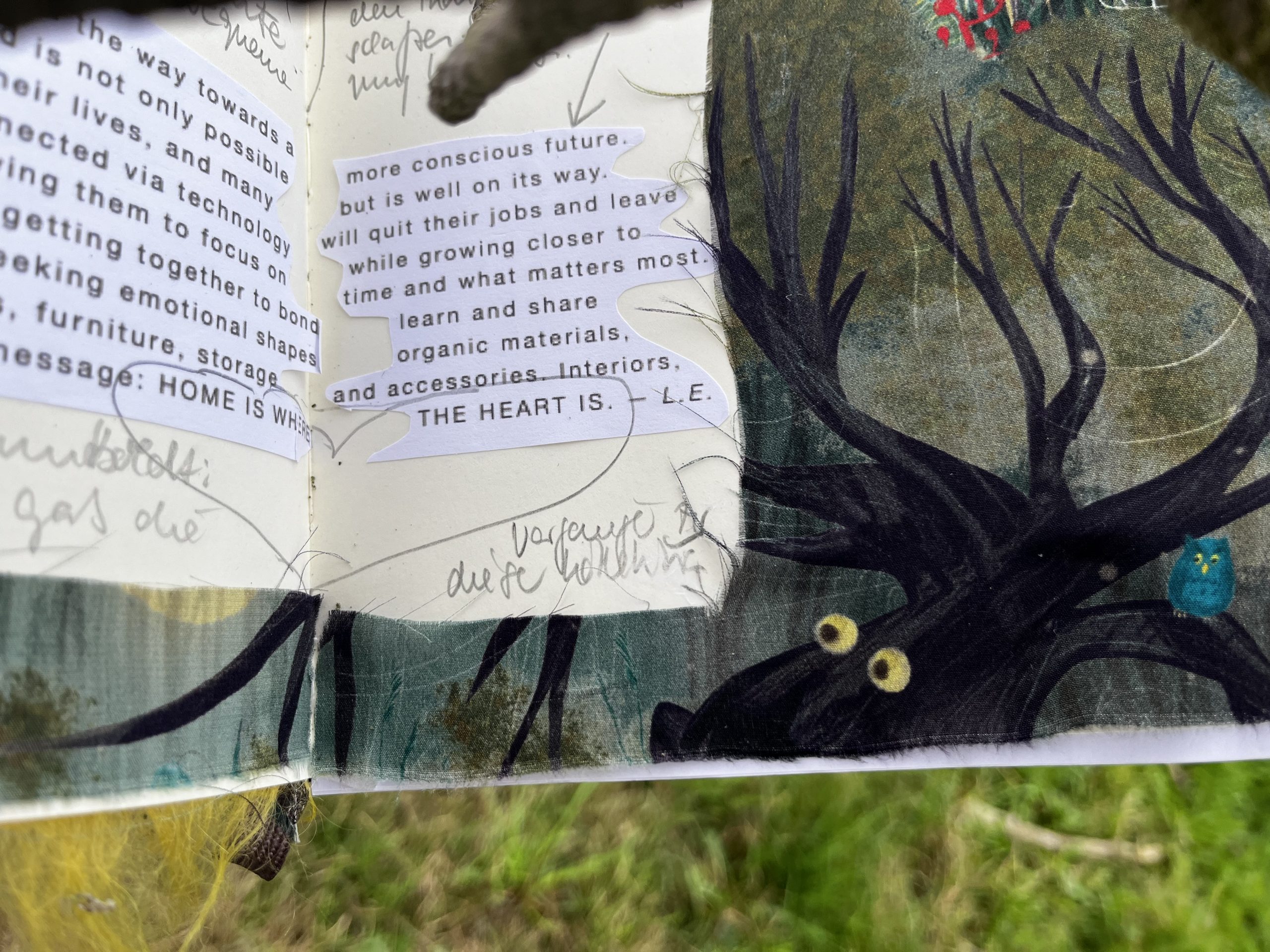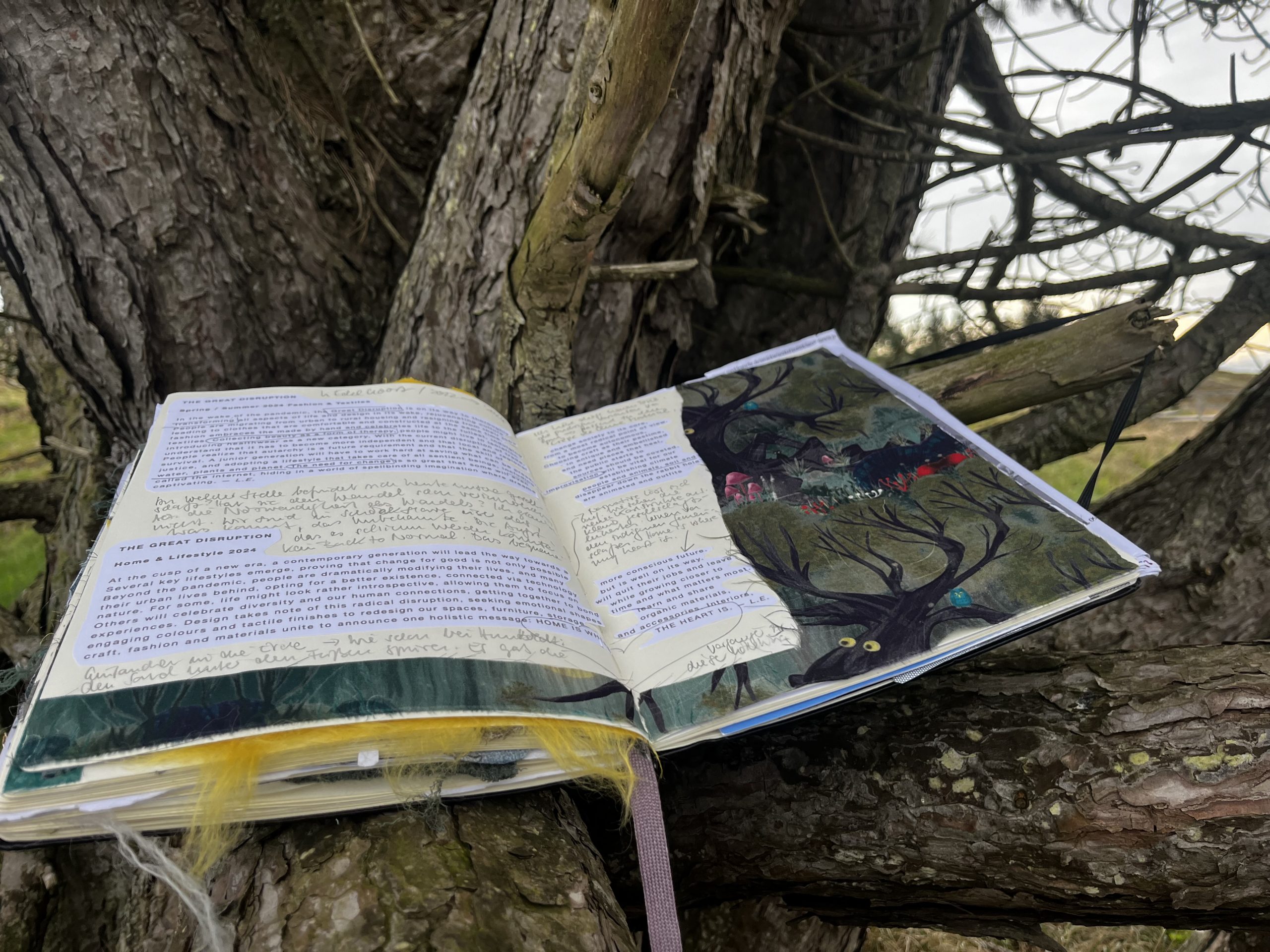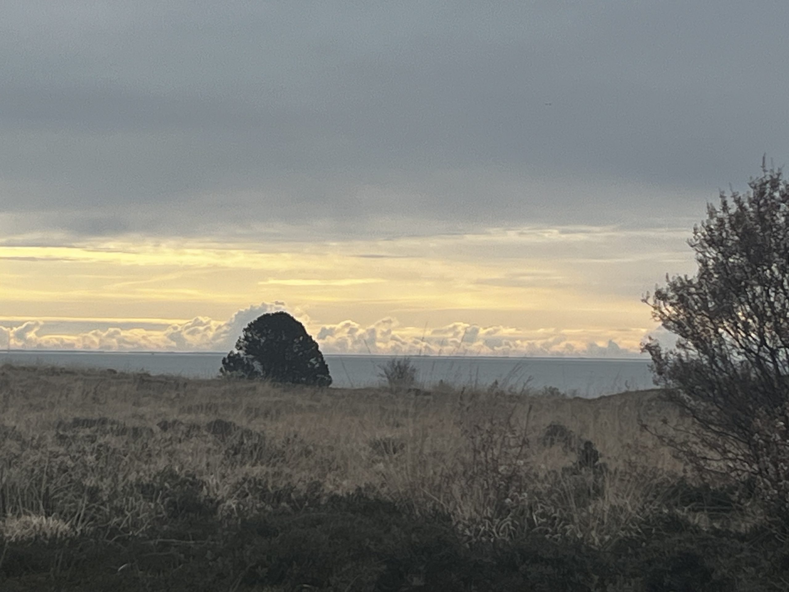 Die Sonne geht gerade auf über dem Wattenmeer. Ich gehe über die “Feenwiese” runter zu dem nun schon bekannten Baum, meinem neuen Lieblingsmotiv. Im Kopf und unter dem Arm das Skizzenbuch mit dem Zukunftsbericht, überschrieben mit “The Great Disruption”. Übersetzt als: Umbruch, Diskontinuität, Riss.