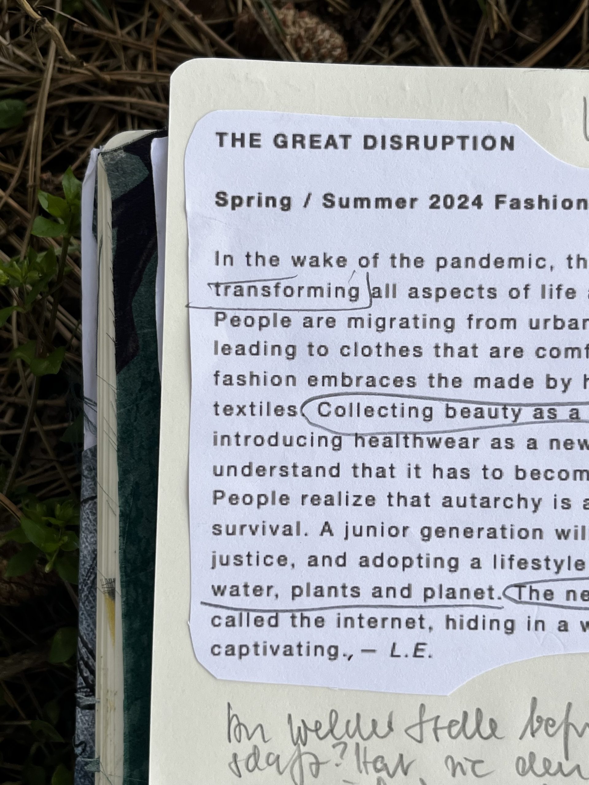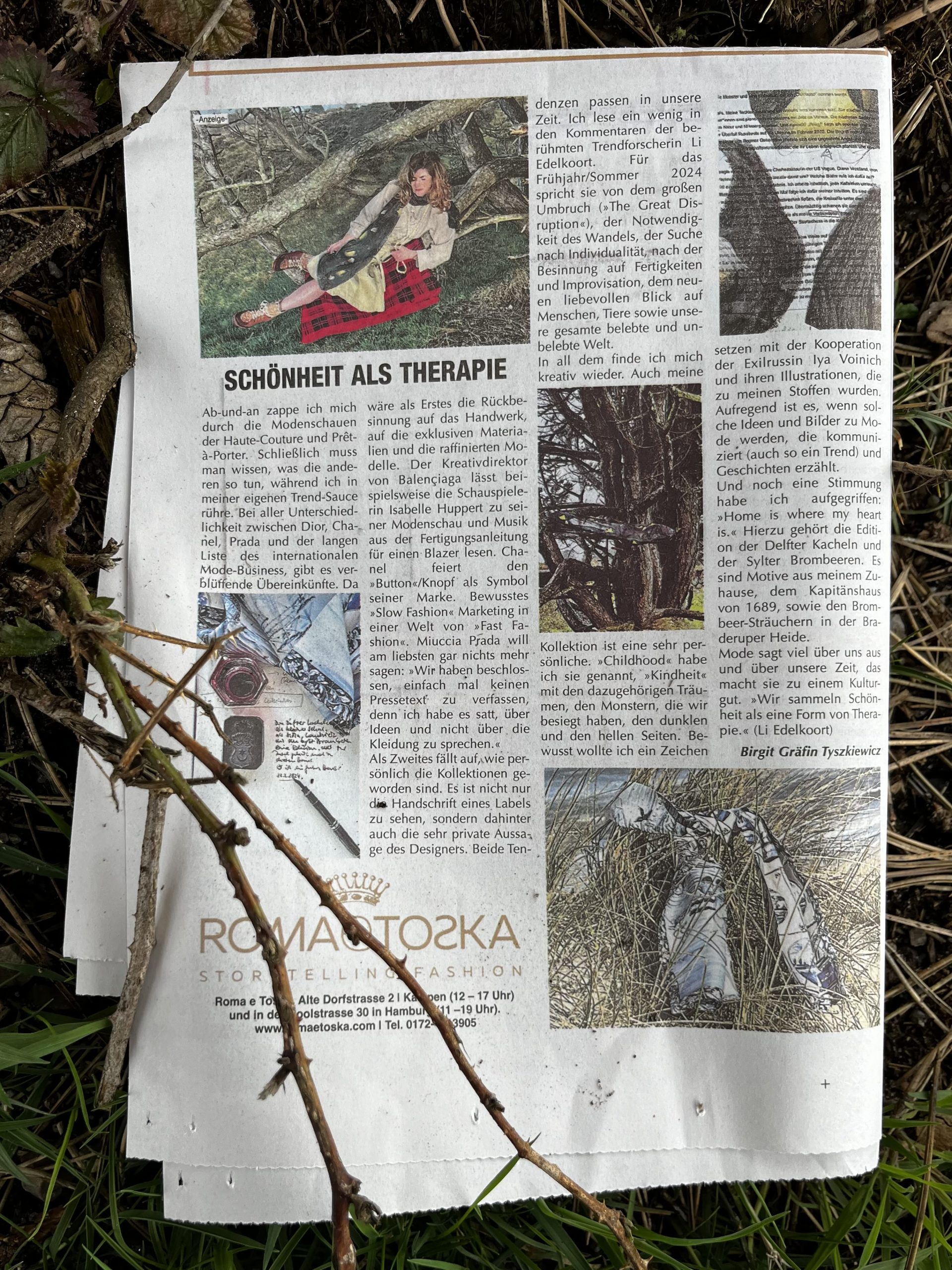 Die Veränderungen werden uns alle (!) erreichen und alle (!) Aspekte unseres Lebens, unserer Kultur, unseres Zuhause bis hin zu unserem Verständnis von Design und Mode erfassen. “Collecting Beauty” als eine Lösung auf dem Weg zu sich selbst und einem neuen Miteinander? “Natur muss gefühlt werden”, wie ich es zum Motto 2023 machte. Wieder Kind werden mit der Fähigkeit, in allem eine Seele zu finden. Mein Frühjahr/Sommer 2024.
