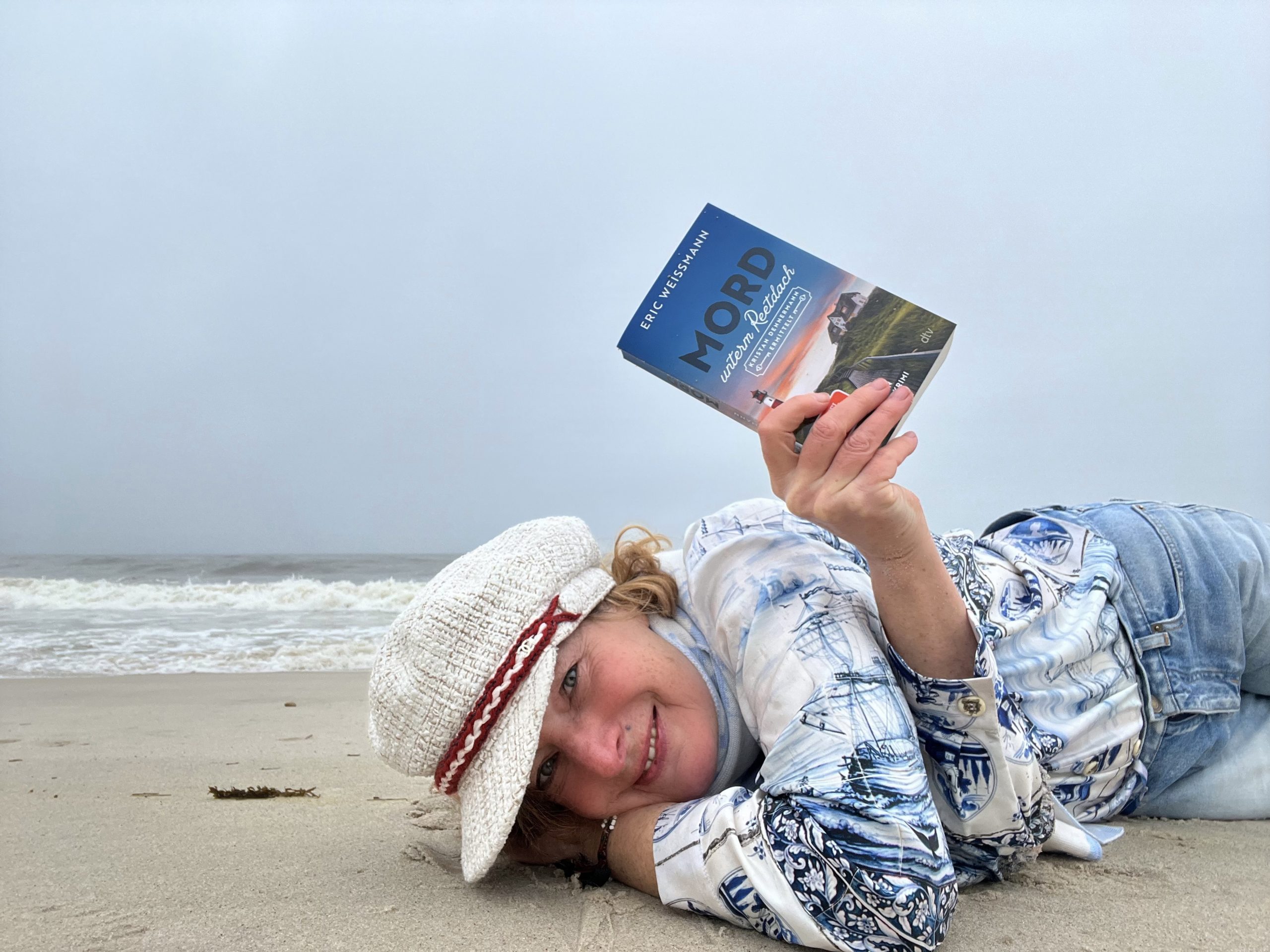 Ein verblichenes Foto, eine Frau am Strand mit Kachelbluse, Jeans, Chanel-Kappe und einem Buch, das es noch nicht gibt. Hey, it’s me! Die Lektüre ist von Spiegel-Bestseller-Autor-Makler Eric Weißmann und erscheint in 12 Tagen: