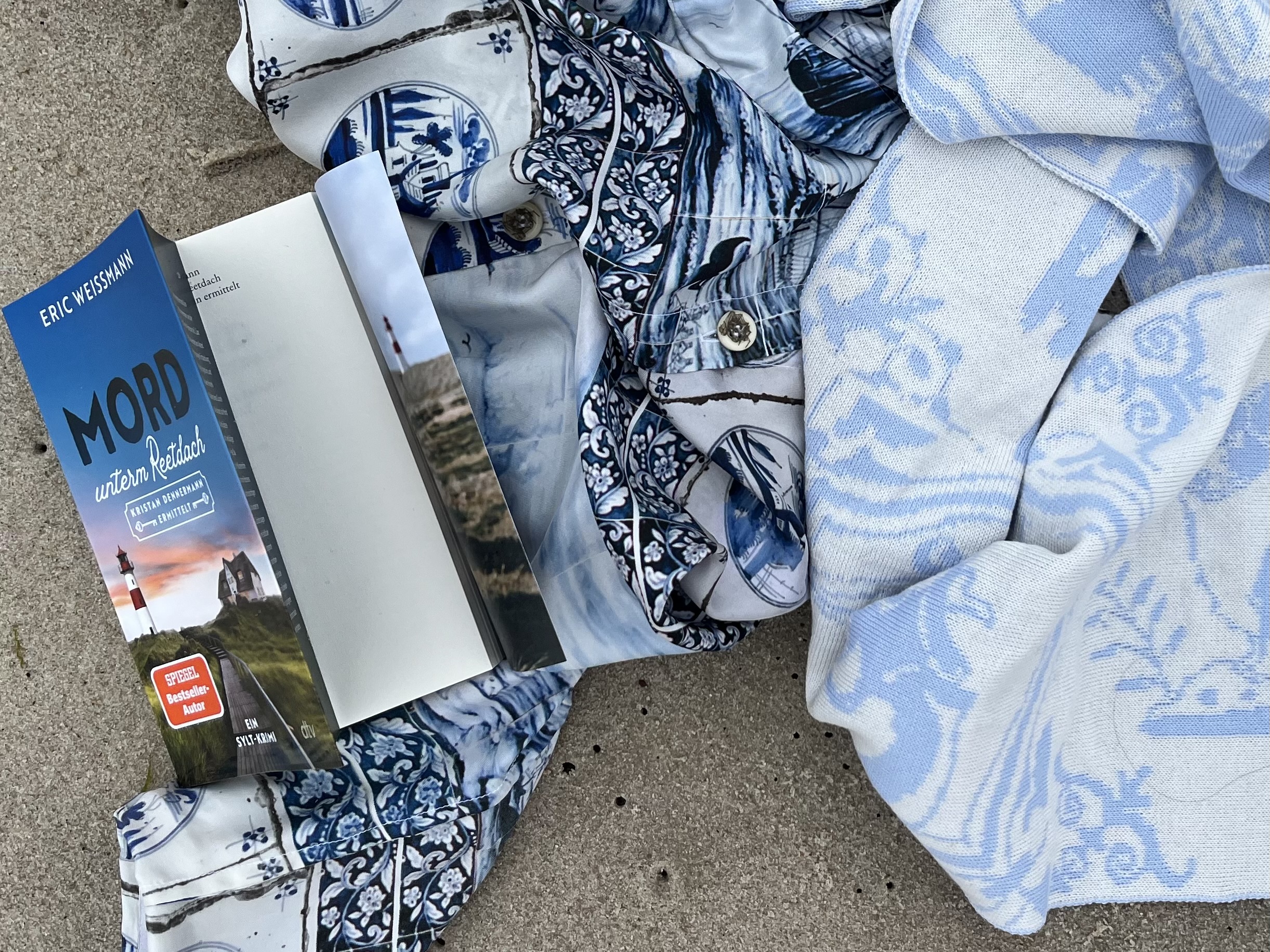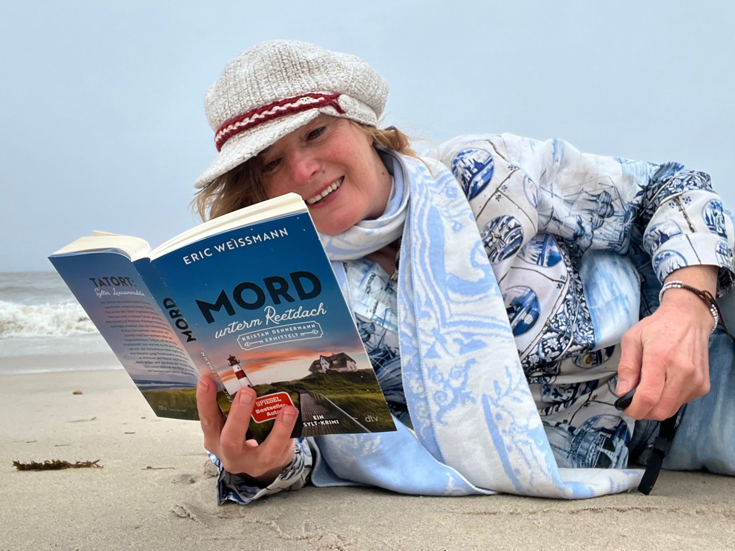 Um den Hals trage ich den Krimischal in Hellblau, ein Einzelstück. Wer ihn warm und erzählerisch um die Schultern legen möchte (€ 298), der kauft ihn ganz schnell (info@romaetoska.de). Das Buch dazu gibt es signiert in zwei Wochen: “Tatort Luxus Immobilie”. Ich schmökere schon mal ein wenig weiter, bis Mitternacht mein Licht unter dem Reetdach ausgeht.