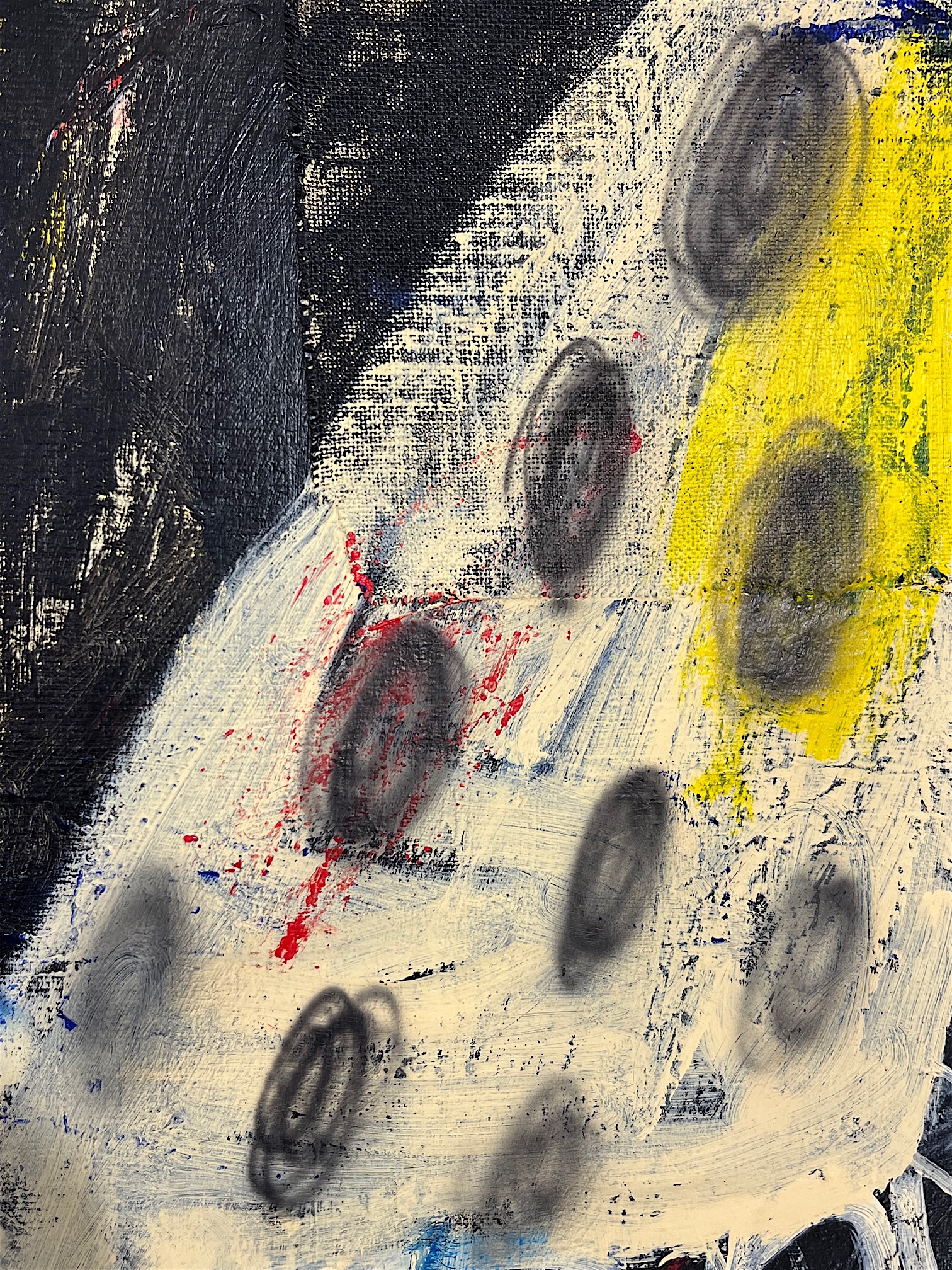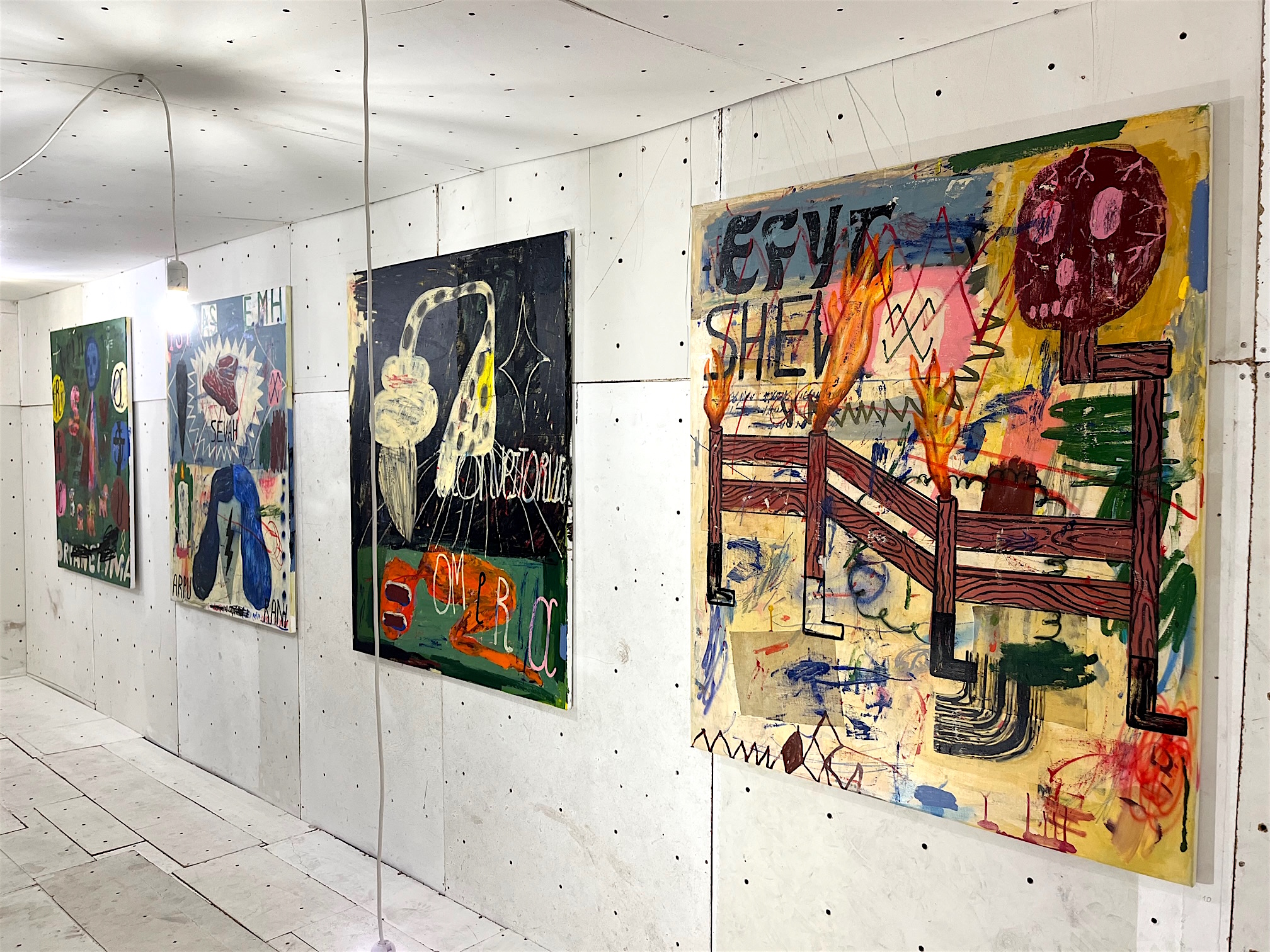 Die Arbeiten hängen im Keller der Galerie. Die geweißten und gelöchterten Holzplatten stammen noch von Simon Hehemann. Der Raum wirkt gedrungen, dumpf und ein wenig beengt, aber das scheint gerade richtig für diese Werke, die an Streetart erinnern, als wären sie Ausschnitte aus einer viel größeren Wandfläche in einem U-Bahn Tunnel, hastig gemalt in neobeleuchteten Treppenaufgängen, durch die Menschen in Mänteln mit Taschen hasten. Kunst im Rohzustand.