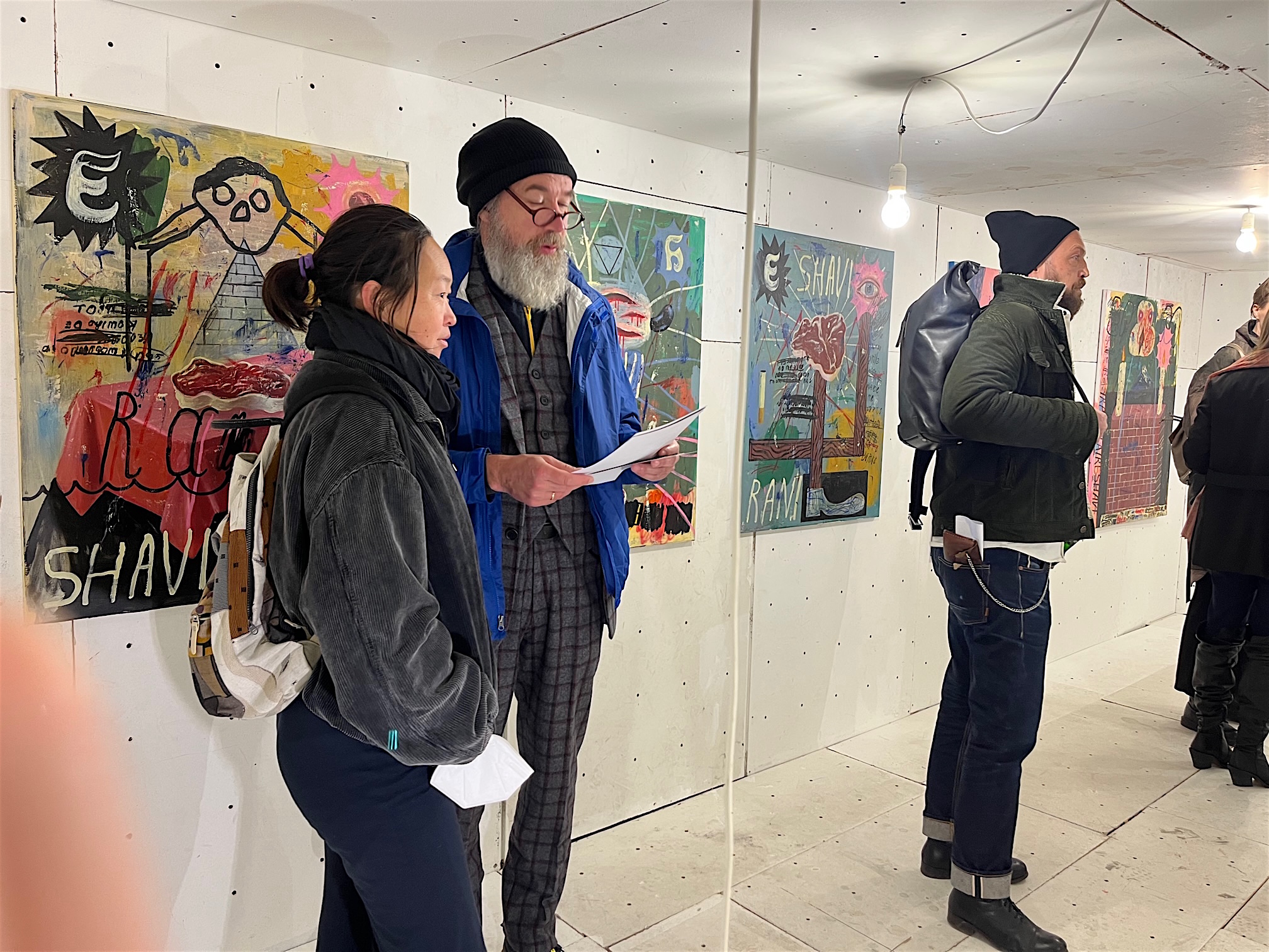Während wir dastehen, füllt sich der Raum mehr und mehr. Ein Bild wird verkauft, das erste in seinem Leben. Ich bin selbst ein wenig aufgeregt, die neue Besitzerin neben mir mindestens doppelt so sehr. Taco’s Freundin steht ein wenig abseits und strahlt, sie ist nun die “Breadwinnerin”, die Künstlergattin, die ihm den Rücken freihält. Sie möchte nicht mit auf’s Bild.
