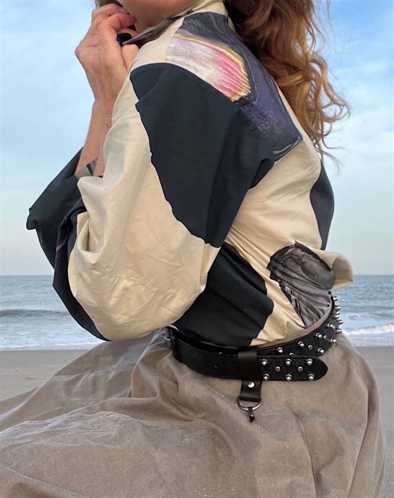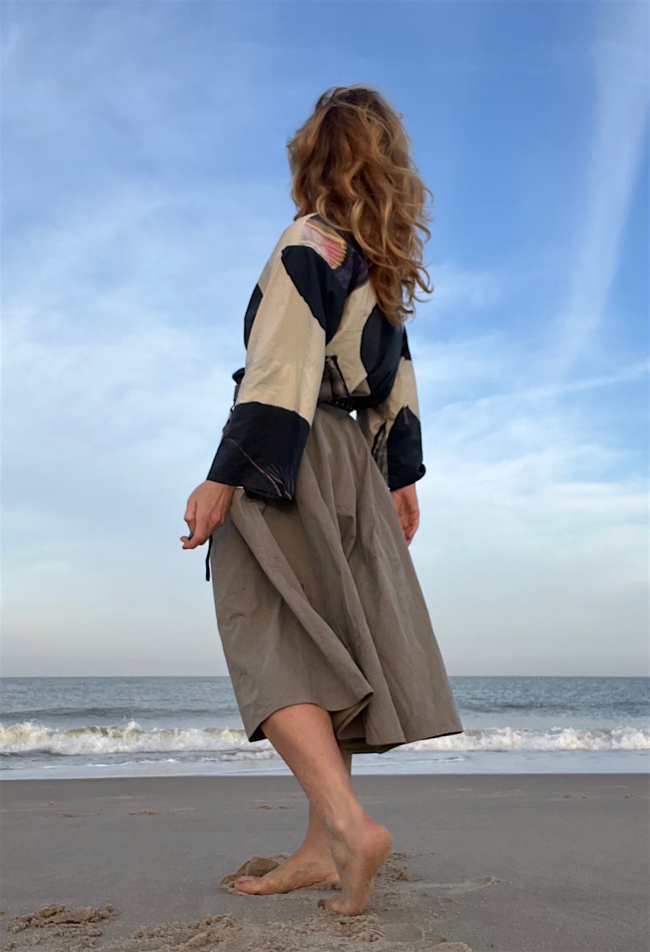 Nun ist sie endlich da, die Muschelbluse aus Baumwolle, geschnitten als Kimono. Großflächig verteilen sich die Objekte aus dem graphischen Werk von Alexander von Humboldt (1769 – 1859) über die gesamte Fläche. Jede Bluse ist eigenwillig anders in ihrem Musterverlauf. Mir gefällt die neue Strenge, das understatement Beige, die Trendfarbe “nude wool”. Lässig krempele ich die Ärmel ein wenig hoch.