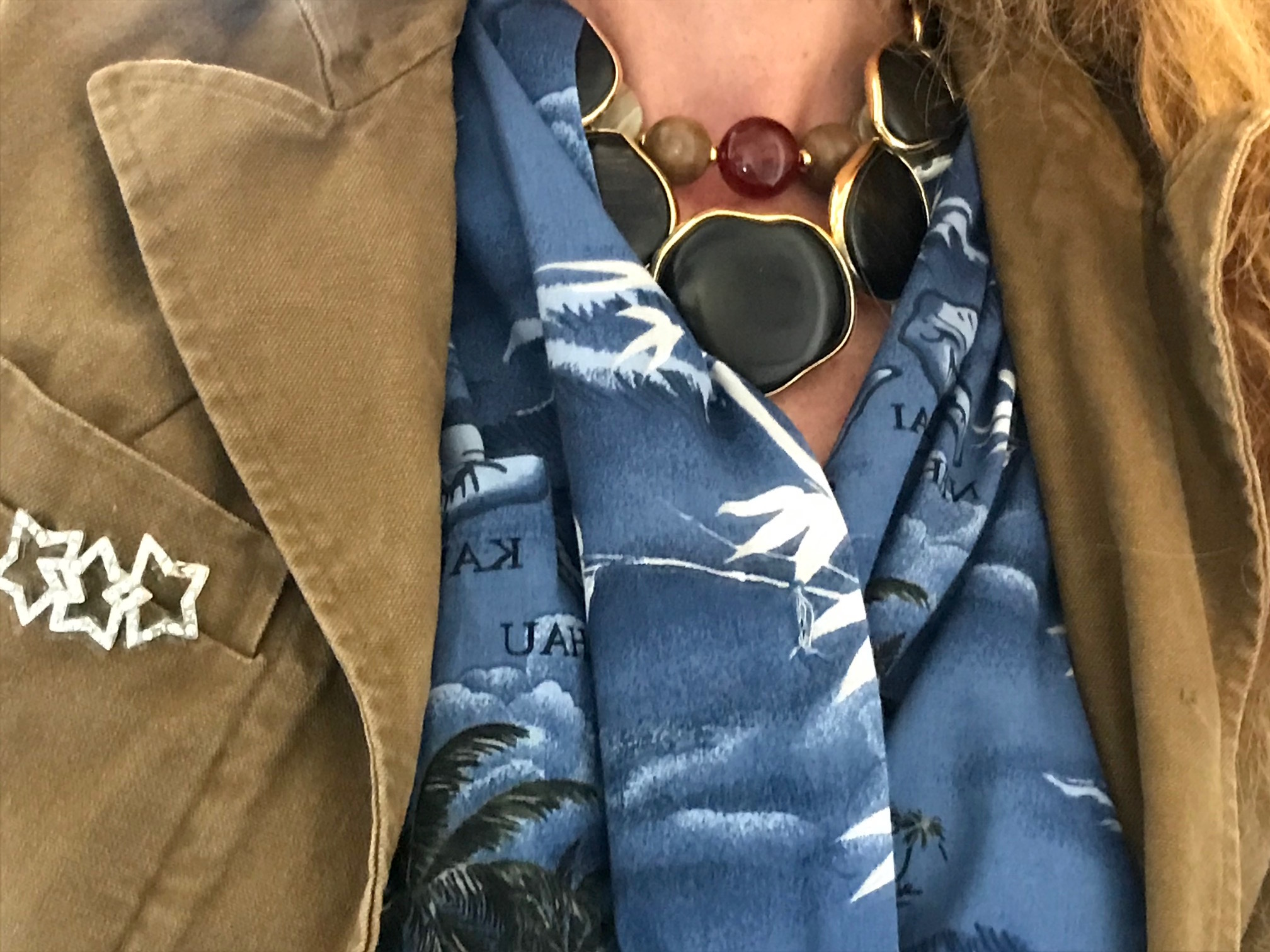 Abb: Alter Prada Blazer (geschenkt bekommen, Danke!), Brosche Yves Saint Laurent, Hawaii Hemd (€ 149).