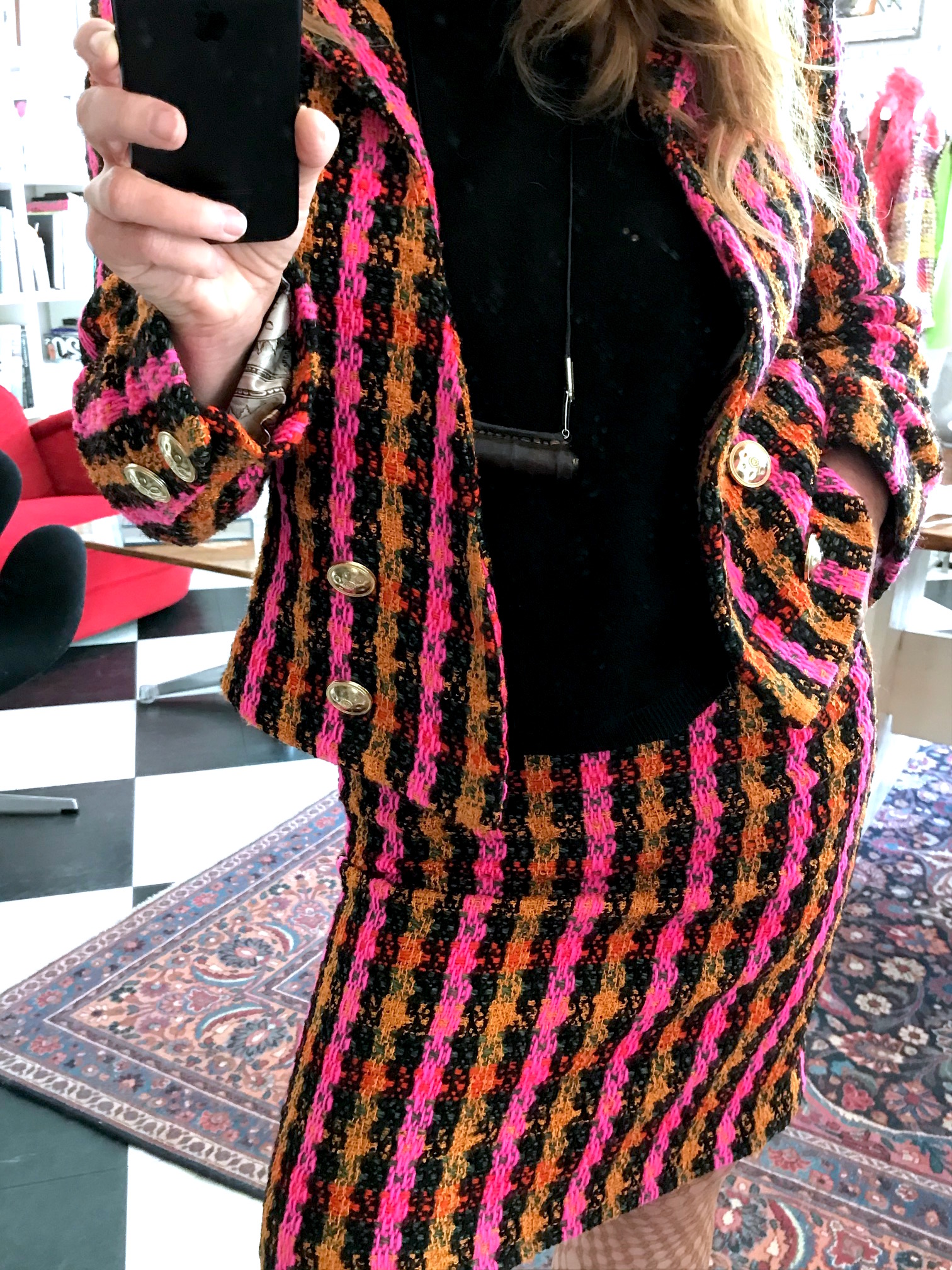 Abb: Bouclé Jacke pink (798), Etui Rock pink (€ 498), Day-and-Night Pullover (€398)