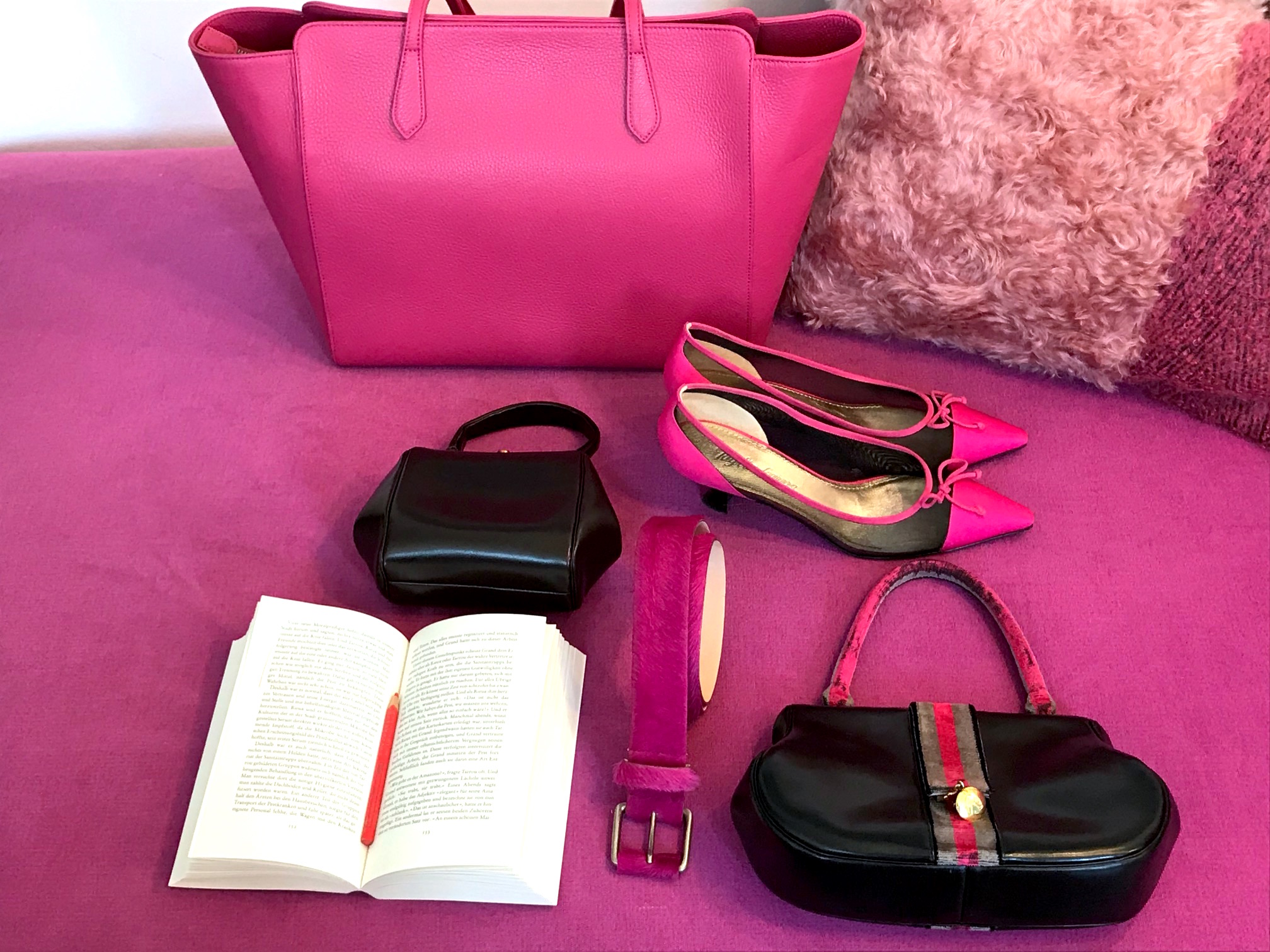 Abb: Vintage Taschen Roberta (je €650), Schuhe Taglia Scarpe (€ 390), Umhänge-Tasche Taglia Scarpe (€540), Fellgürtel pink (€ 198)