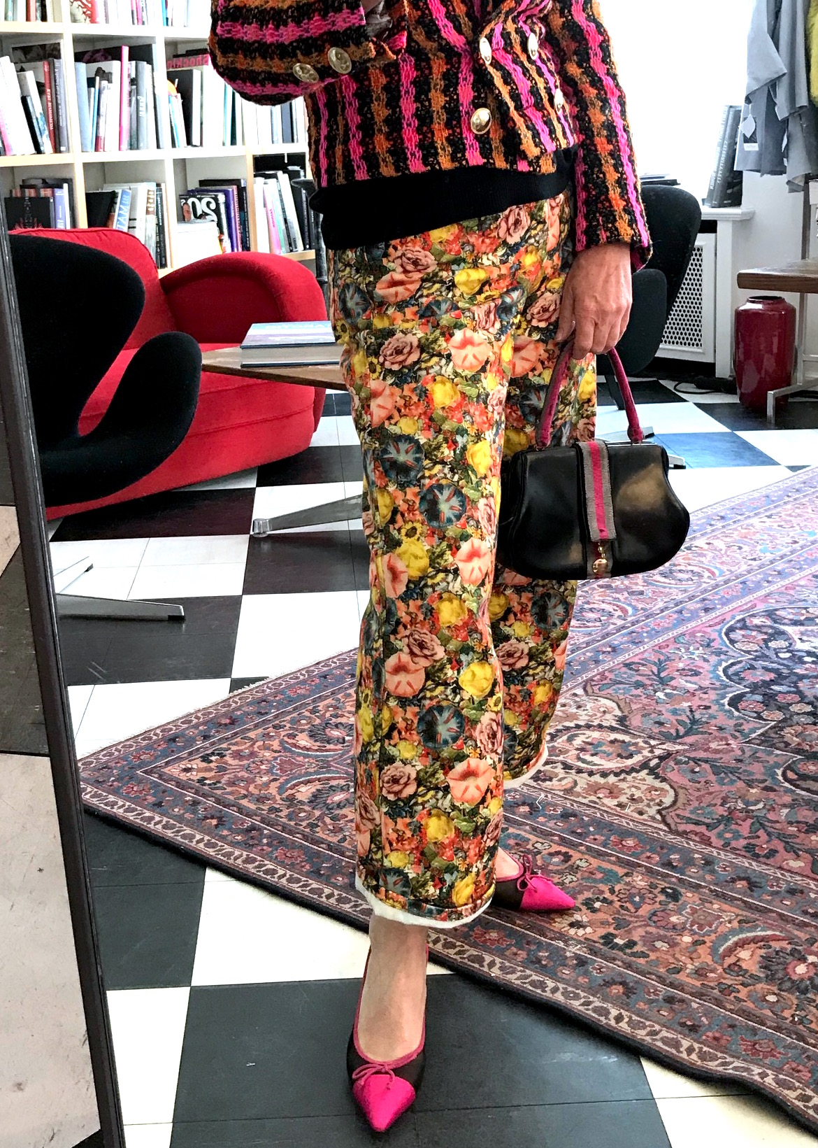 Abb: Bouclé Jacke pink (€ 798), Day-and-Night Pullover schwarz (€ 398), Schuhe Taglia Scarpe (€390), Tasche Roberta (€ 650), Marni Hose privat