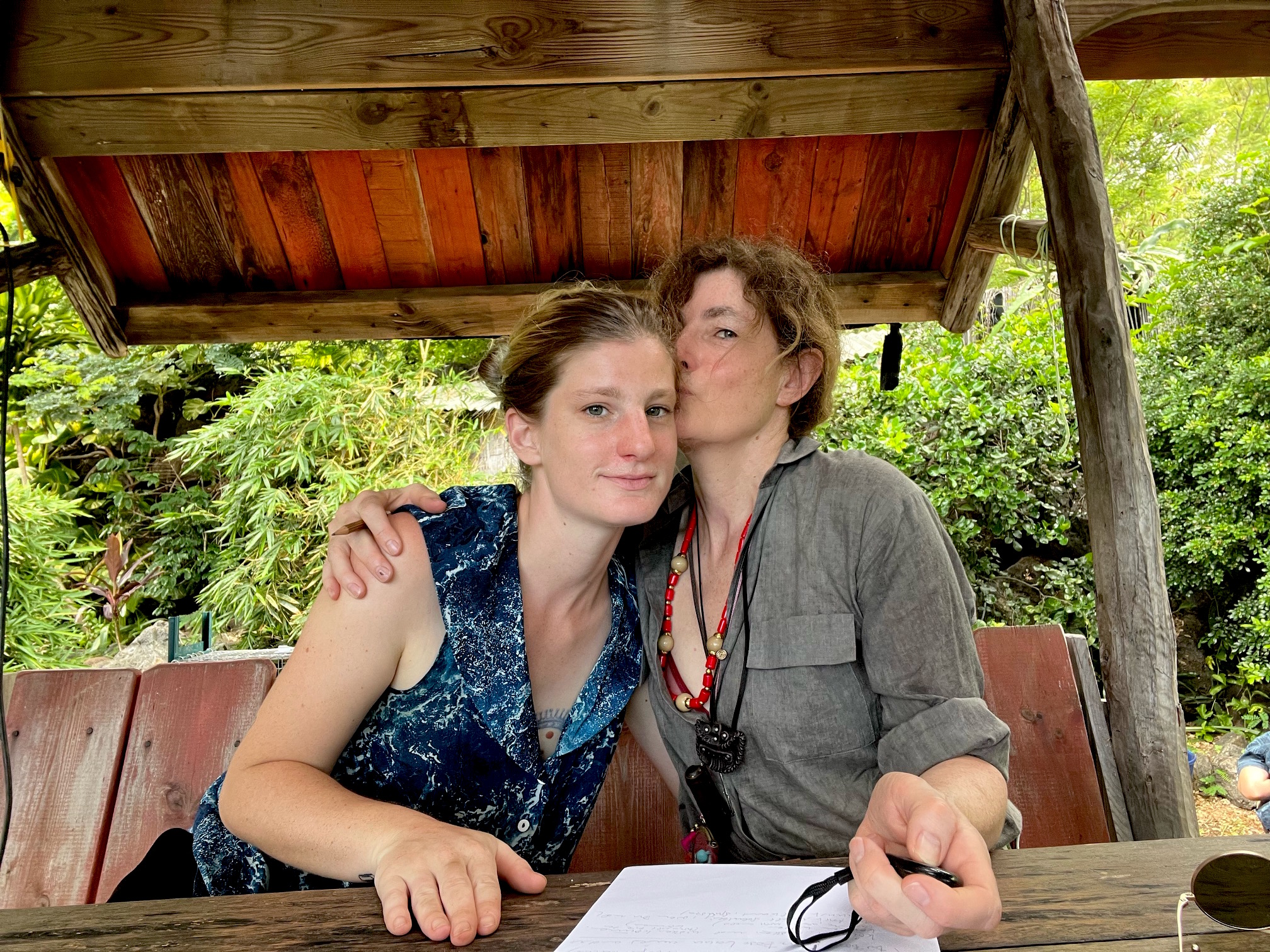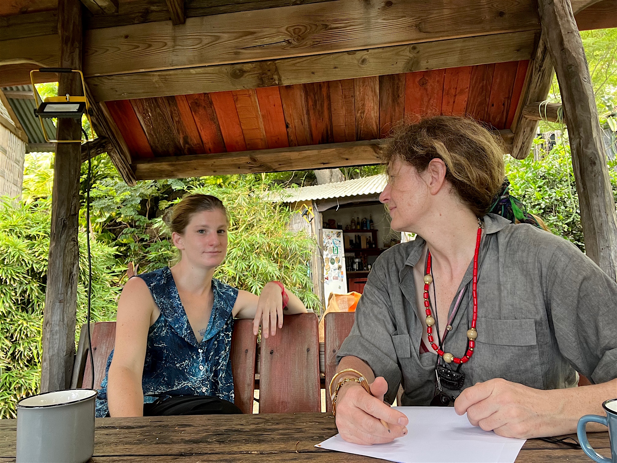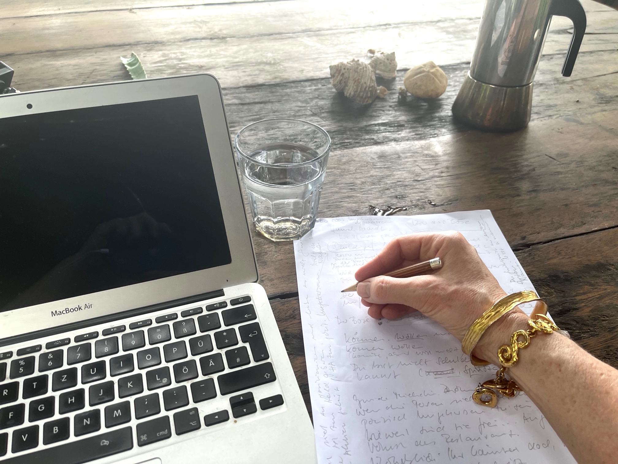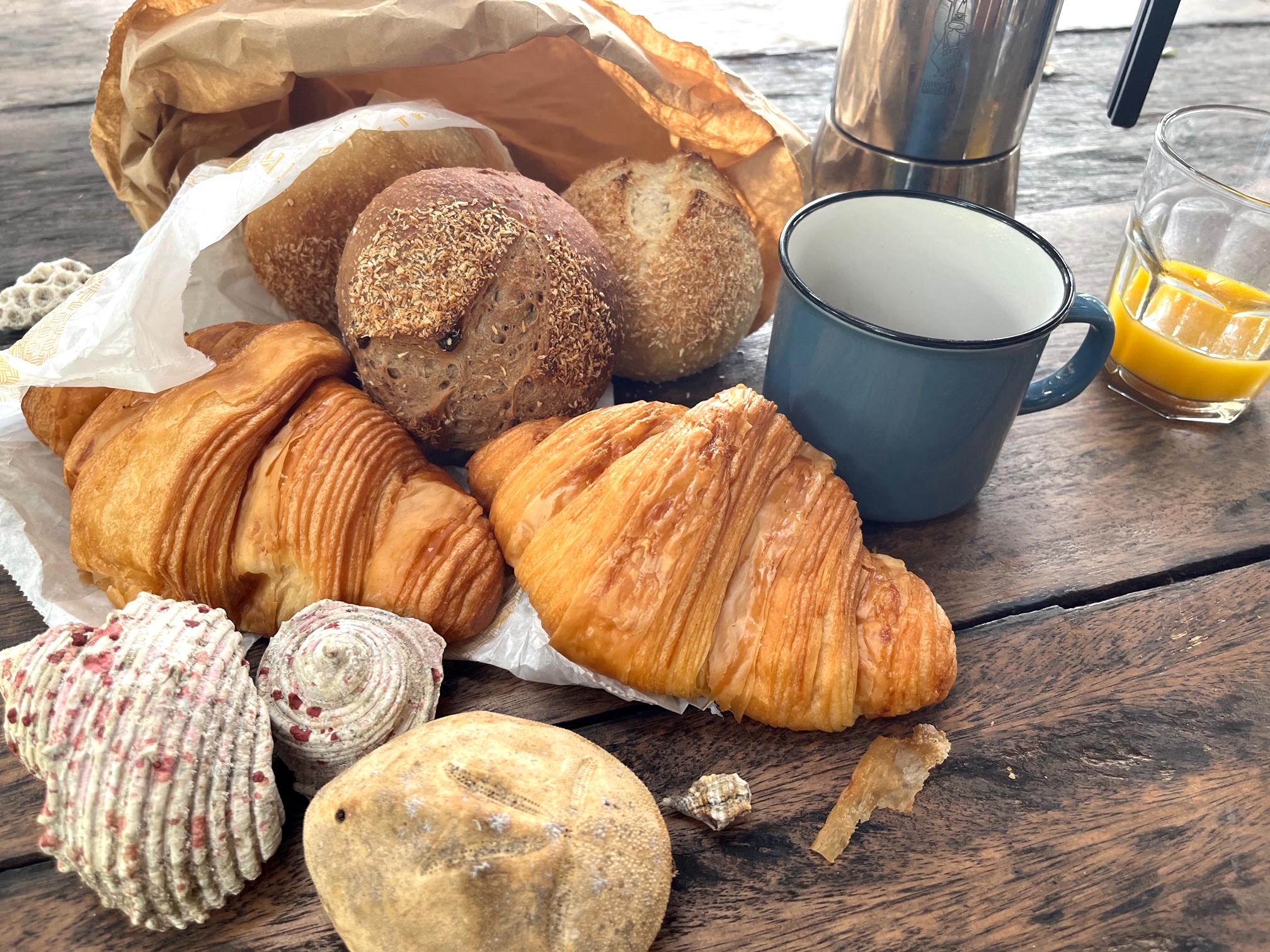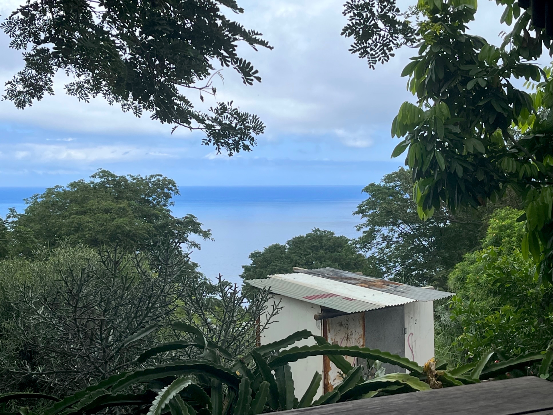 Der Ort für unsere Unterhaltung: Der Frühstückstisch von Romas “Bungalow” mit Blick über das Meer von Saint Leu (La Réunion). Es gibt kein Paradies ohne Gedanken an die Menschen 8.000 Kilometer entfernt in der Ukraine.