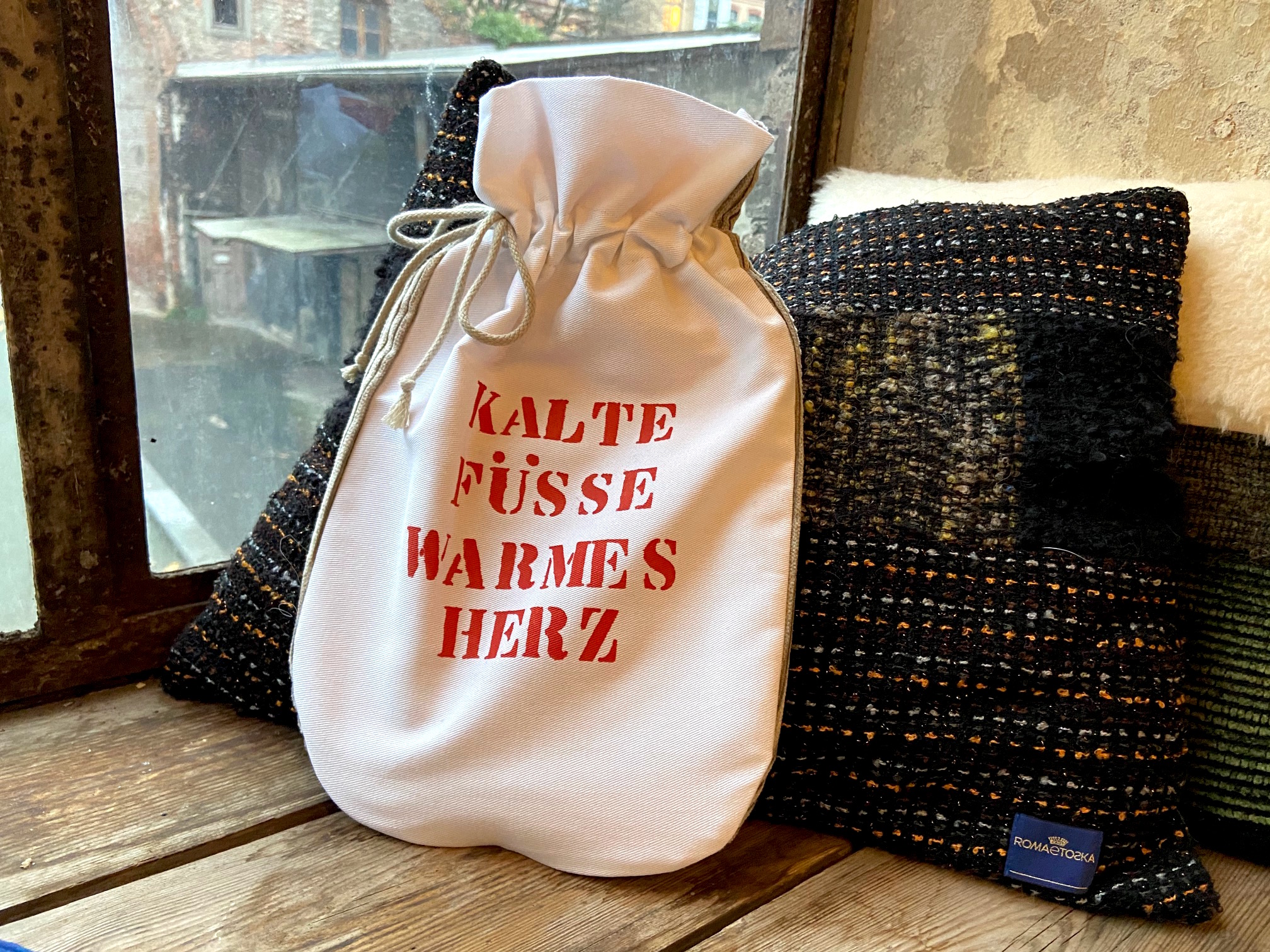 Abb: Wärmflasche mit Slogan (€98), Kissen ohne Fell (€140) und mit Fell (€160)