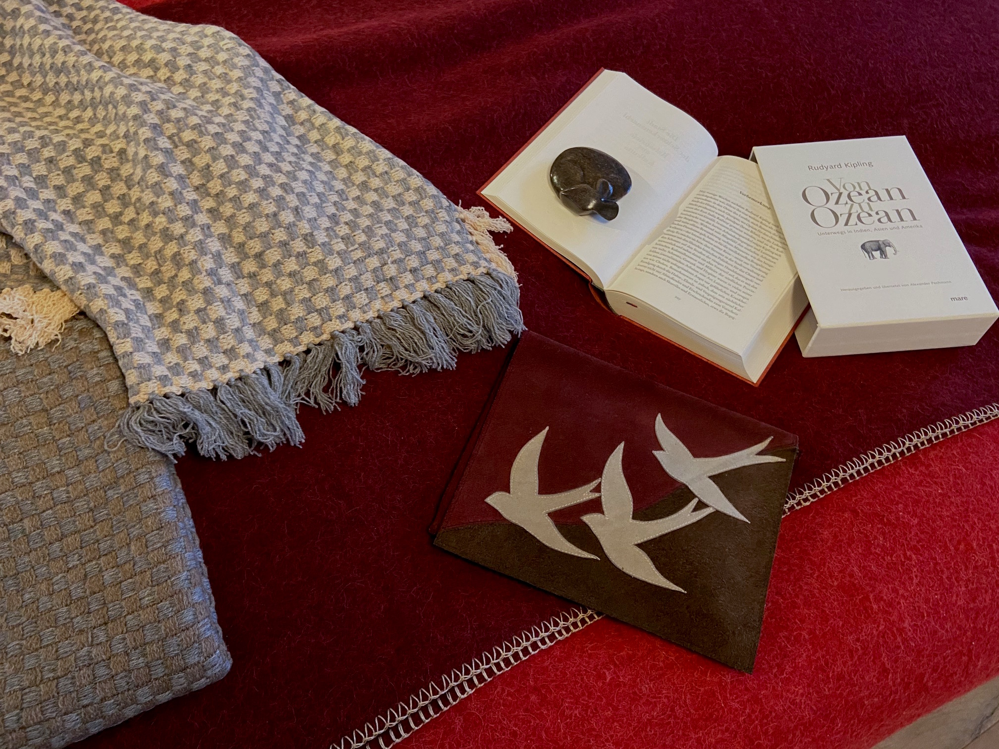 Abb: Cashmere Plaid taube-grau und beige-grau (€ 498), Vintage Yves Saint Laurent Clutch (780), Wolldecken rot und dunkelrot (€ 194).