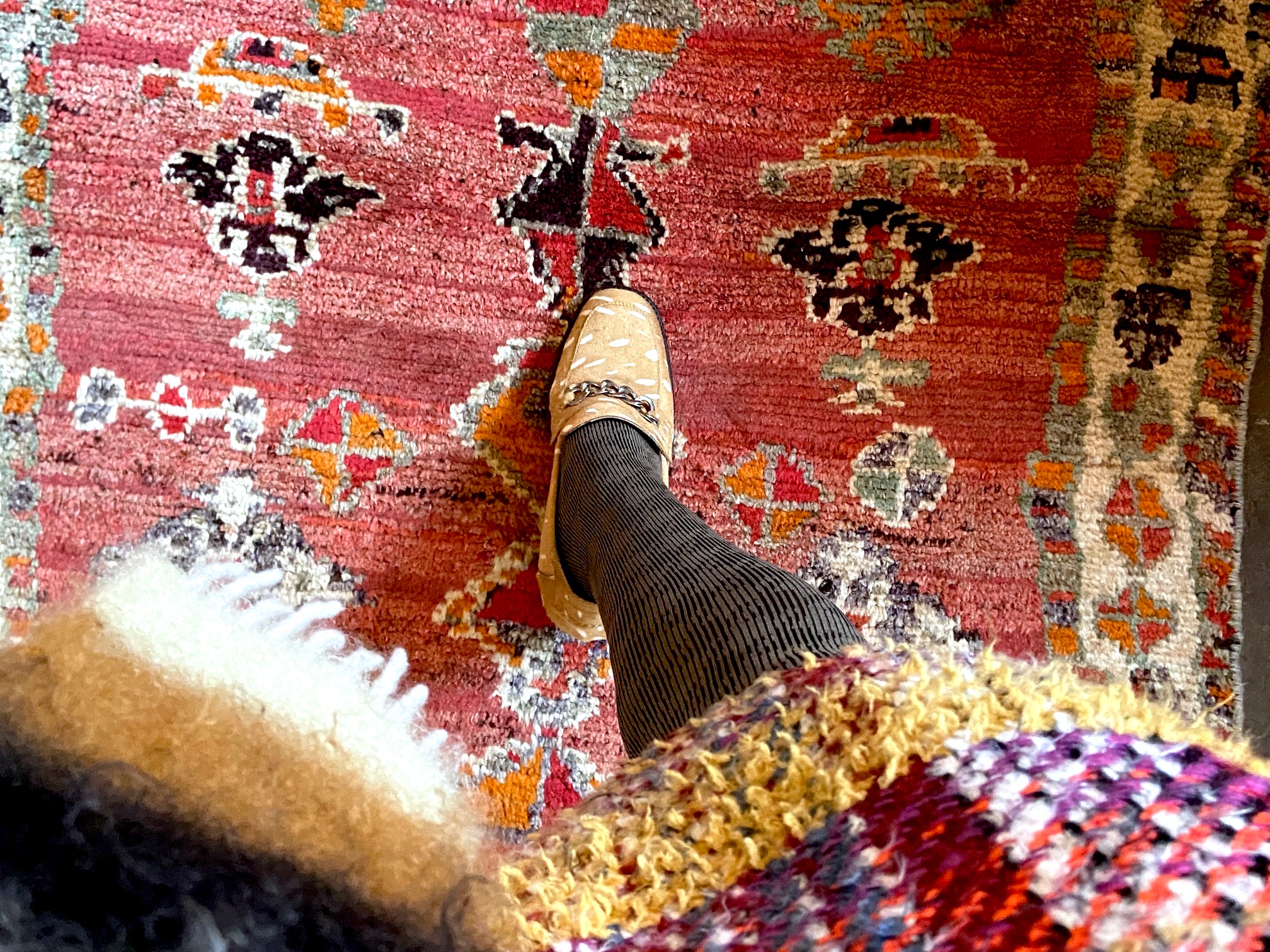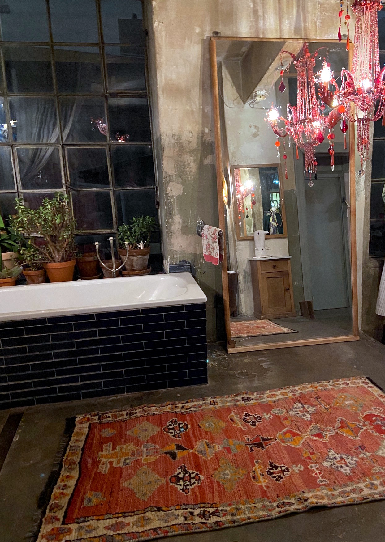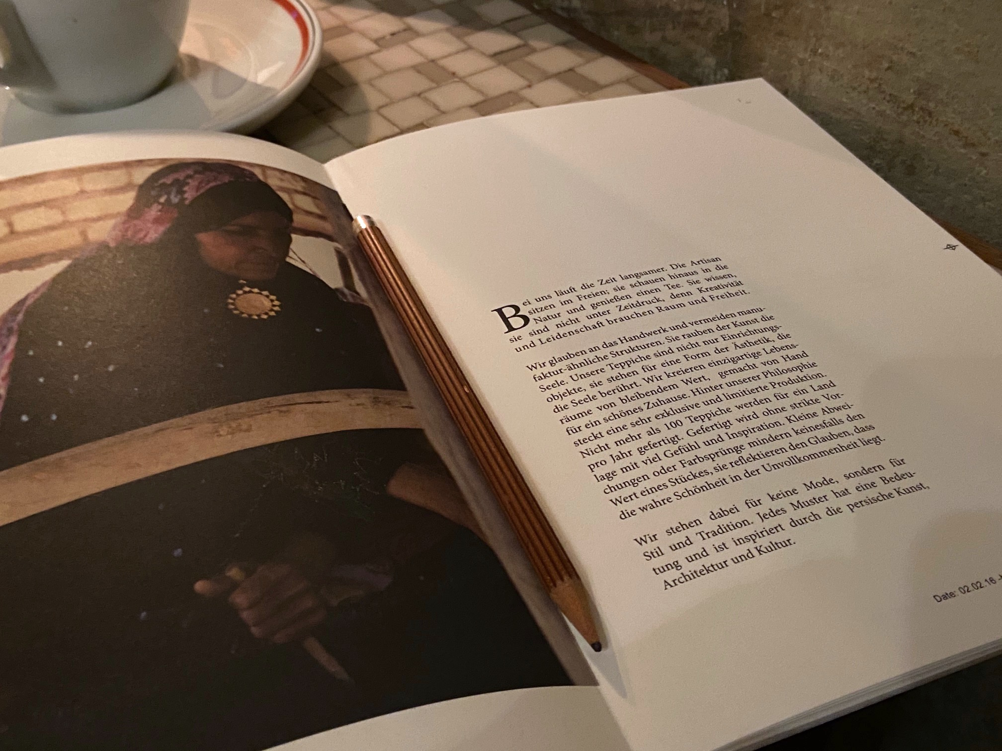 Es ist früh morgens und ich sitze an dem kleinen Esstisch im Tempel und frühstücke, sehr Bohemien. Klo, Badewanne und Ruine im Blick. Ein wenig fühle ich mich wie eine Nomadin zwischen Zeiten und Welten, nicht schwer an diesem außergewöhnlichen Ort und mit meinem Leben, wie es gerade ist. Während ich an meinem etwas angetrockneten Brot knabbere, lese ich über Lila Valadan, der Perserin, mit ihrer außergewöhnlichen Kollektion von alten und eigen-produzierten Teppichen.
