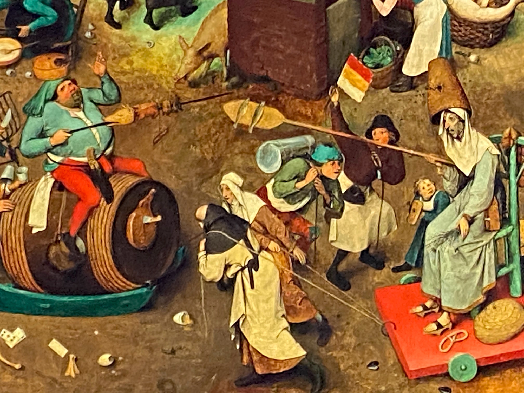 Endlich können wir sehen, wie der Künstler es sah, mit dieser Fülle an Details, die selbst noch mikroskopisch klein den ganzen Gehalt der Erzählung besitzen. Wir beginnen unsere Unterhaltung mit der Gruppe unten, die sich wie zu einem Gefecht aufgestellt hat: Prinz Karneval links, geschoben von den Narren, und Frau Fasten rechts, gezogen von zwei Nonnen. Spanferkel gegen Fisch.